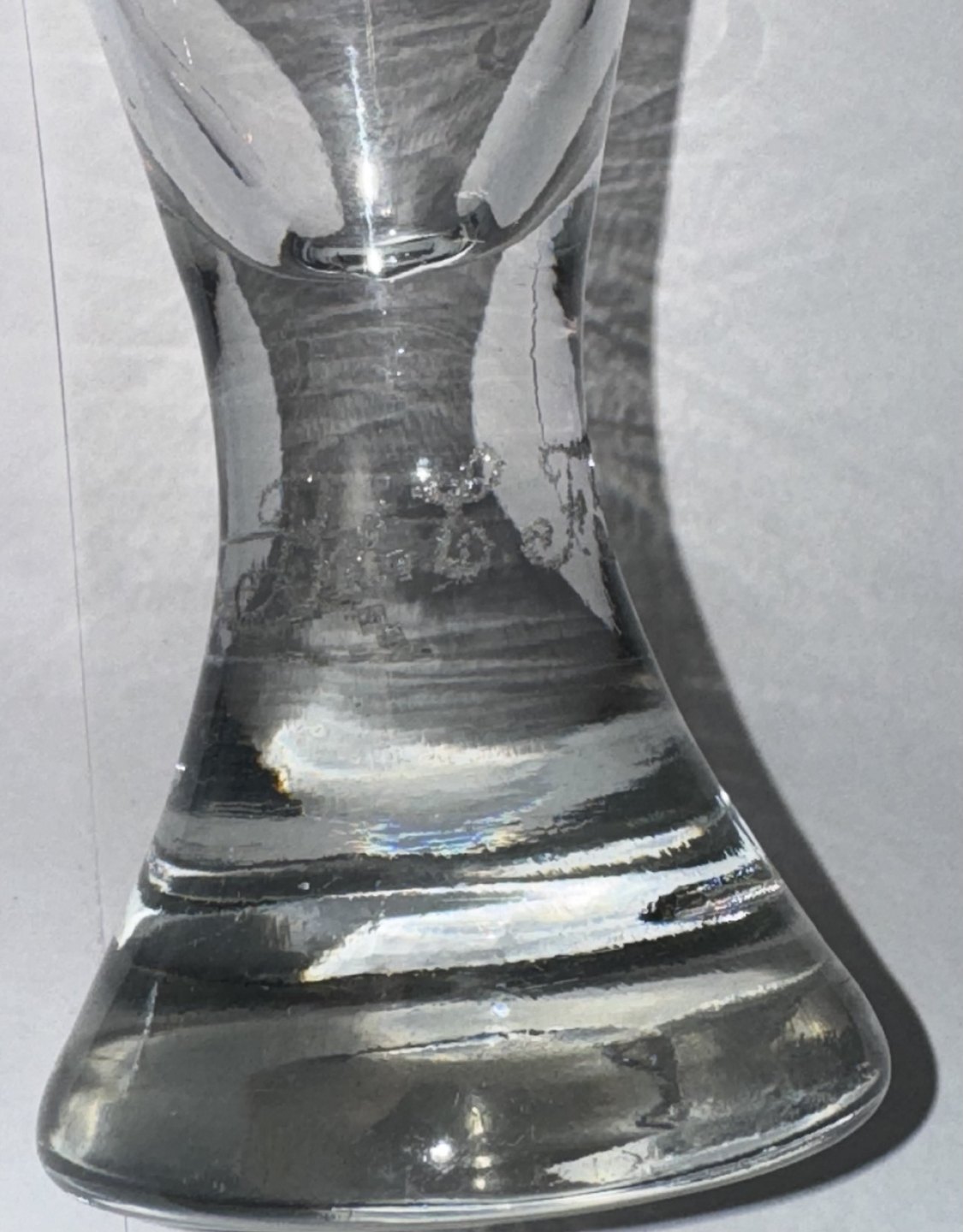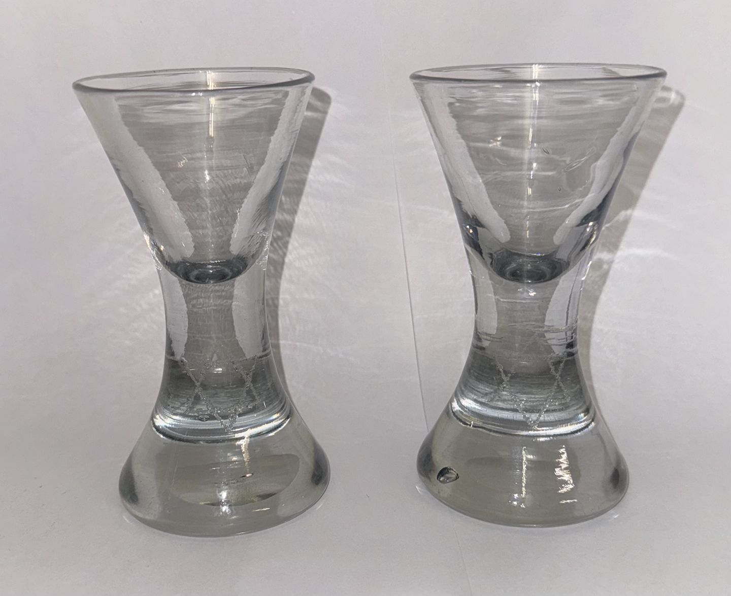 Description: Pair of hourglass-shaped Masonic glasses. Both engraved with the Star of David. One glass with engraved initials. Both glasses are clearly old as there are several indicators on them, including small "lice" in the glass mass, ball grinding on the bottom and signs of wear. No damage or repairs. H. 13 cm