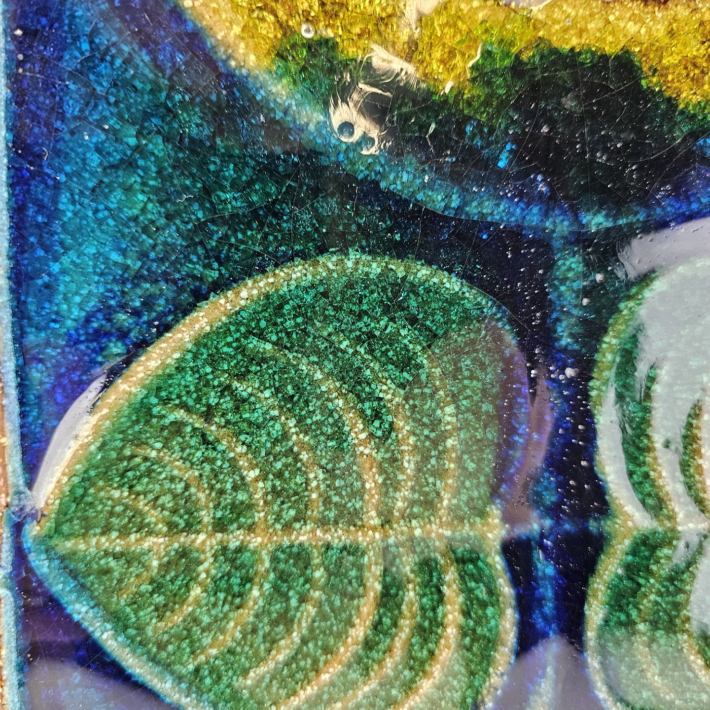 Beskrivelse: Relief i glaseret højbrændt stentøj med motiv af to blomster