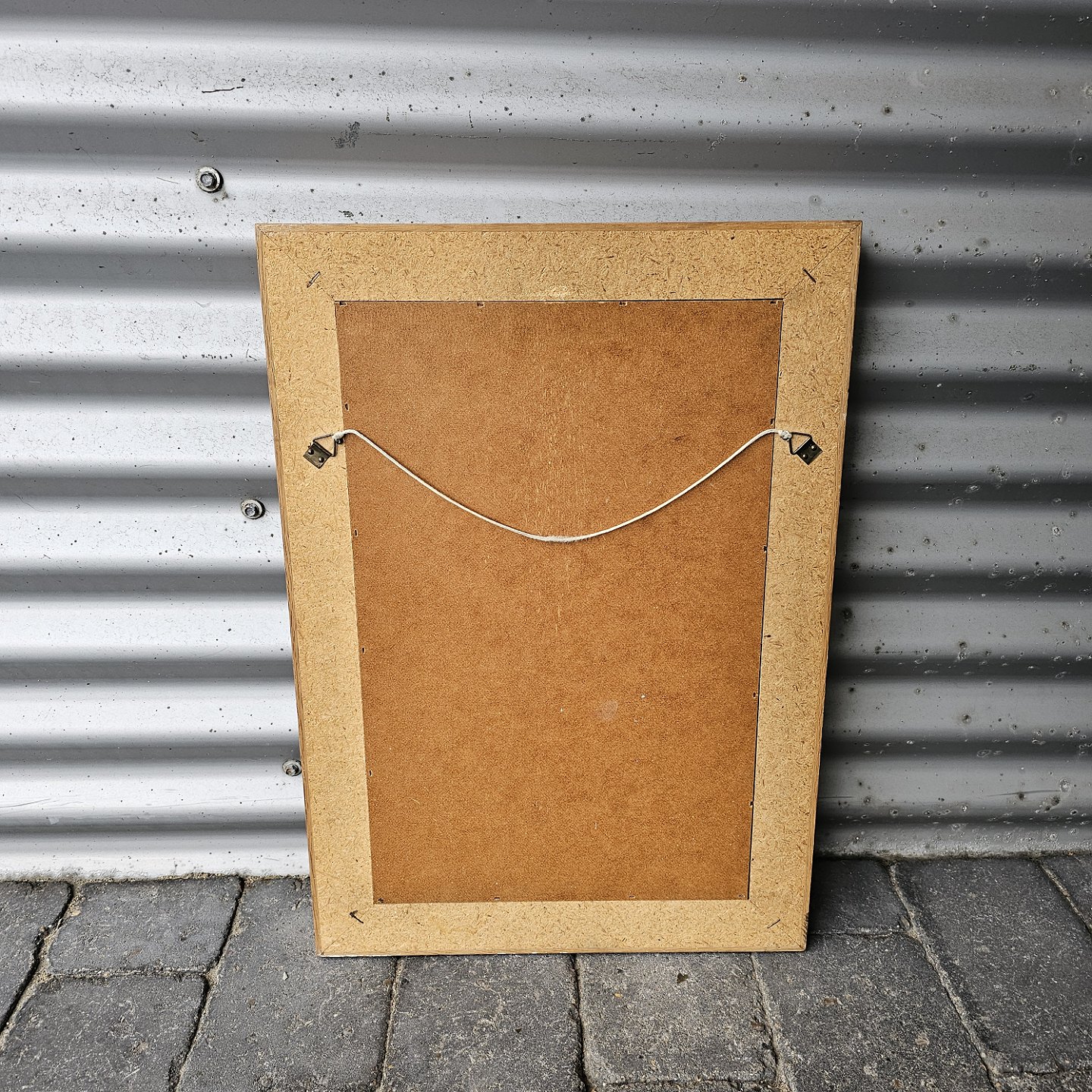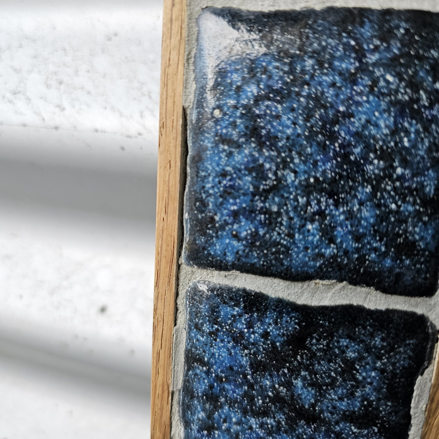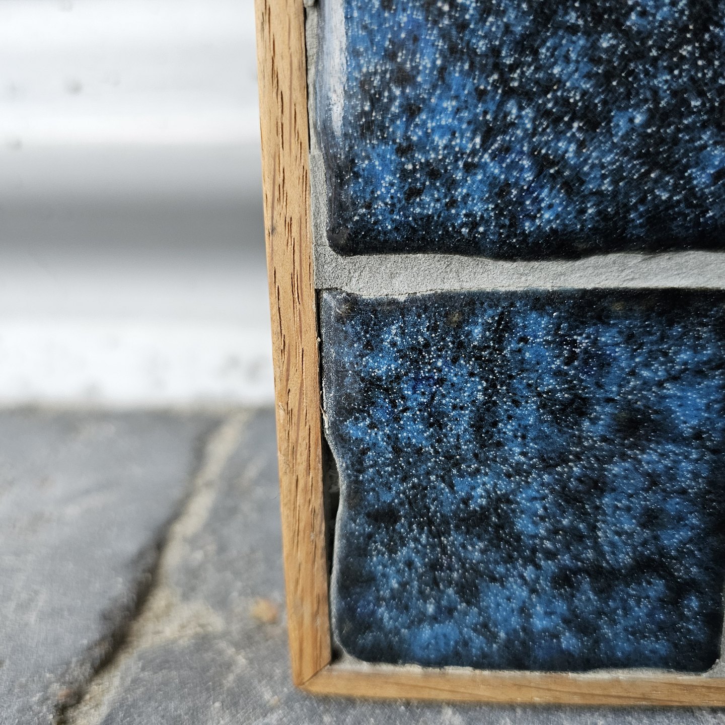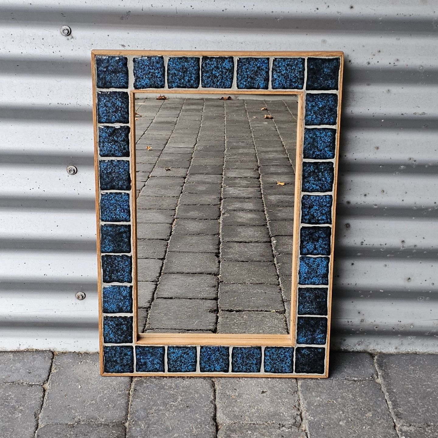 Beskrivelse: Rektangulært spejl med ramme dekoreret med blå klinker