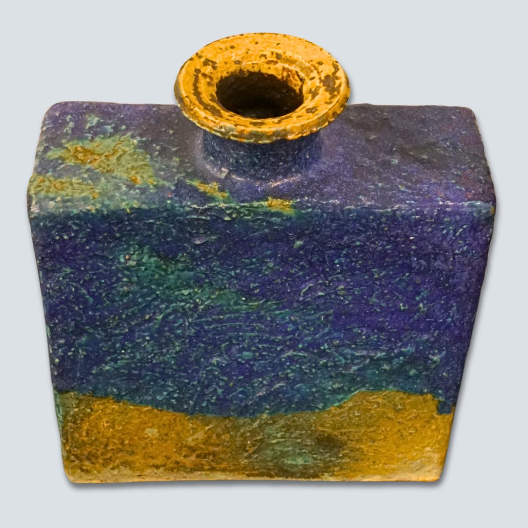 Beskrivelse: Annikki Hovisaari for Arabia; Firkantet keramik vase med blå glasur. Fra 1970érne.