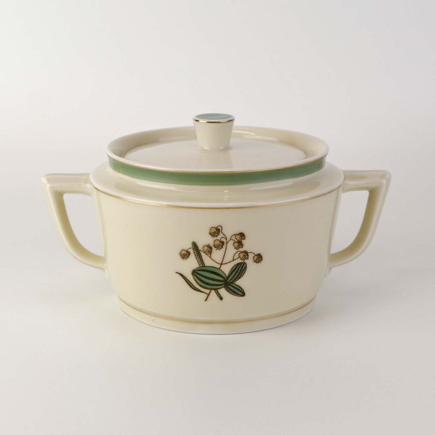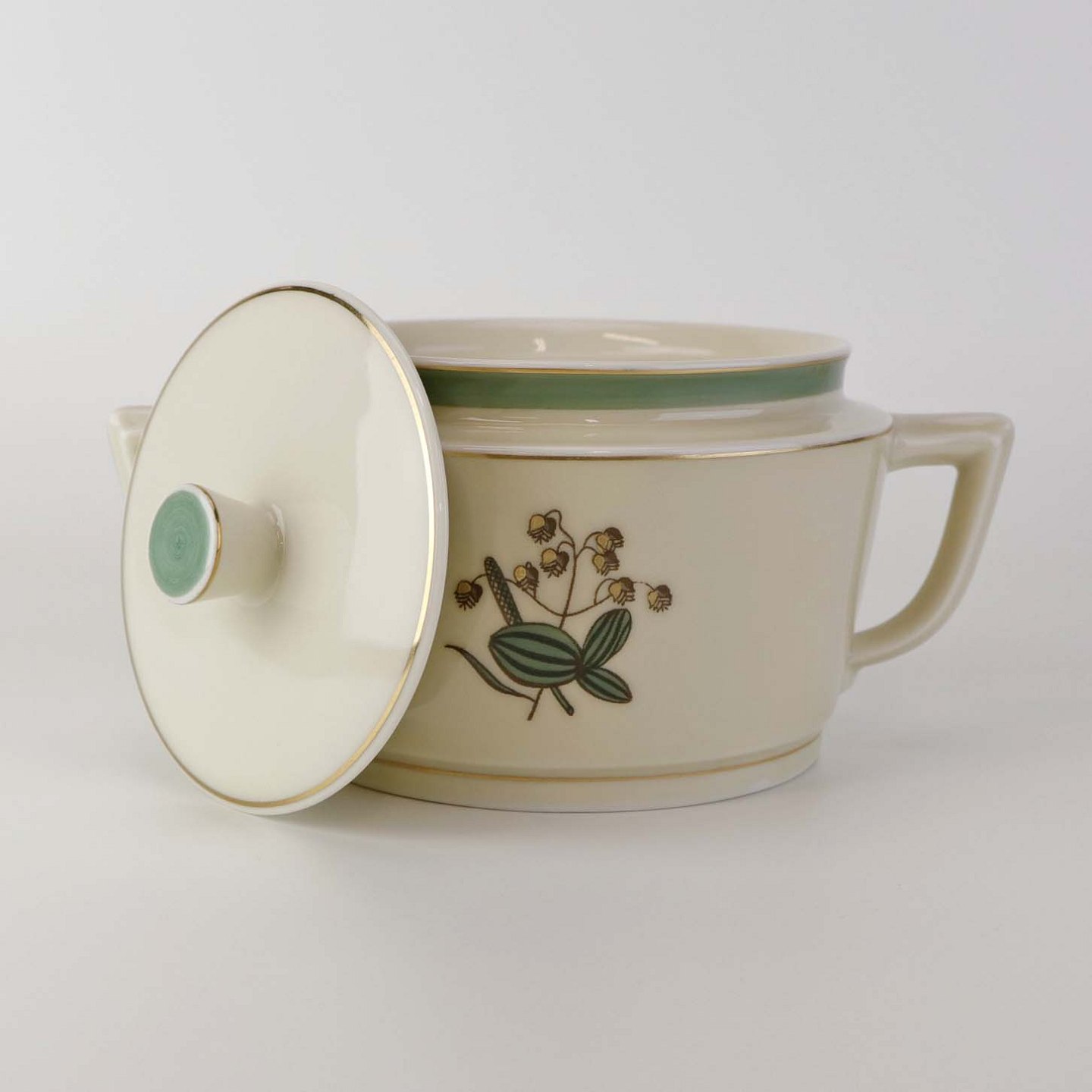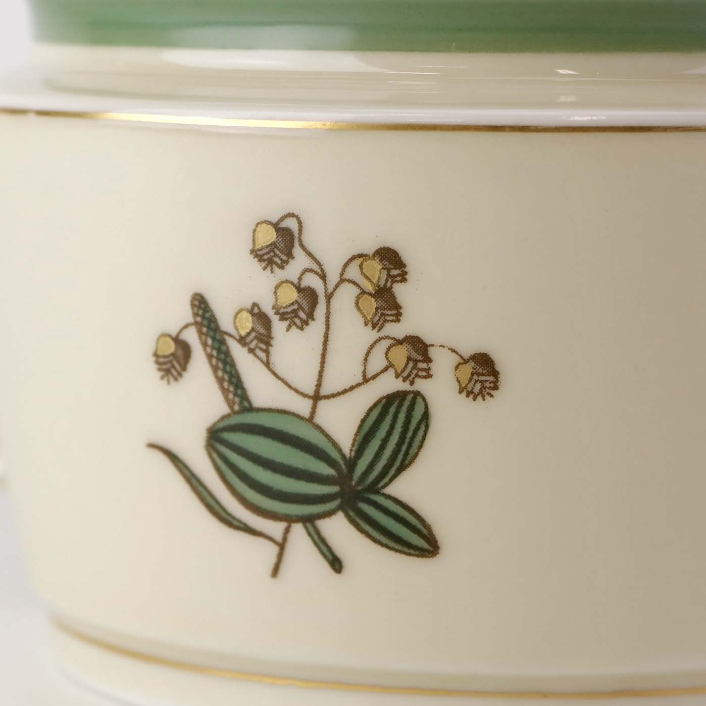 Stel i glat råhvidt porcelæn dekoreret med lysegrøn stribe og guldkant samt motiv af hjertegræs.