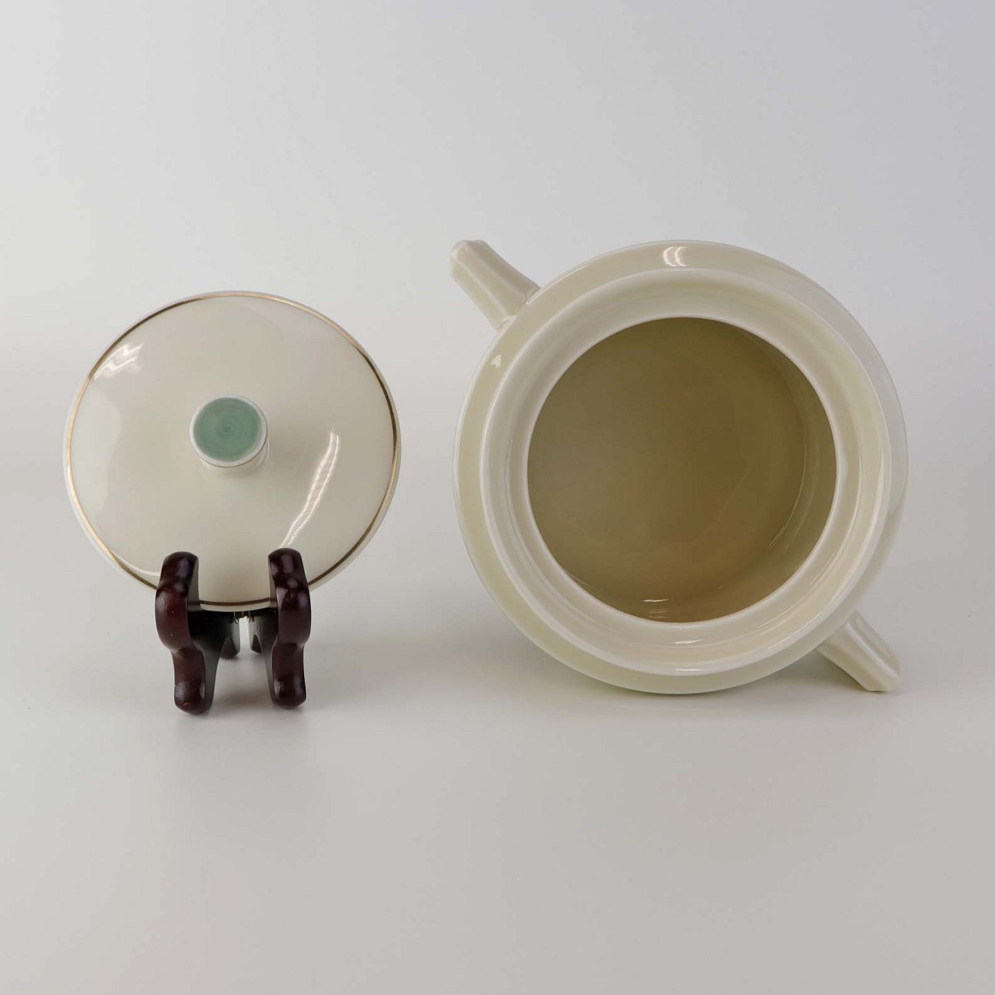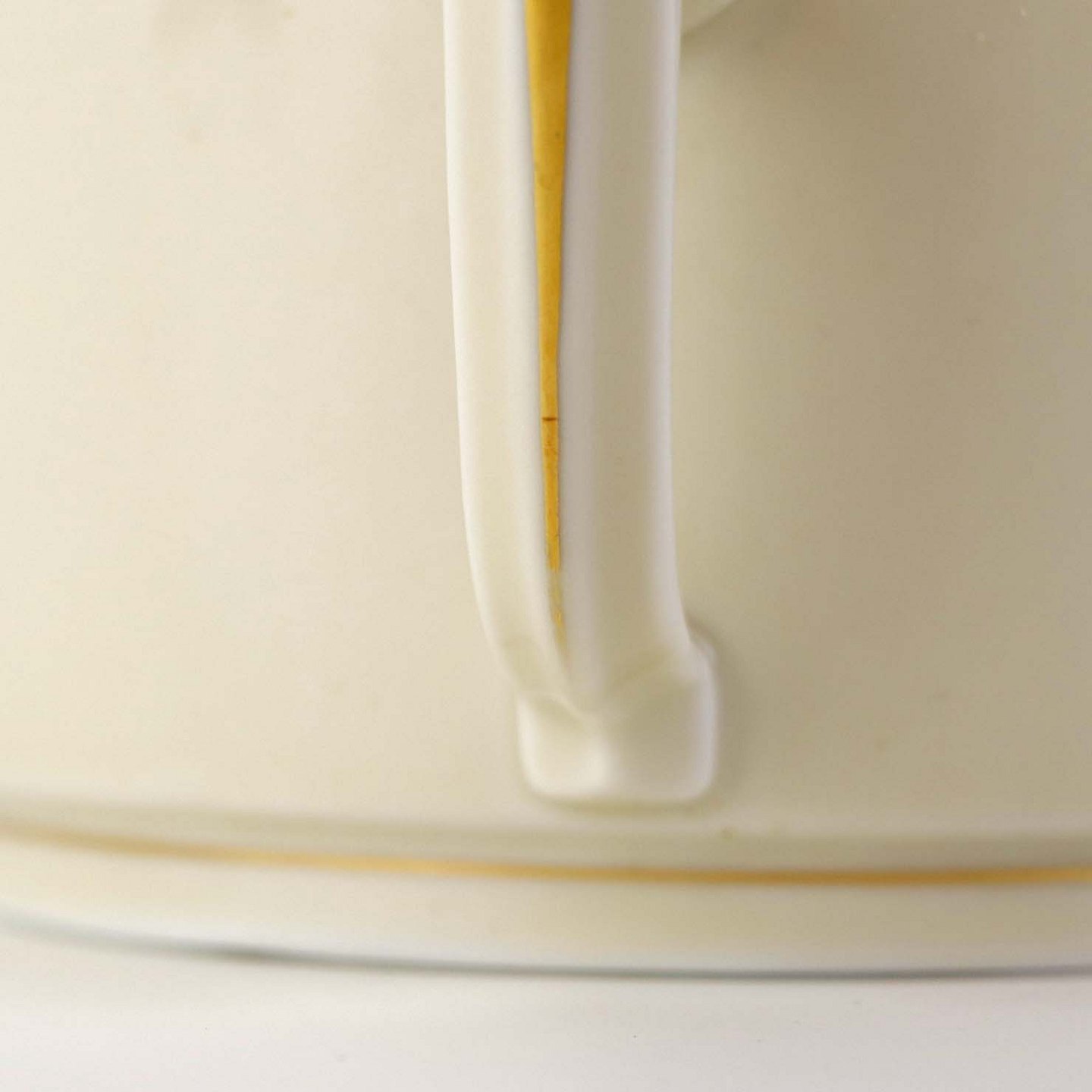 Fremstår med mindre brugsspor på guldkanten ved den ene hank.
