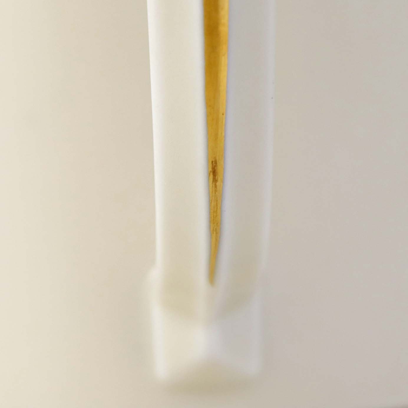 Stel i glat råhvidt porcelæn dekoreret med lysegrøn stribe og guldkant samt motiv af hjertegræs.