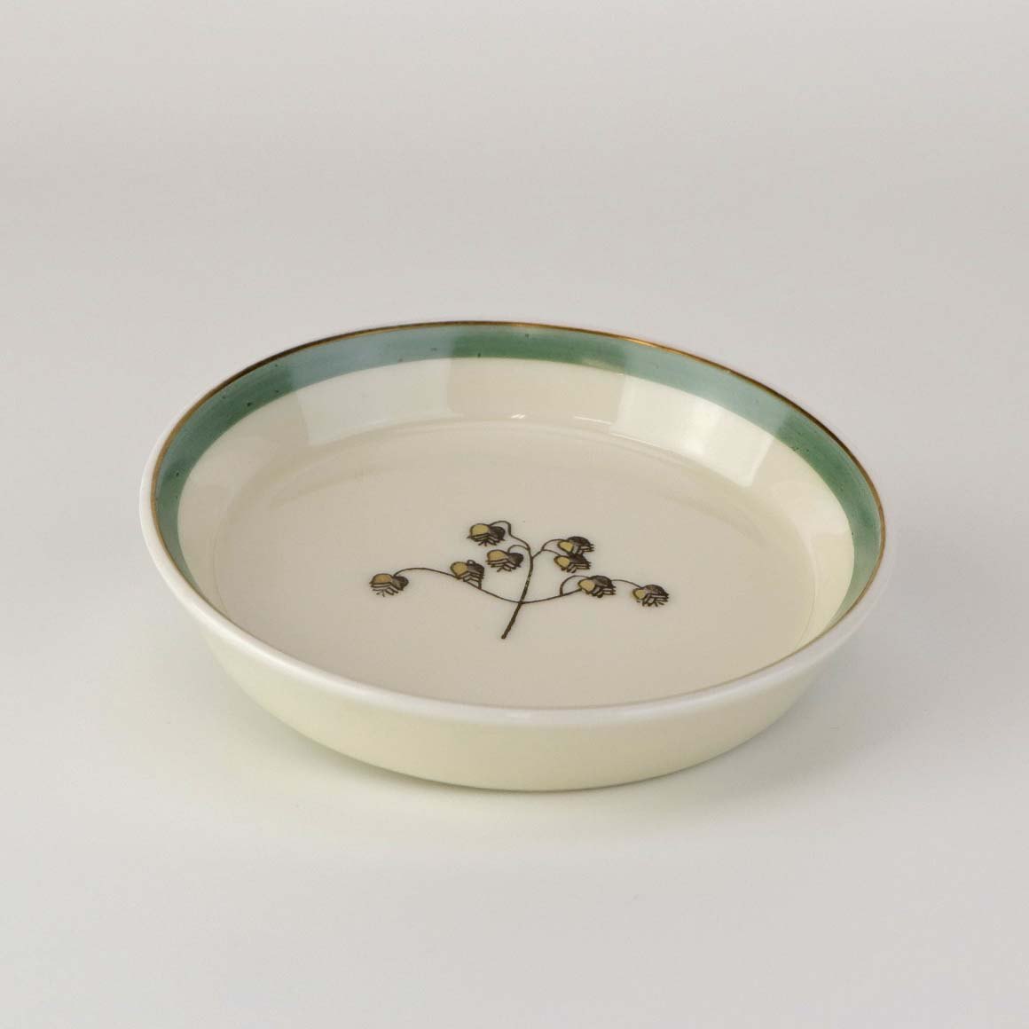 Stel i glat råhvidt porcelæn dekoreret med lysegrøn stribe og guldkant samt motiv af hjertegræs.