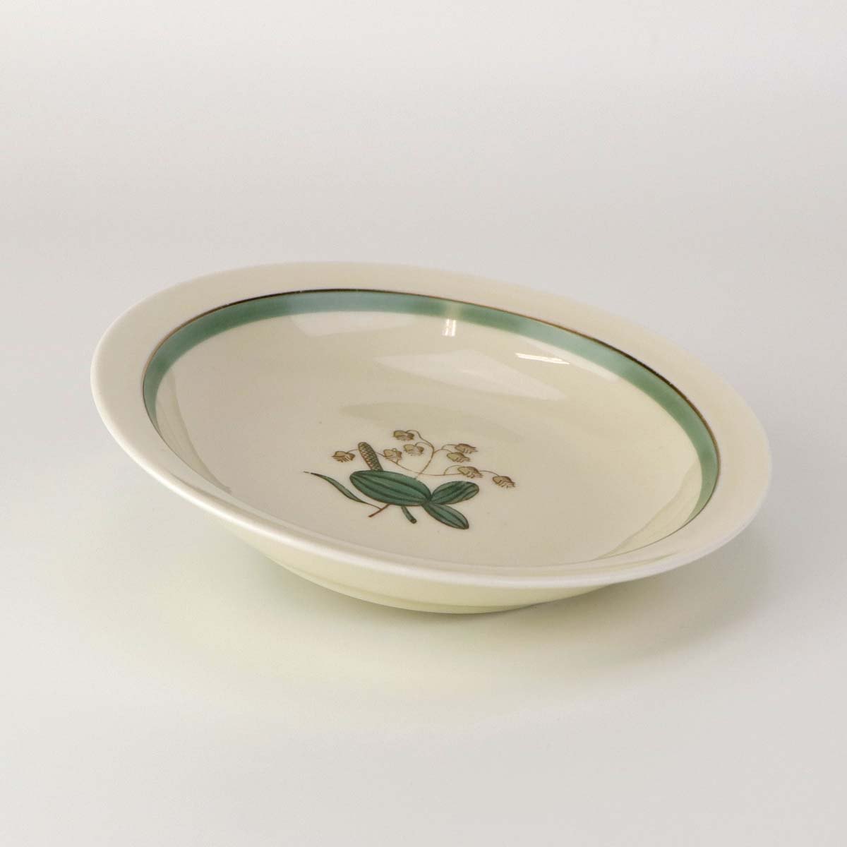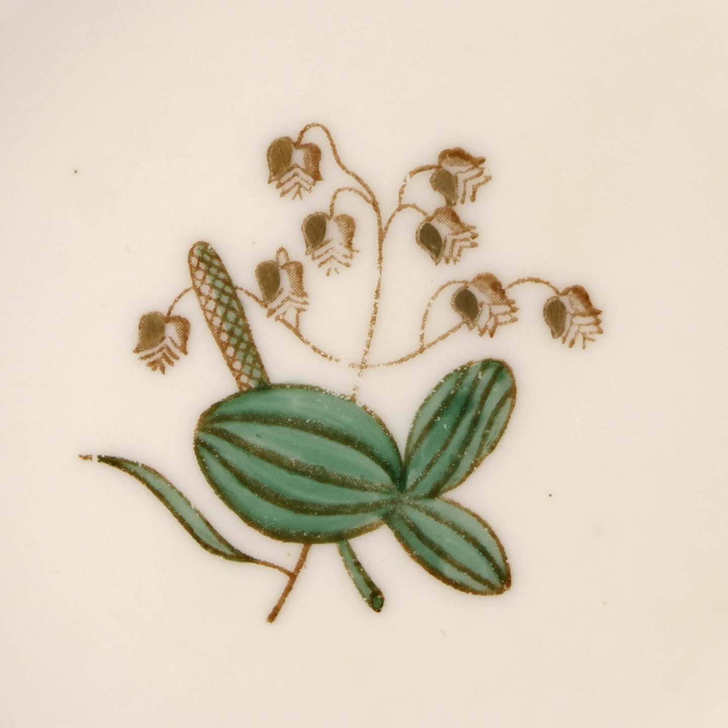 Stel i glat råhvidt porcelæn dekoreret med lysegrøn stribe og guldkant samt motiv af hjertegræs.