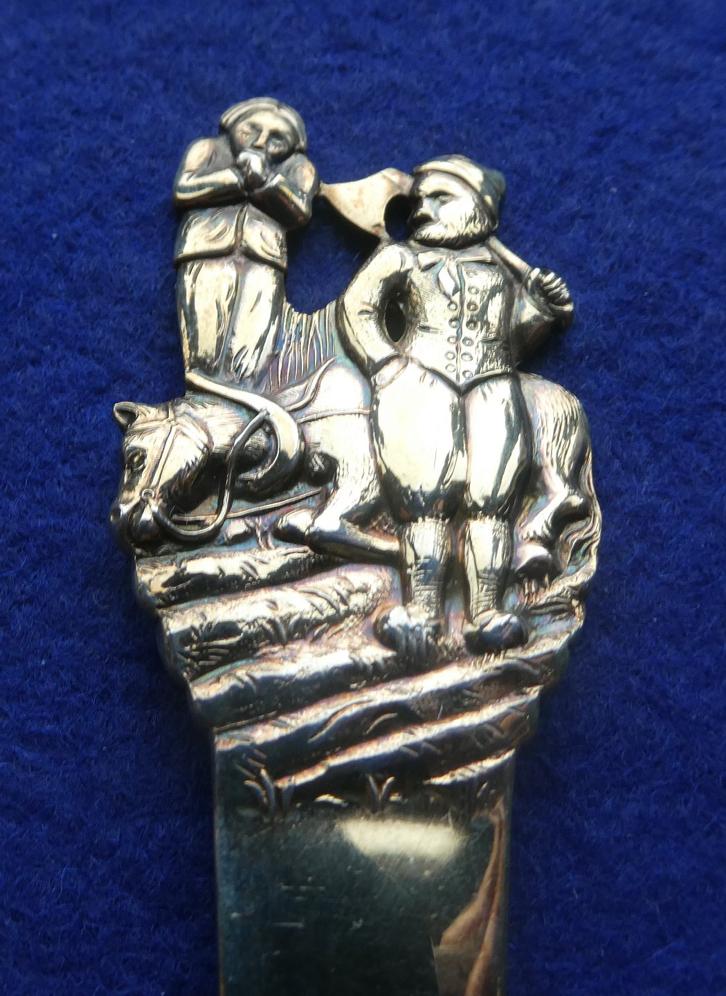 Beskrivelse: H.C. Andersen barnebestik i forgyldt tretårnet sølv med Lille Klaus og Store Klaus.