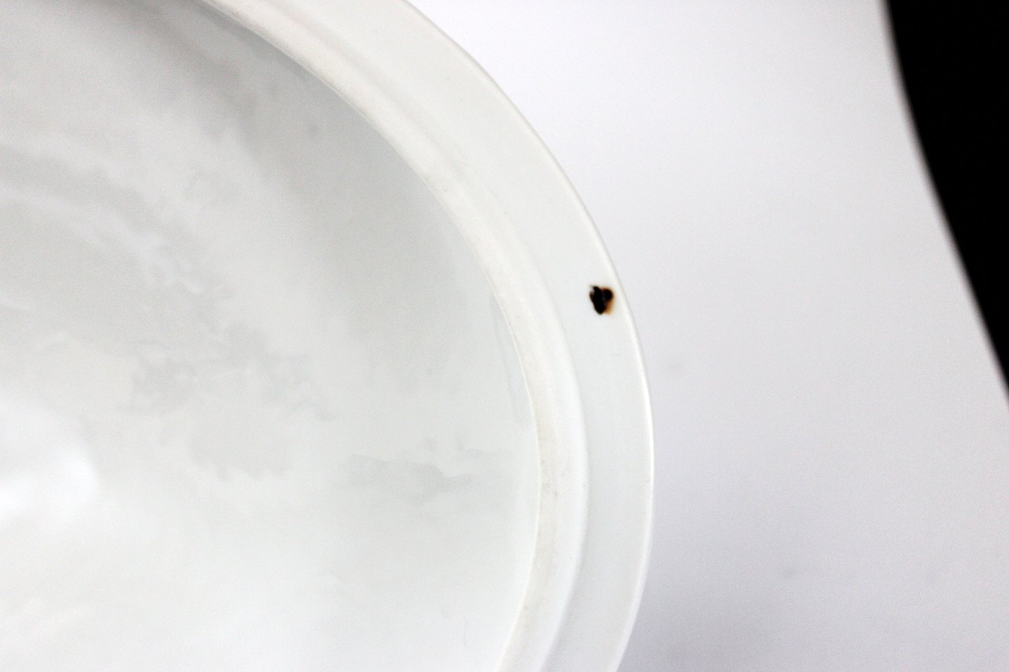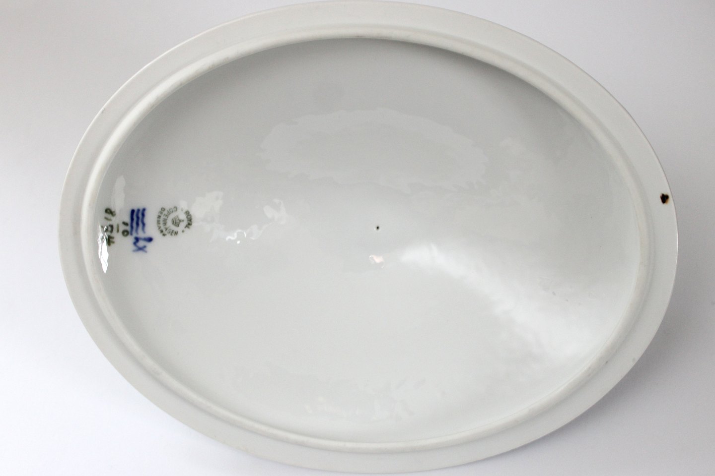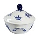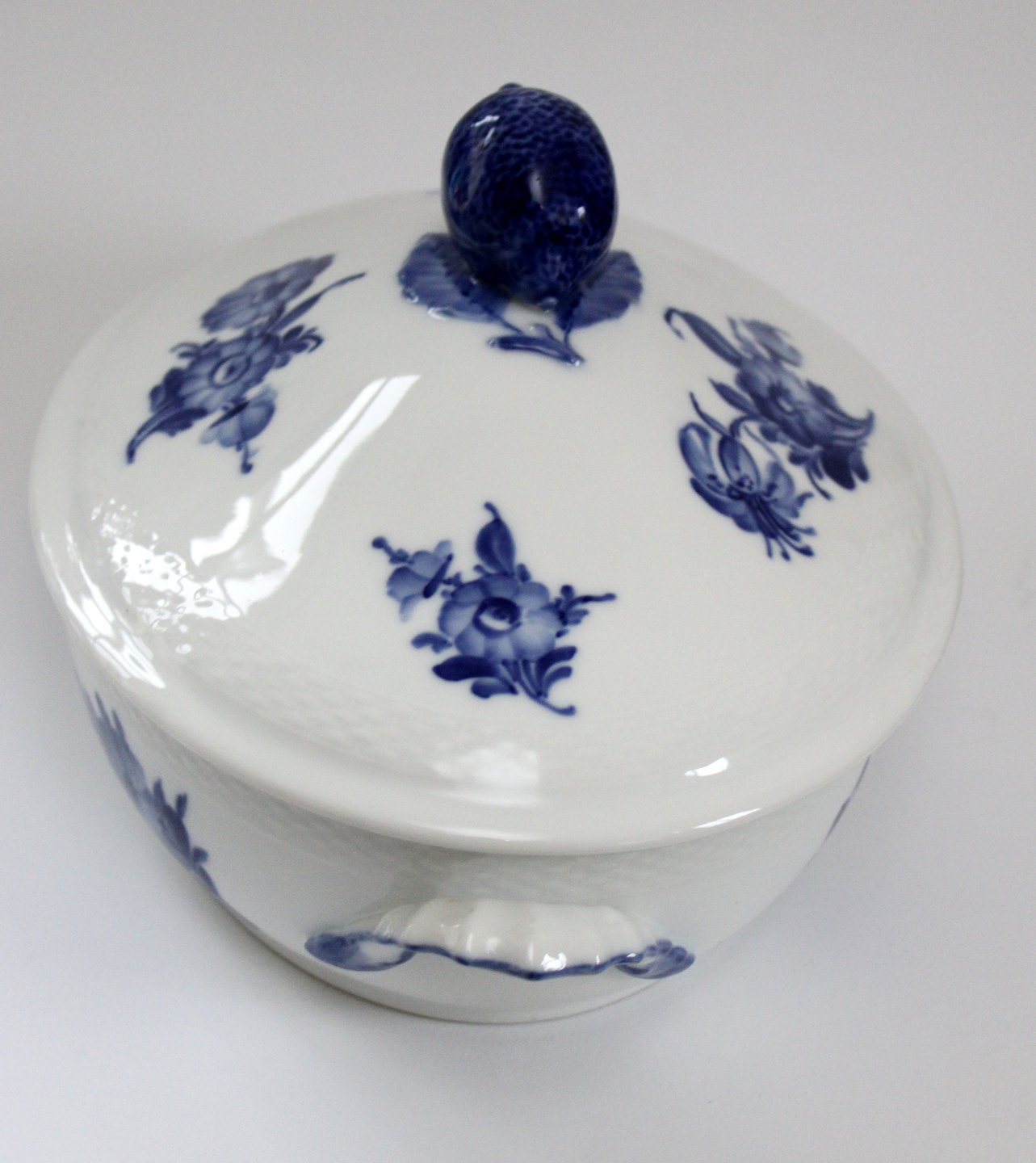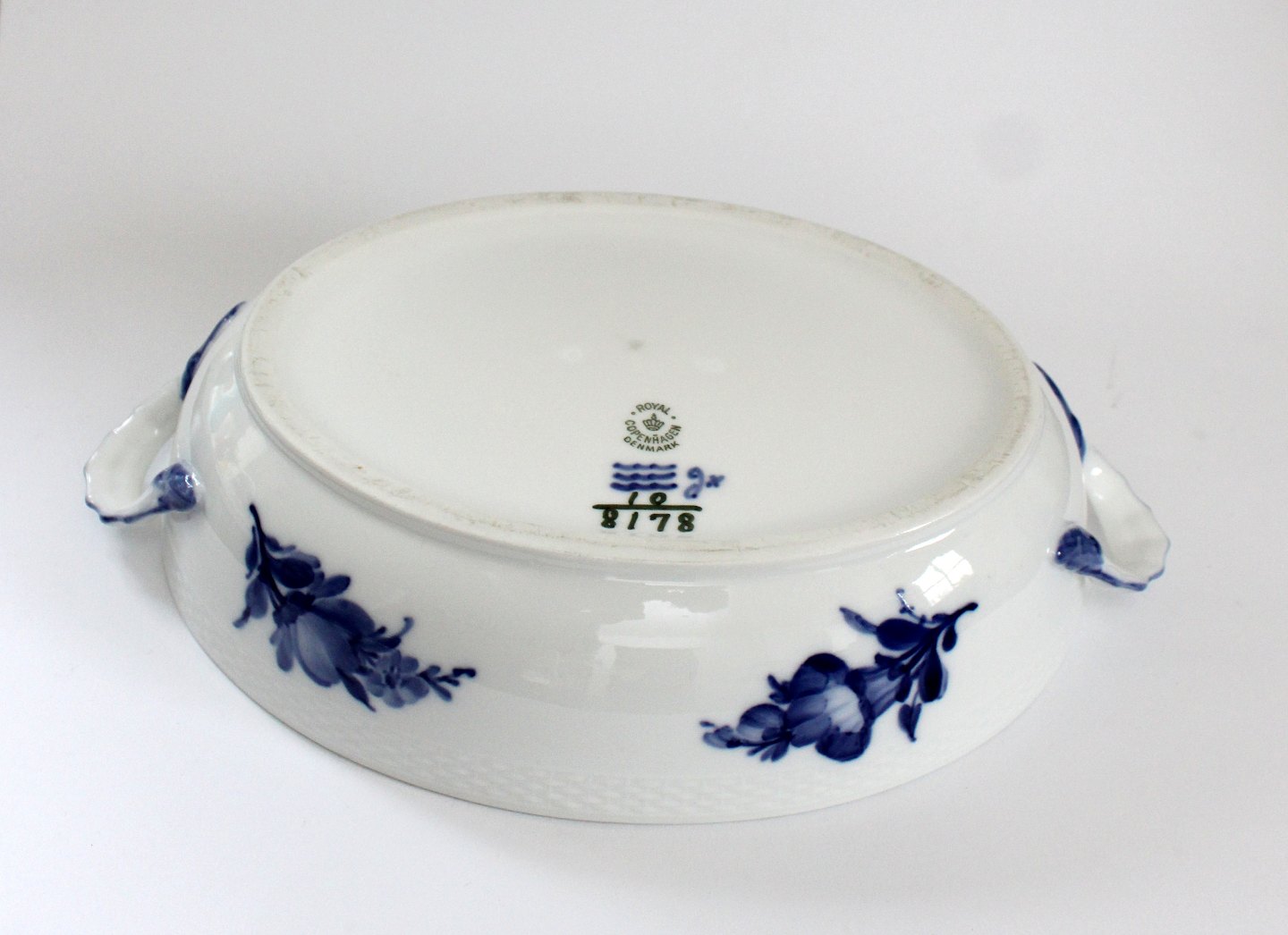 Beskrivelse: Royal Copenhagen, Blå Blomst flettet, Oval terrin med låg. Nr. 10/8172. Dateret 1945. Højde 15,5 cm. Længde 27,5 cm. Bredde 18 cm. I. sortering med sort brændingsplet på undersiden af låget. Pris: 1500 kr. stk. Lager: 1