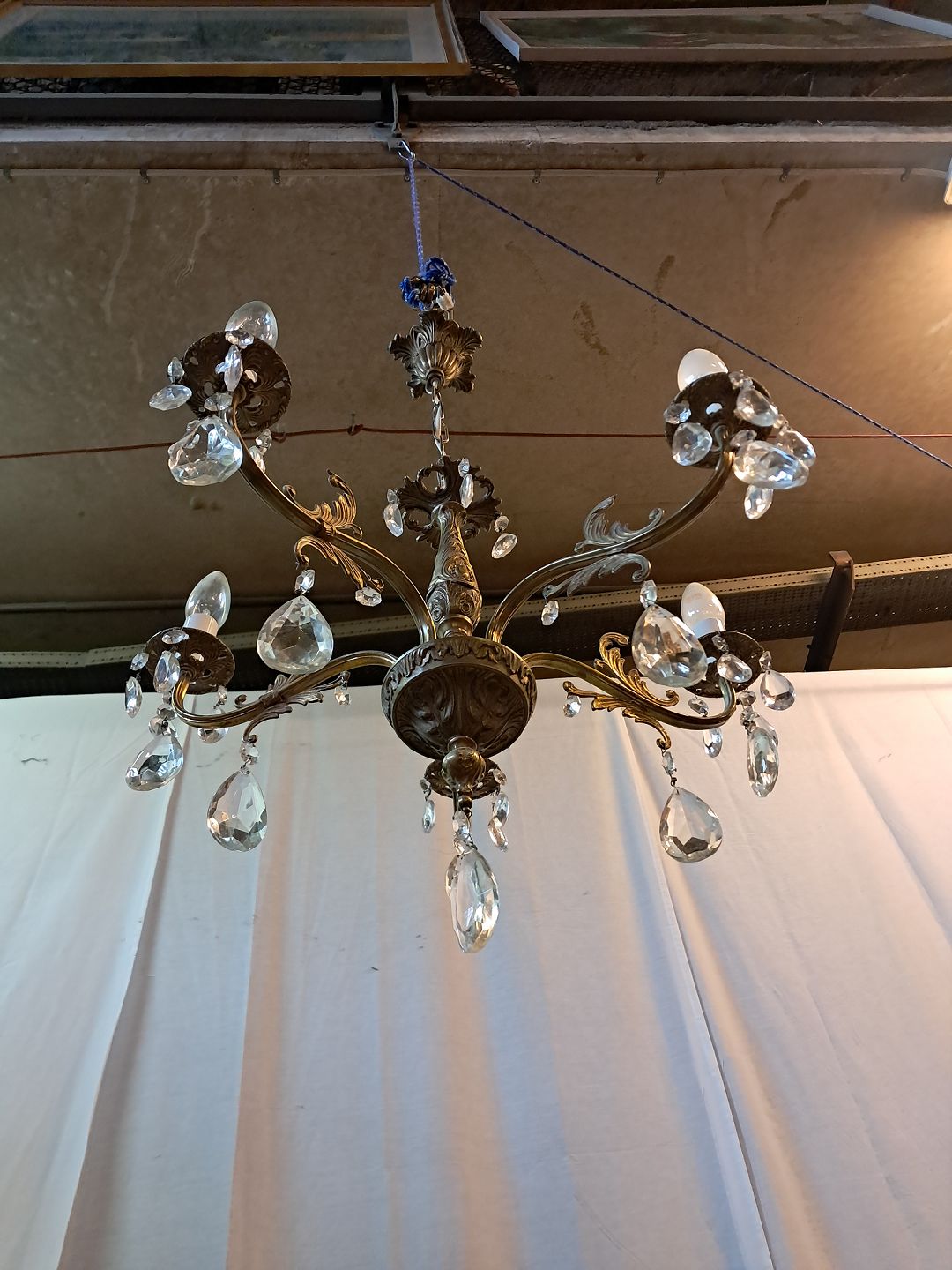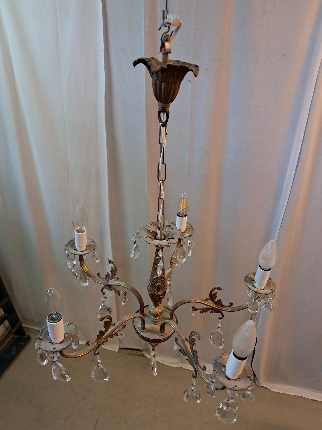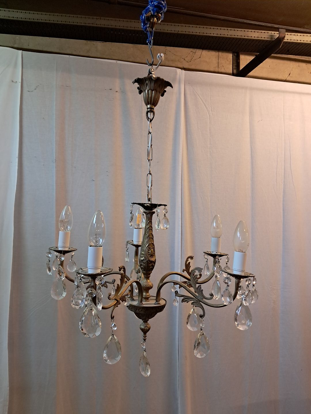 : Lysekrone i metal med glasprismer, fra 1950erne.