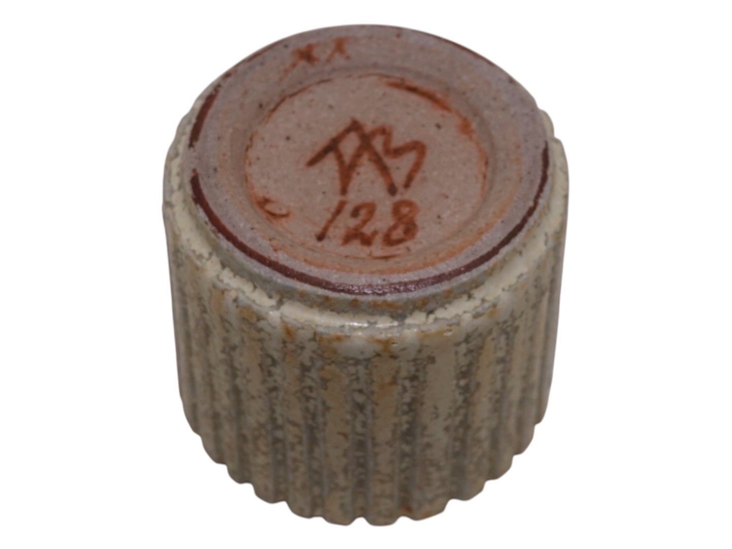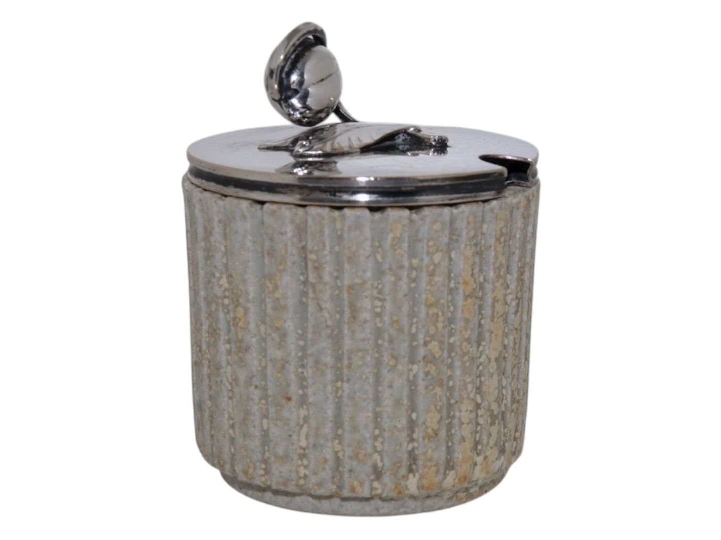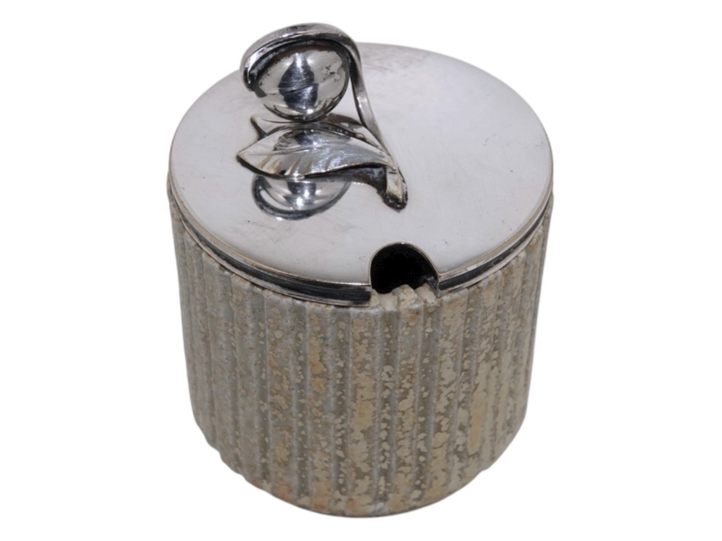 Beskrivelse: Arne Bang keramik, marmeladekrukke med låg i pletsølv.