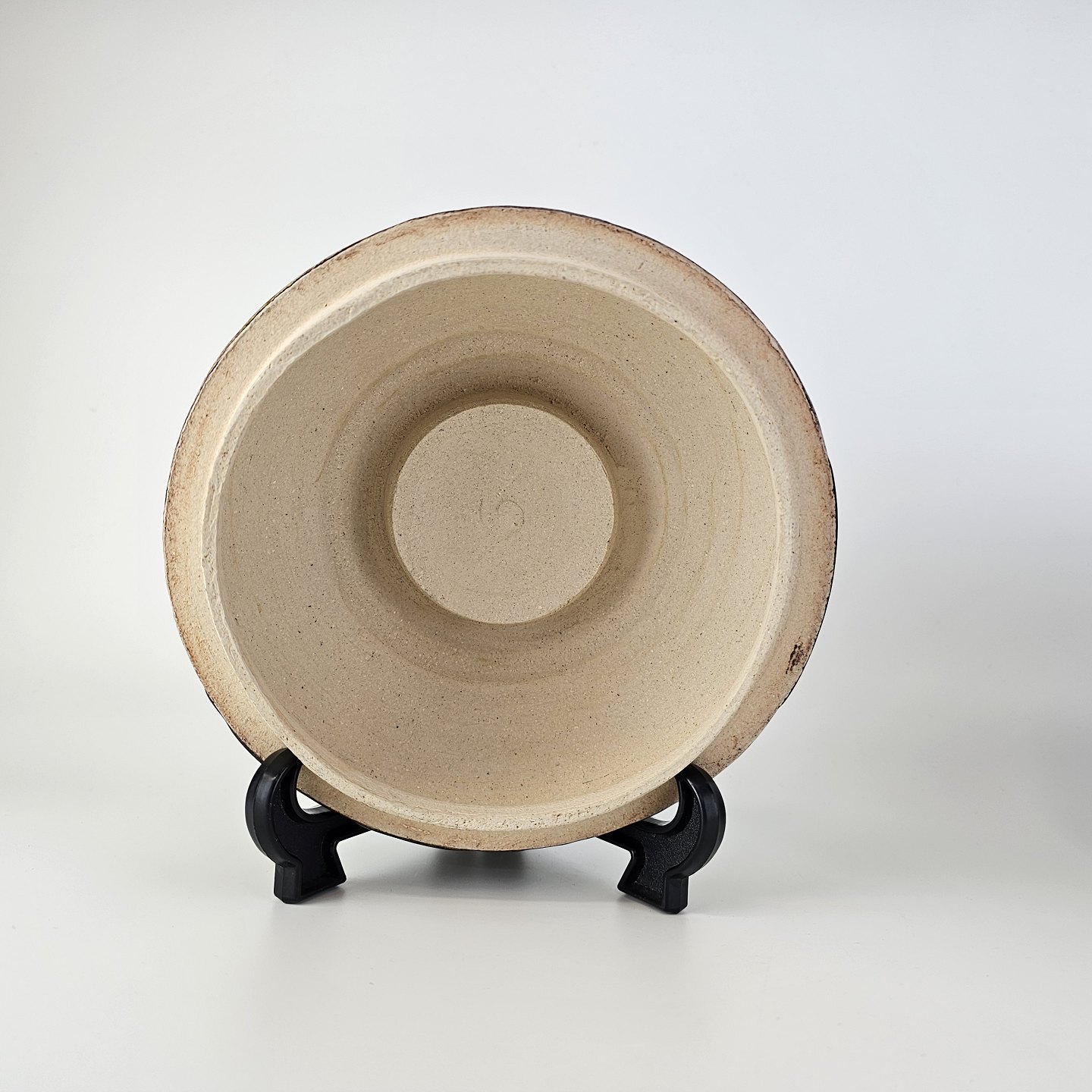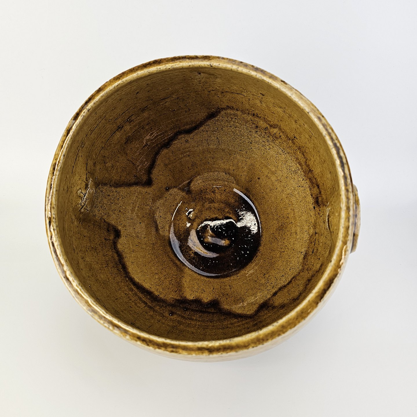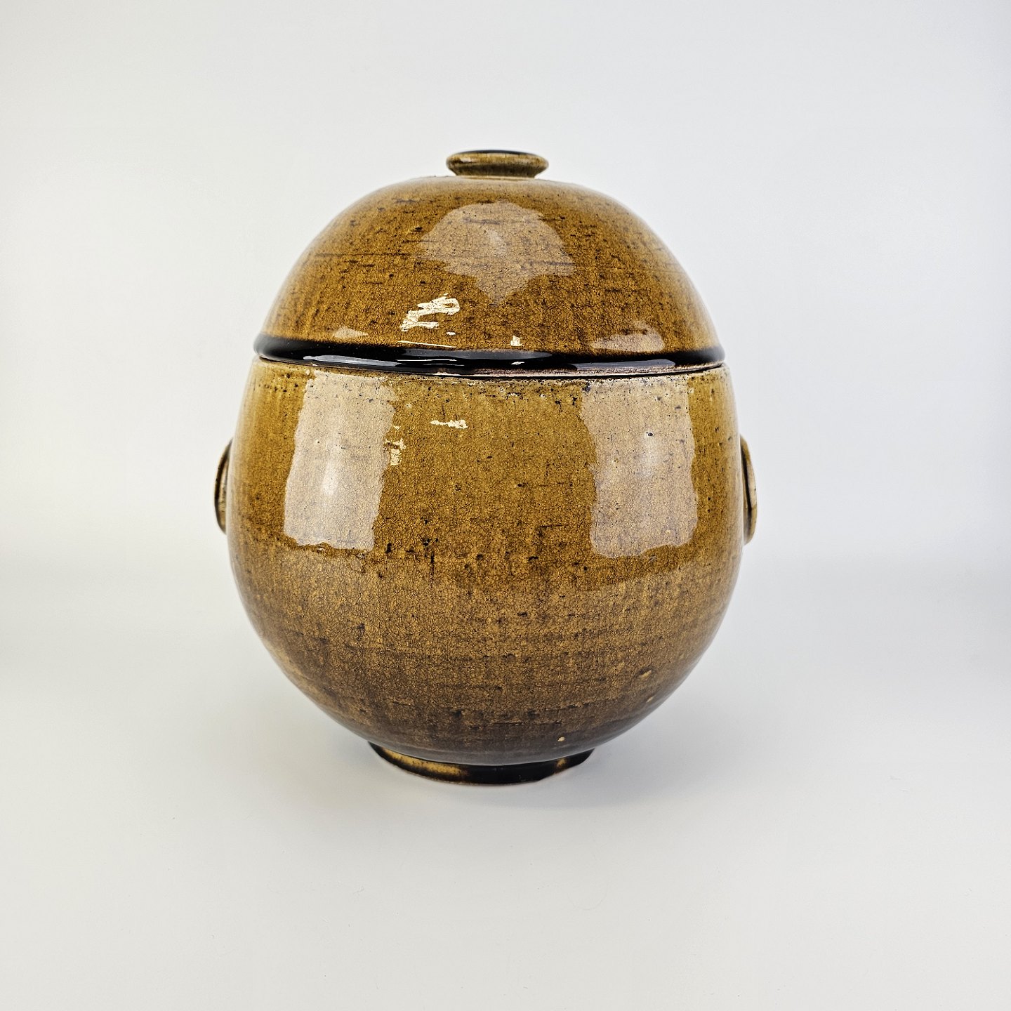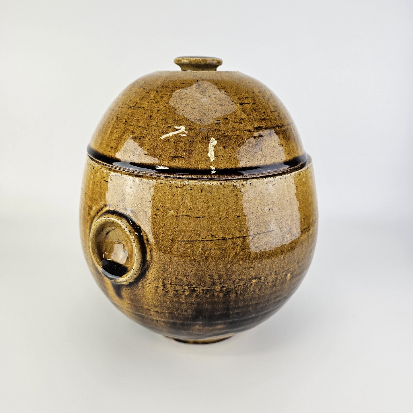 Beskrivelse: Æggeformet krukke med låg i brun glaseret keramik