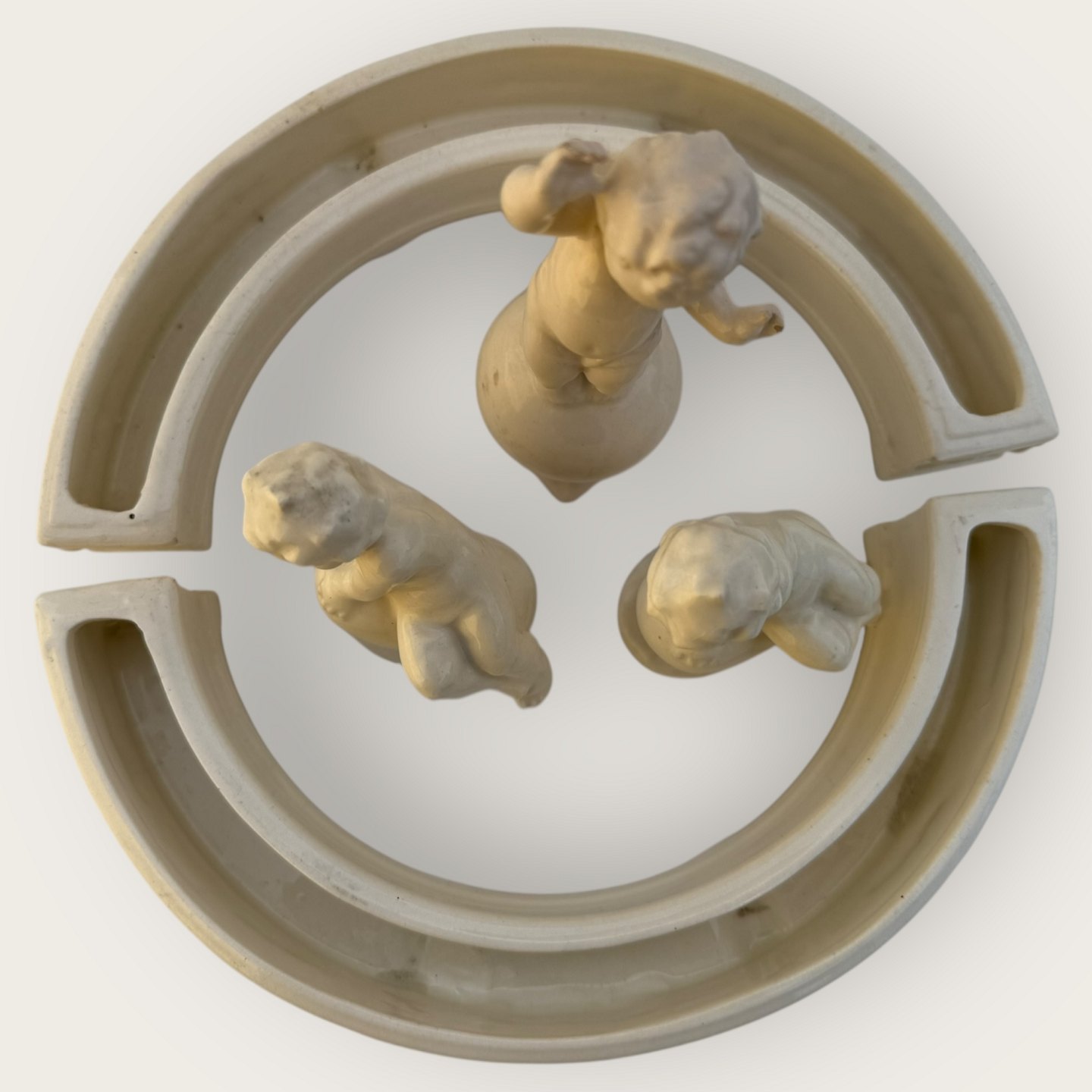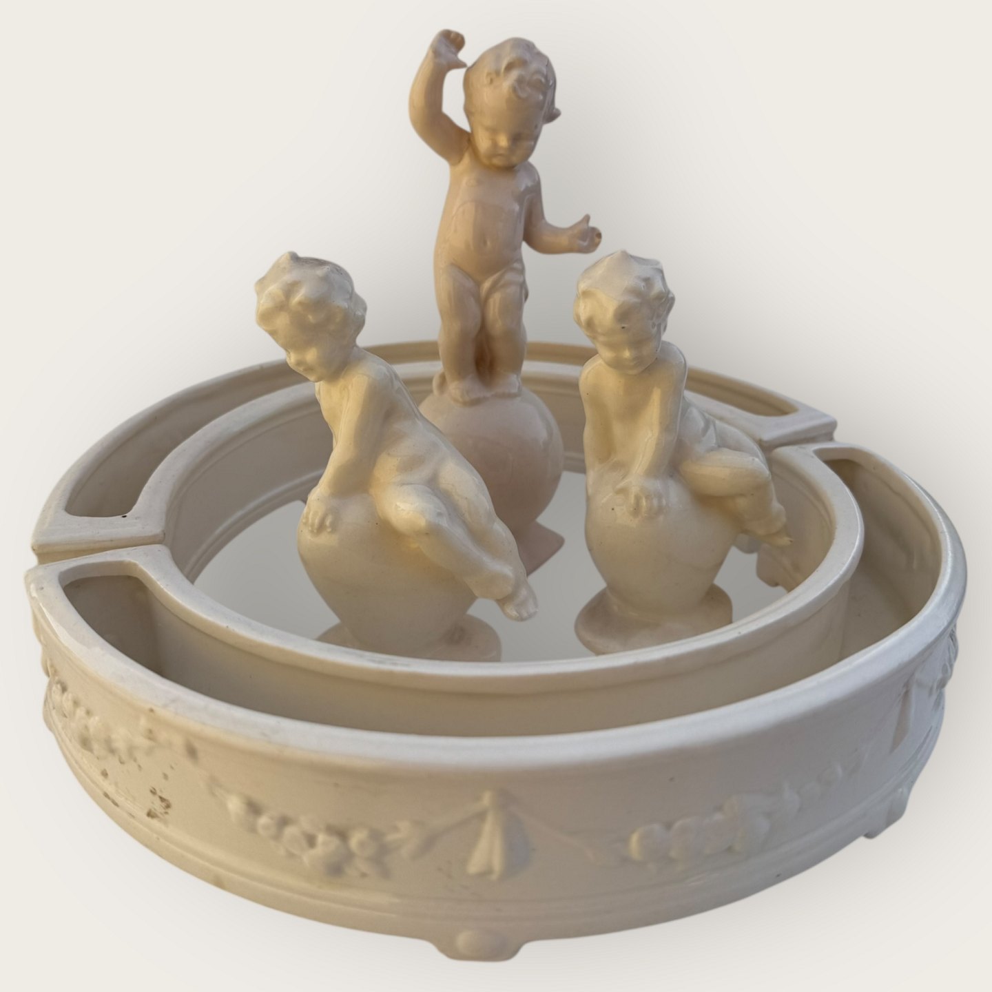 Beskrivelse: Centerpiece, Fajance bord tableau med figurer, Creme hvid fajance, *Pæn brugt stand, med et par enkelte meget små afslag*