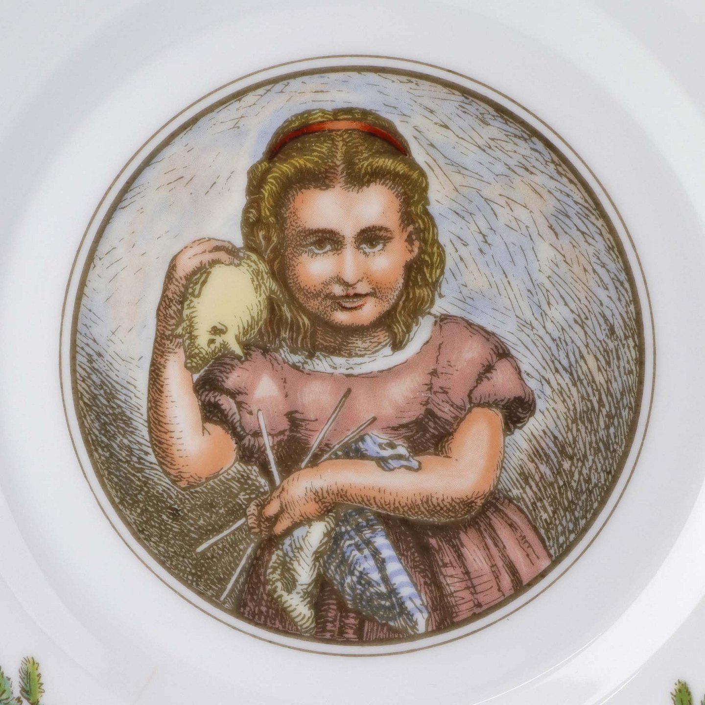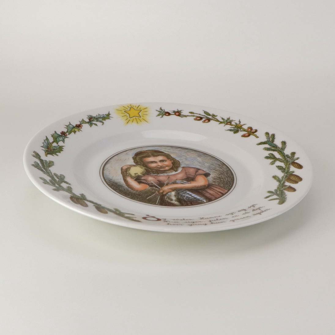 Beskrivelse: Flad desserttallerken i kongeligt porcelæn fra serien Peters Jul med motiv af søster Hanne. Nr. 3