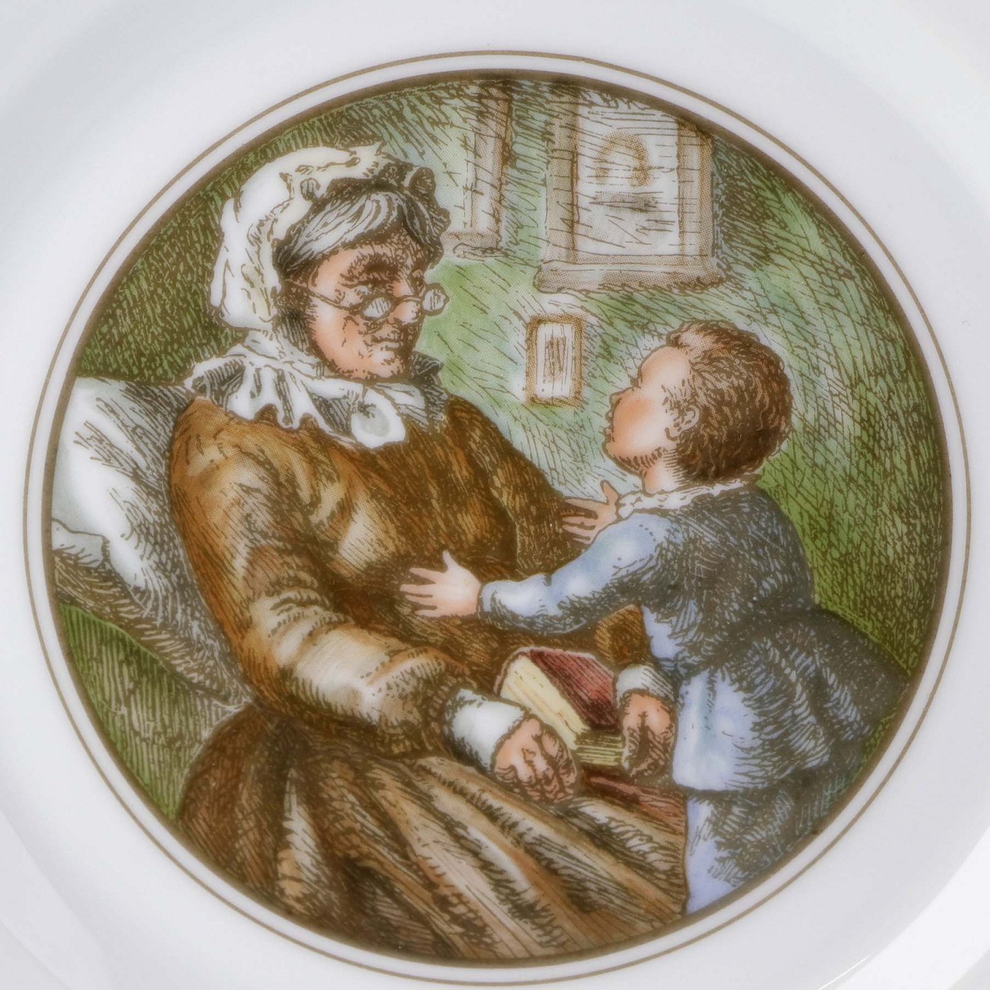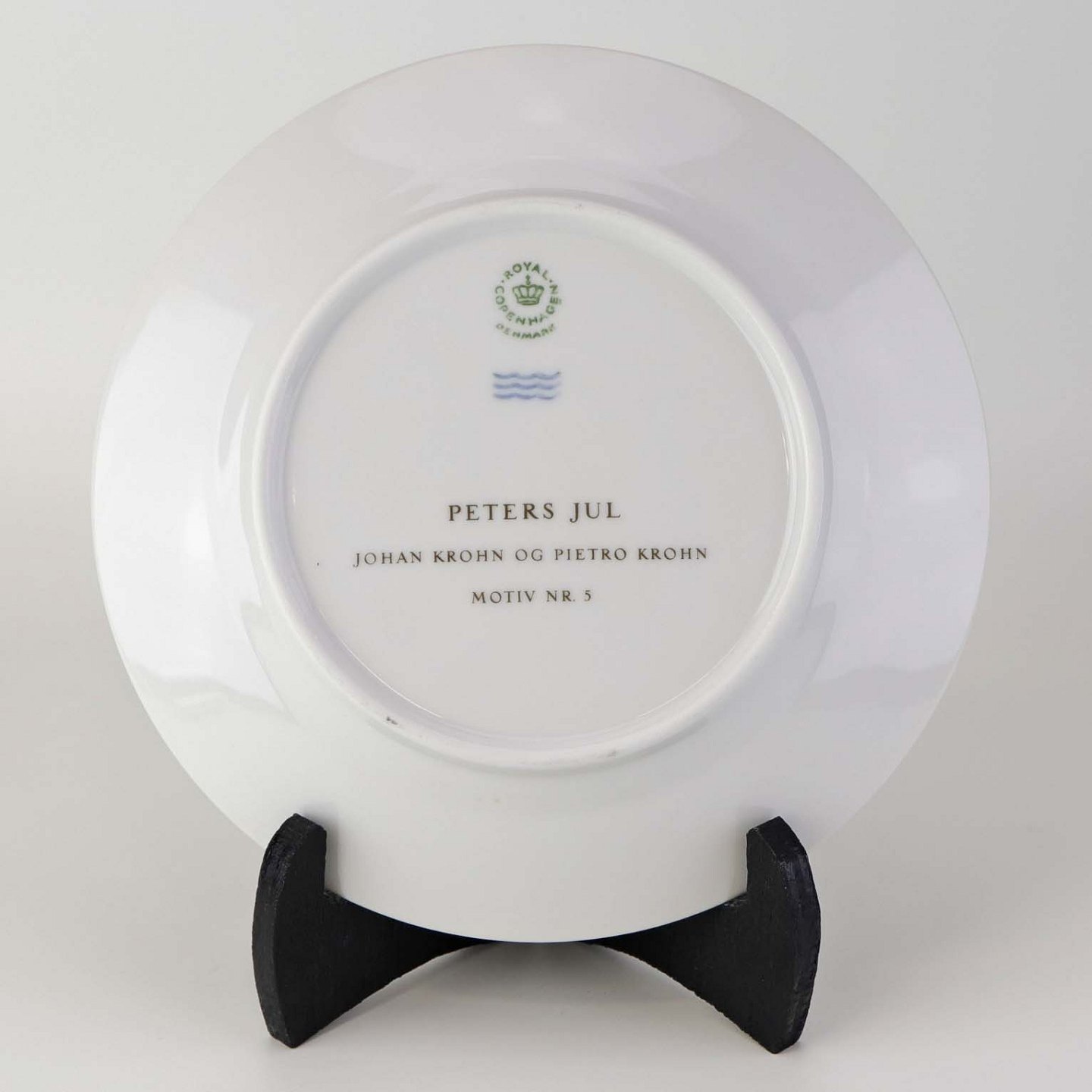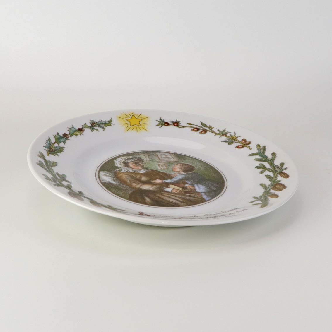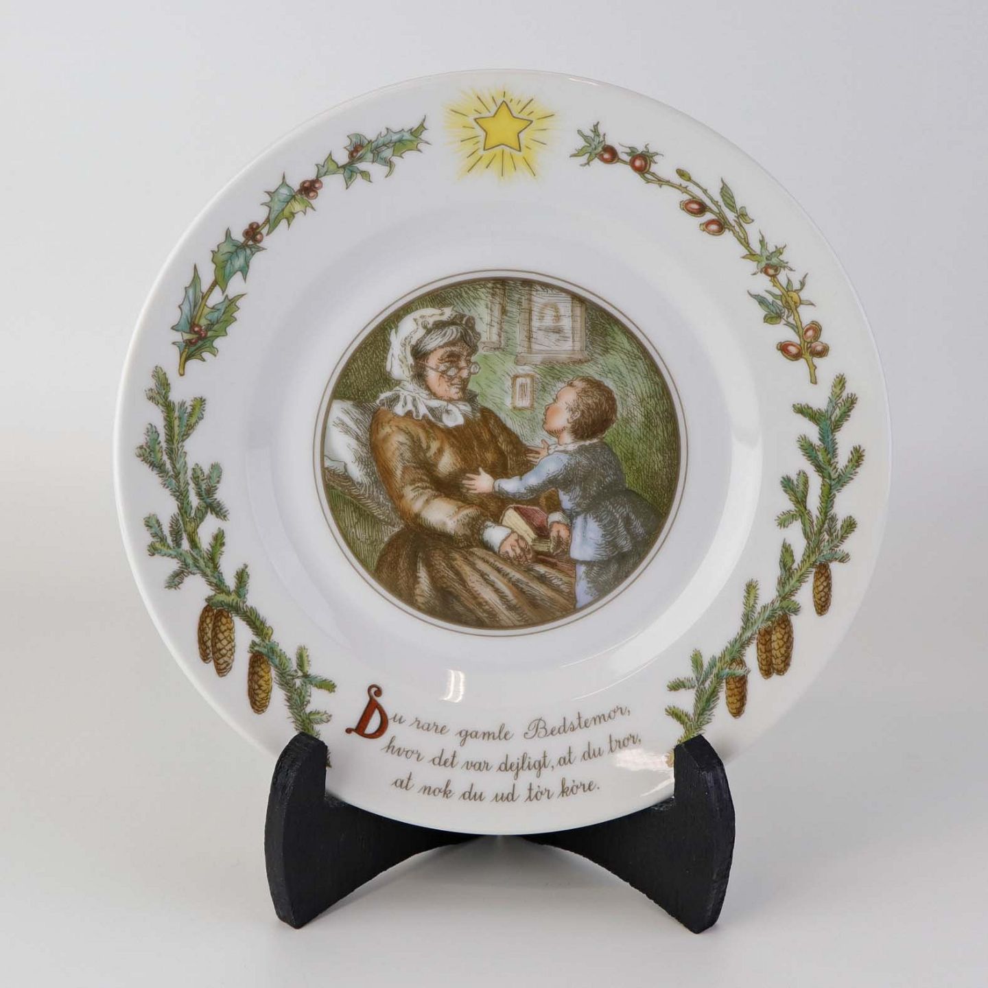 Beskrivelse: Flad desserttallerken i kongeligt porcelæn fra serien Peters Jul med motiv af bedstemor. Nr. 5