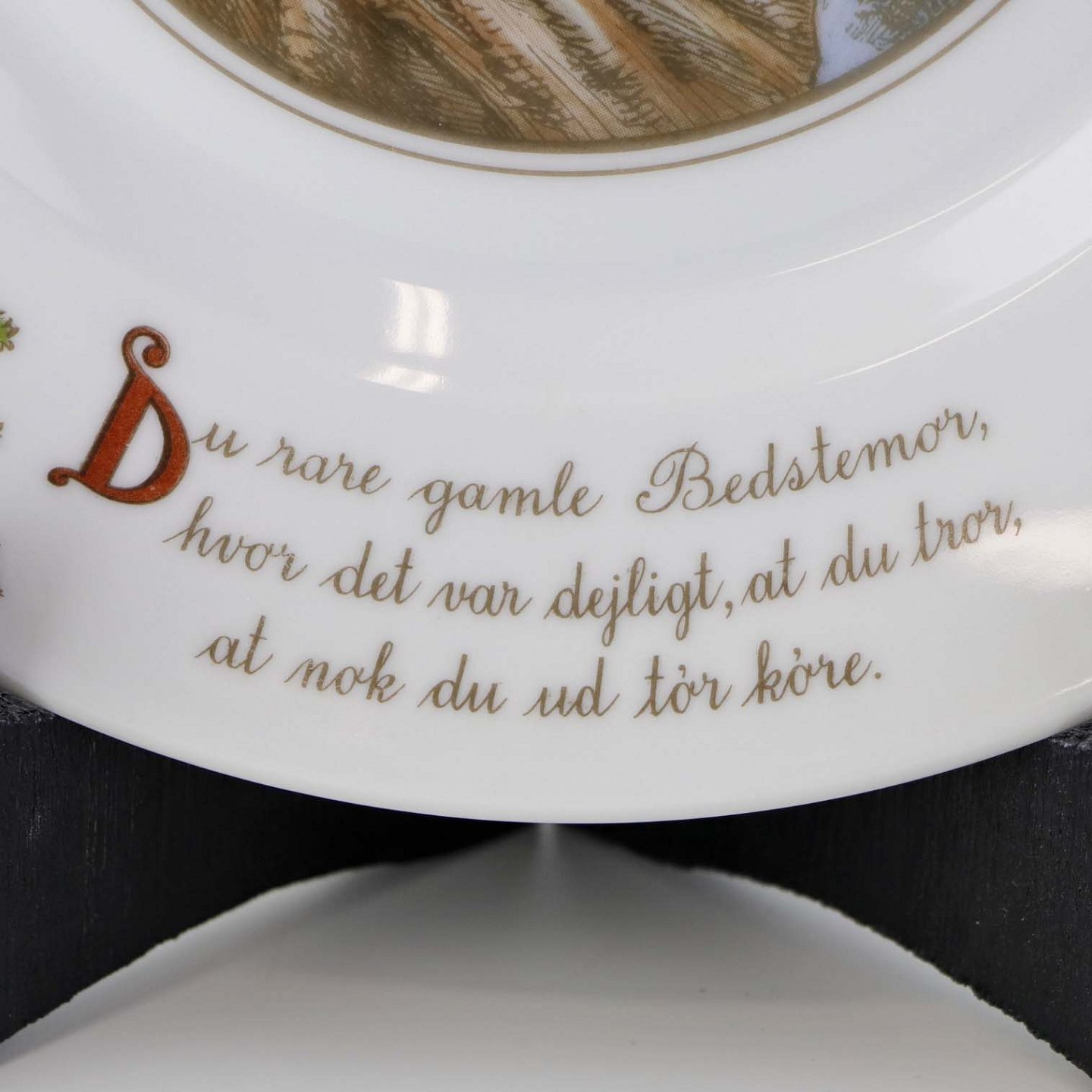 Teksten på tallerknen lyder - Du rare gamle bedstemor, hvor var det dejligt, at du tror, at nok du ud tør køre.