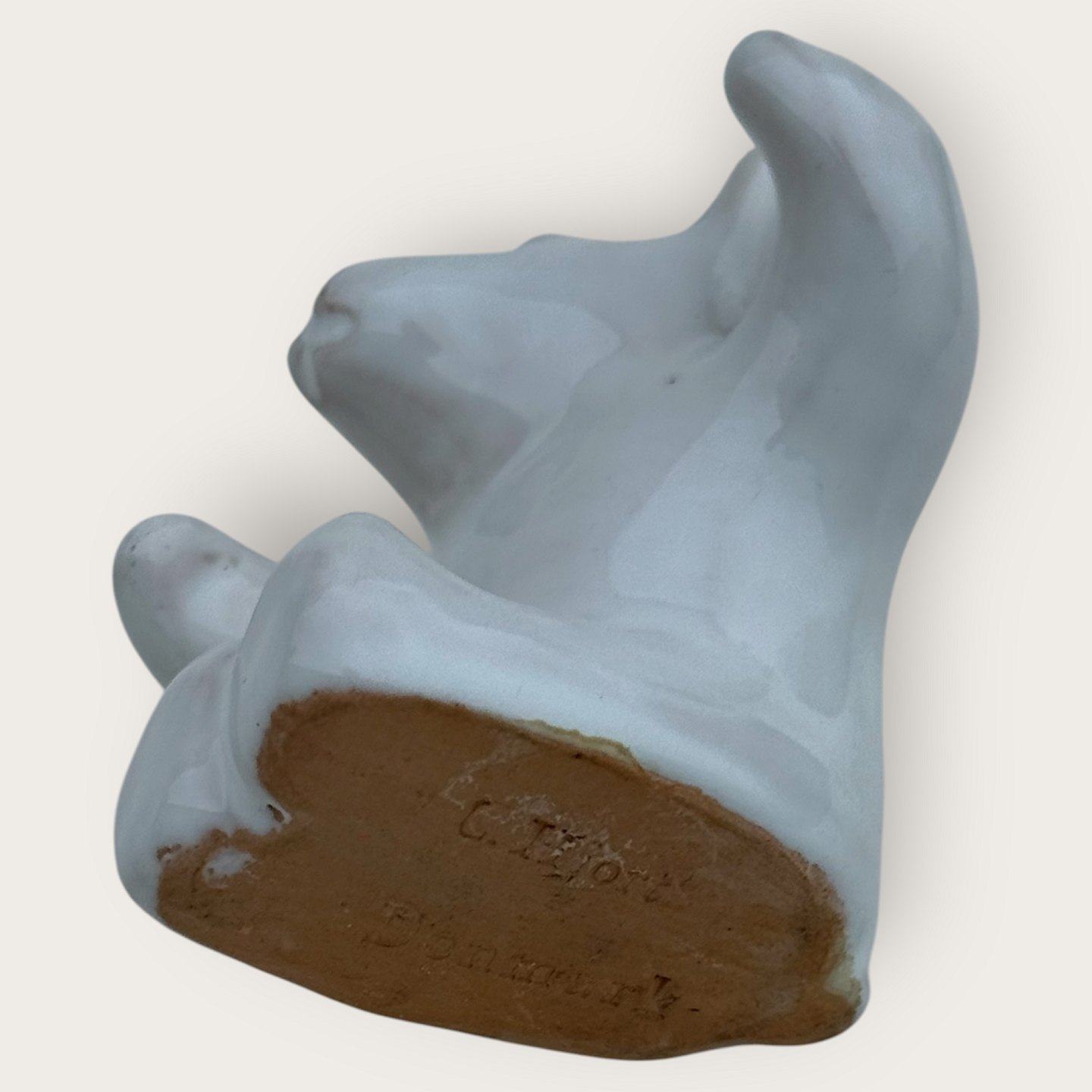Beskrivelse: Bornholmsk keramik, Hjorth, Bjørne orkester, Tilskuer, bjørn med hvid glasur, ca. 5,5x5,5cm *Pæn stand*