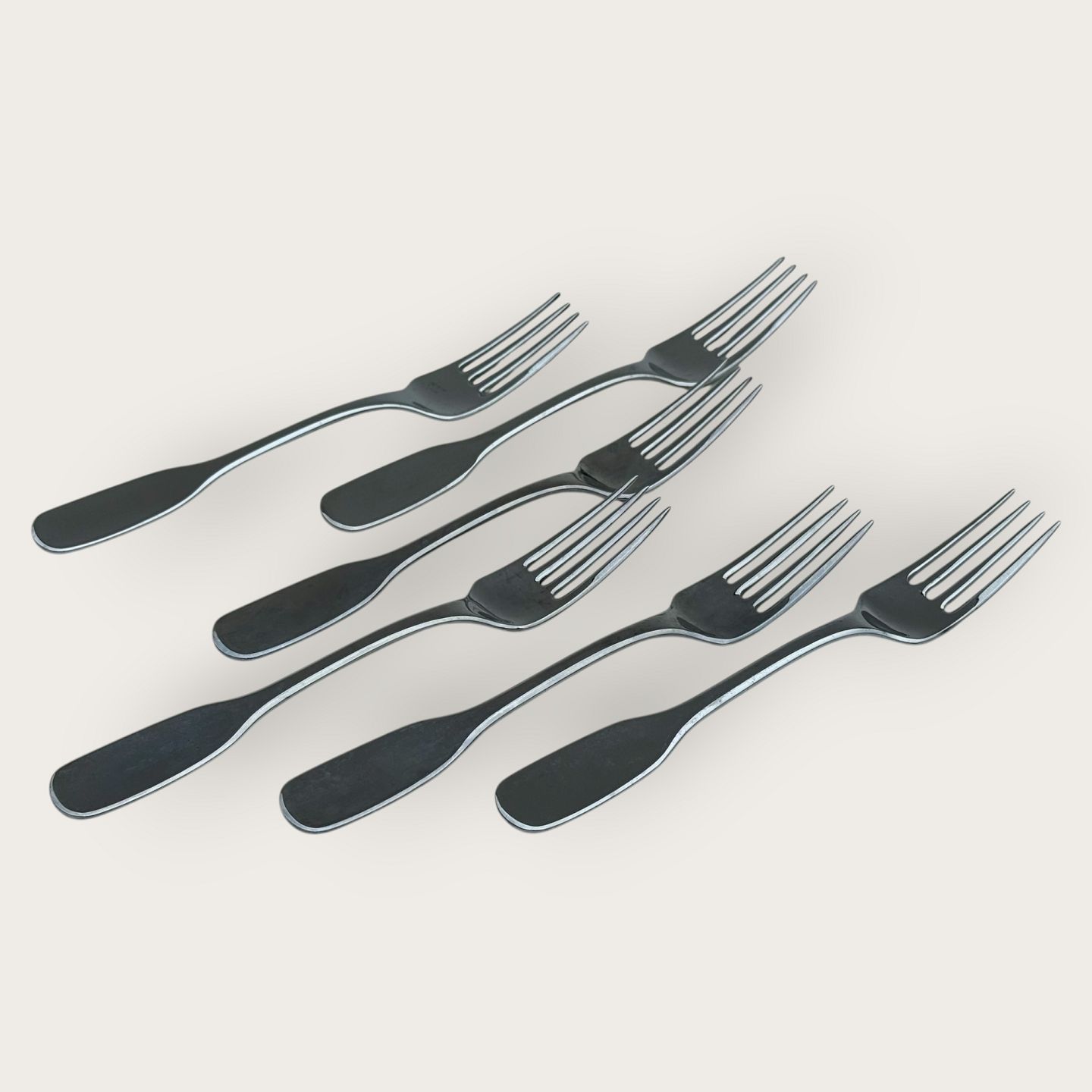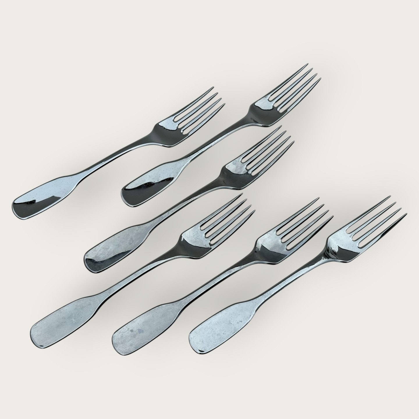 Beskrivelse: Hans Hansen sølvsmed, 6 gafler i rustfrit stål, 18cm lange *pæn brugt stand*