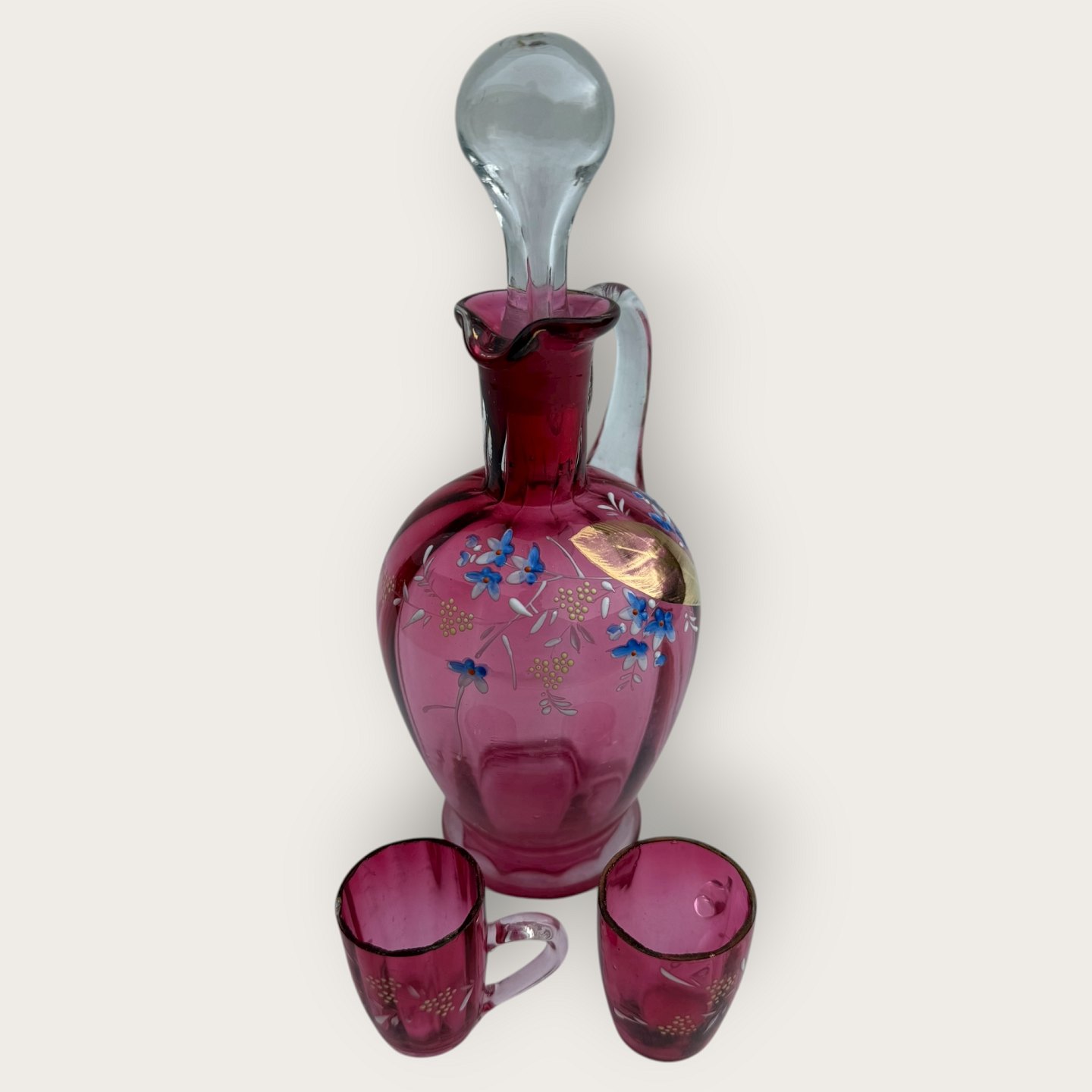 Beskrivelse: Ældre midteuropæisk karaffel i pinkfarvet glas med bemaling, medfølgende 2 glas, Karaffel ca. 21cm høj og 9cm bred, de to glas har meget små nøk i kanten, karaflen er i fin stand.