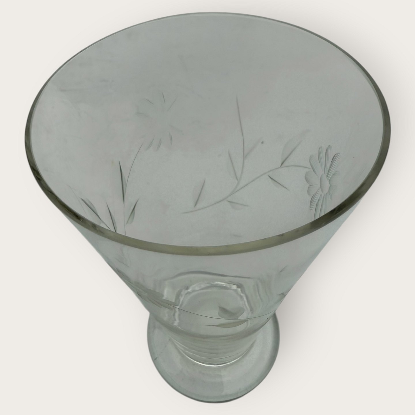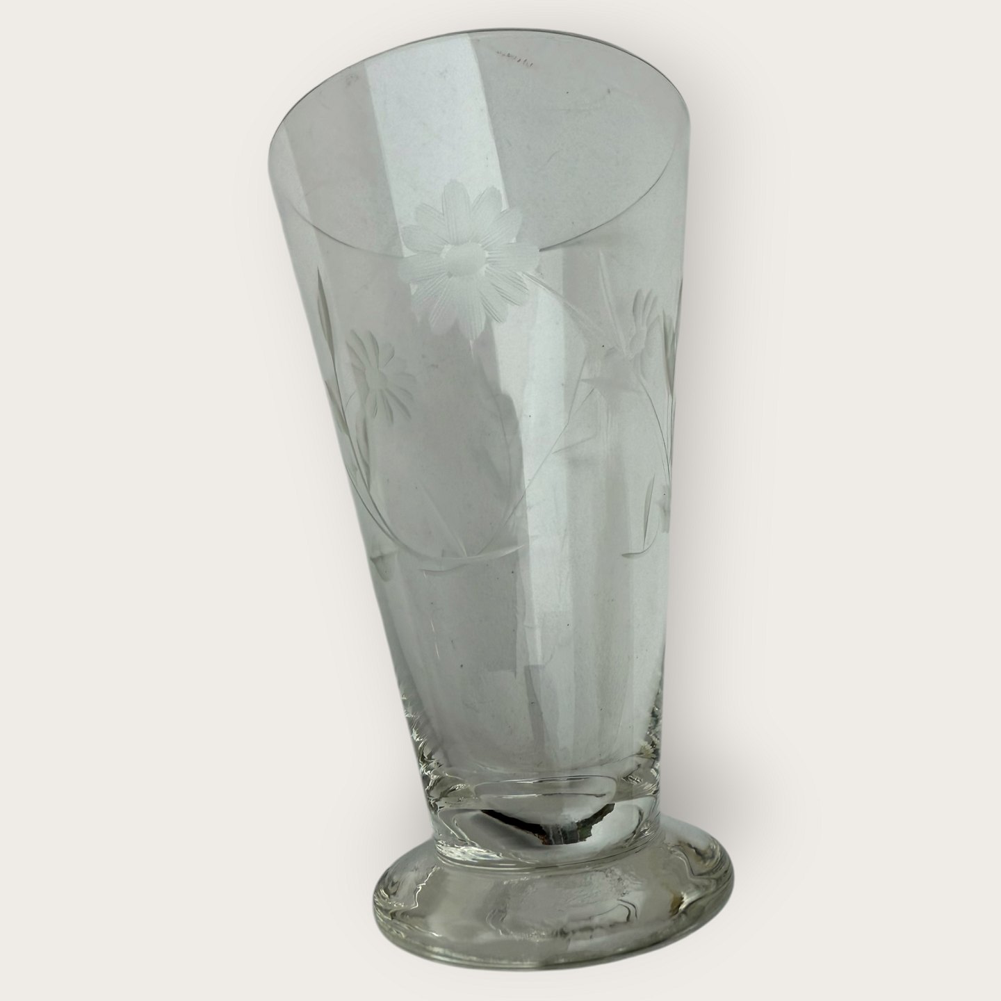 Beskrivelse: Vand / ølglas med blomsterslibninger, Højde 13,5cm, diameter 9cm *pæn stand*