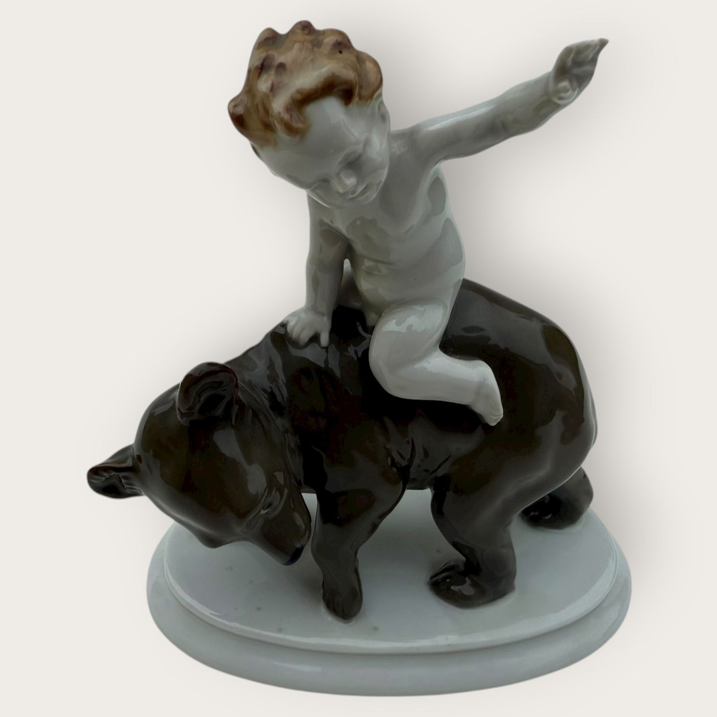 : Metzler & Ortloff, Dreng på bjørn, ca. 12x14,5cm *fin stand*