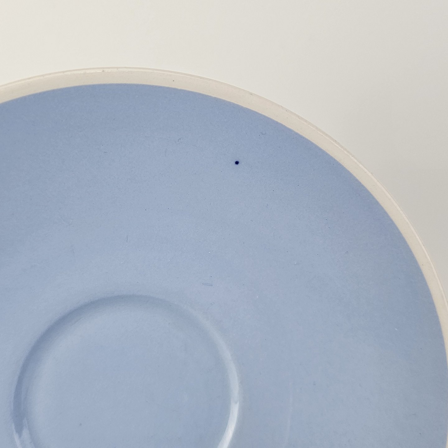 Fremstår med krakeleringer i glasuren og nister på underkoppen