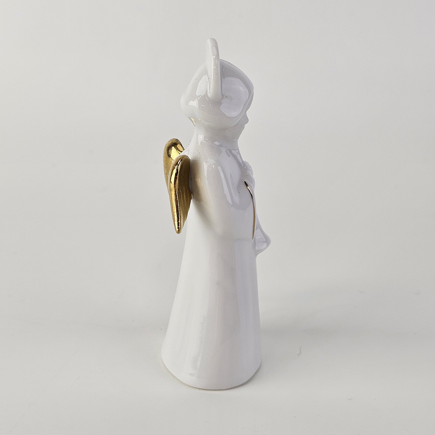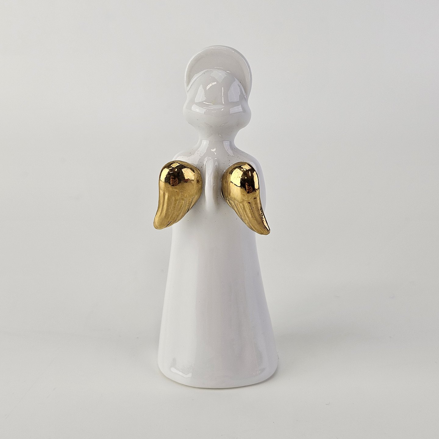 Beskrivelse: Figur med motiv af en engel som spiller på horn. Figuren er i hvidt porcelæn med forgyldte vinger og detaljer i 24 karat guld.