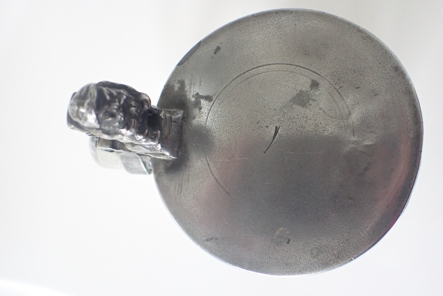 Beskrivelse: Nisse ølkrus - klart riflet glaskrus med hank og med tinlåg. Studsen på tinlåget er udformet som en nisse med rygsæk og stav. Tyskland ca. 1880. 1 liter. Højde med låg u. studs: 13,2 cm. Med studs: 17 cm. I pæn stand i forhold til alder.