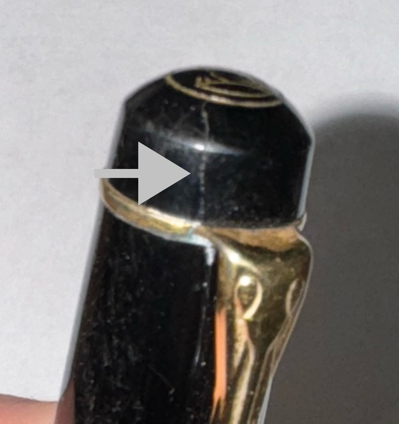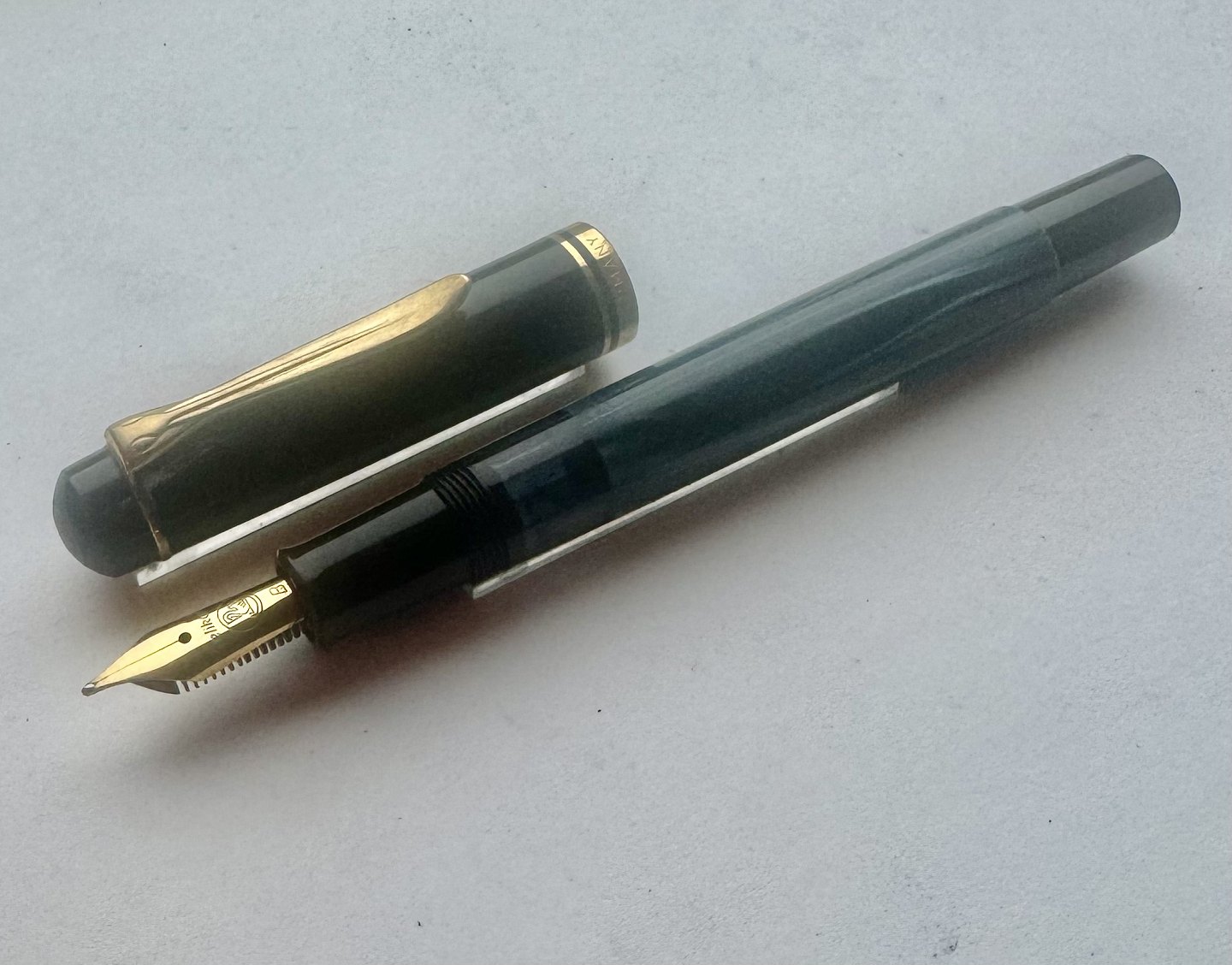 Beskrivelse: Pelikan M200 fyldepen. Fremstillet i Vest-Tyskland i 1970’erne. Den lille kapsel med logo på toppen af hætten har en revne (se foto). Eller i god funktionsduelig stand.