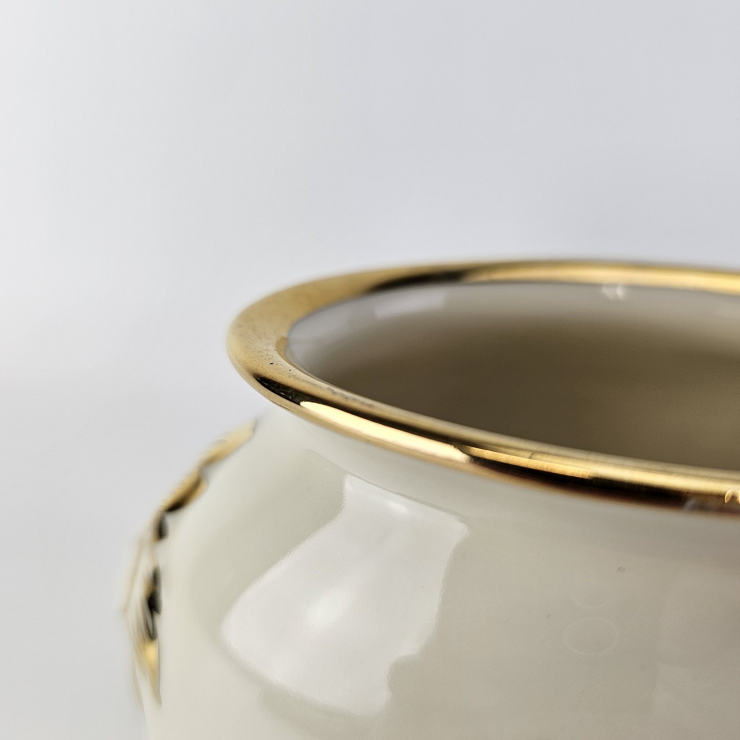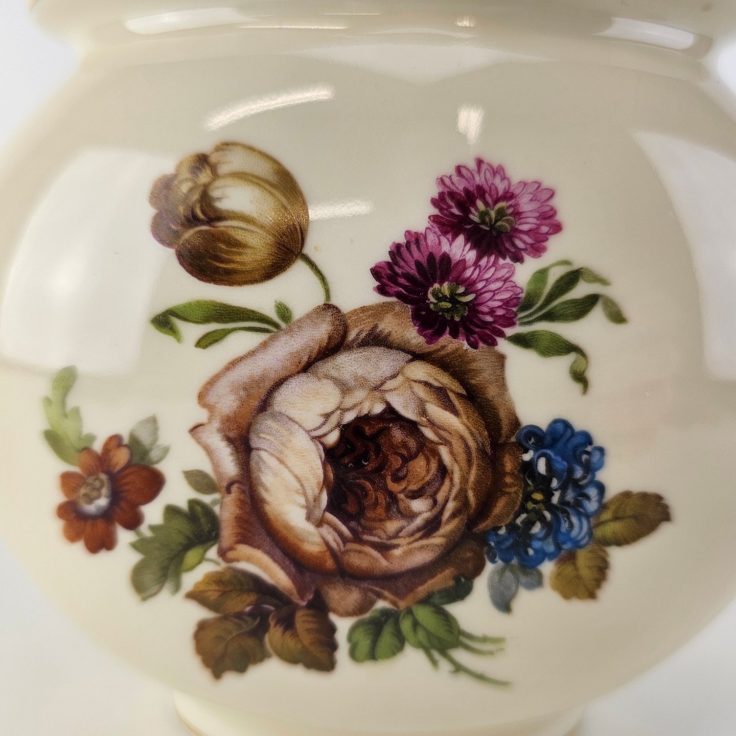 Beskrivelse: Rosenborg oval vase i cremefarvet porcelæn med guldkant og blomstermotiv