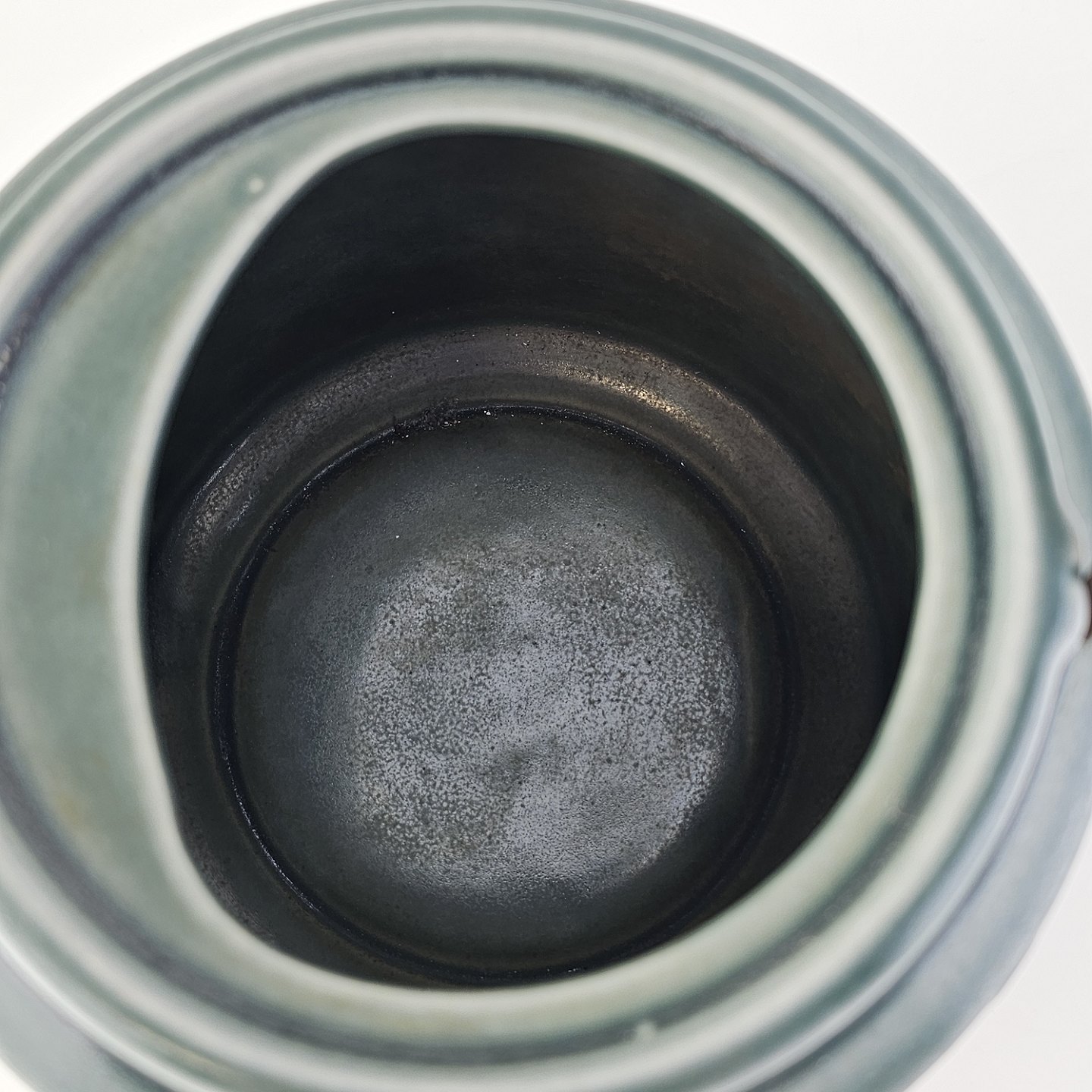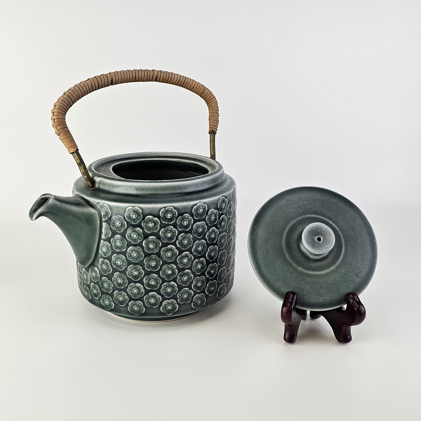Stel i blågrønt stentøj med blomster motiver og håndtag i messing beklædt med bambusflet