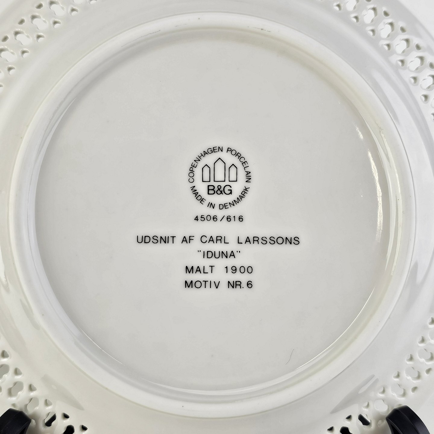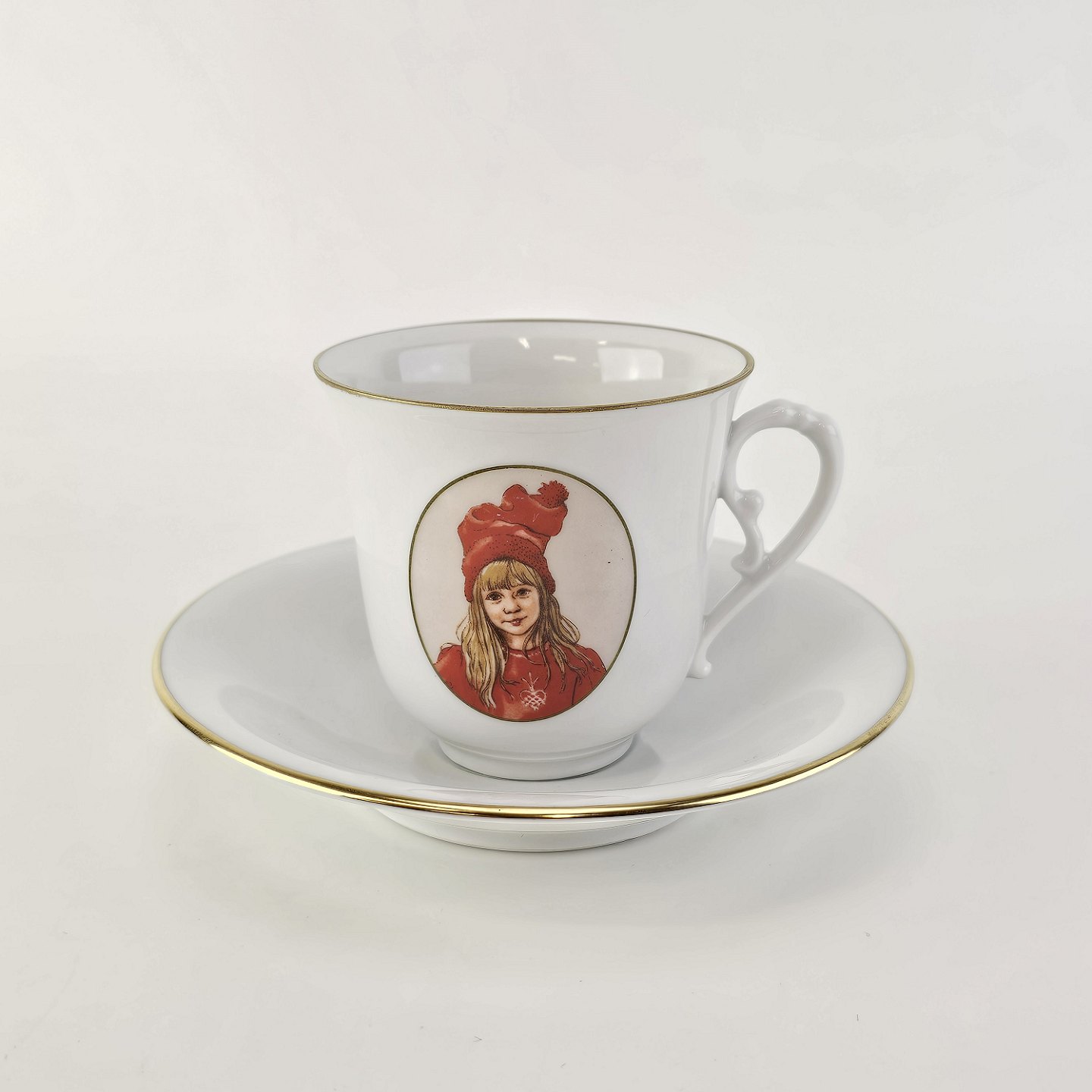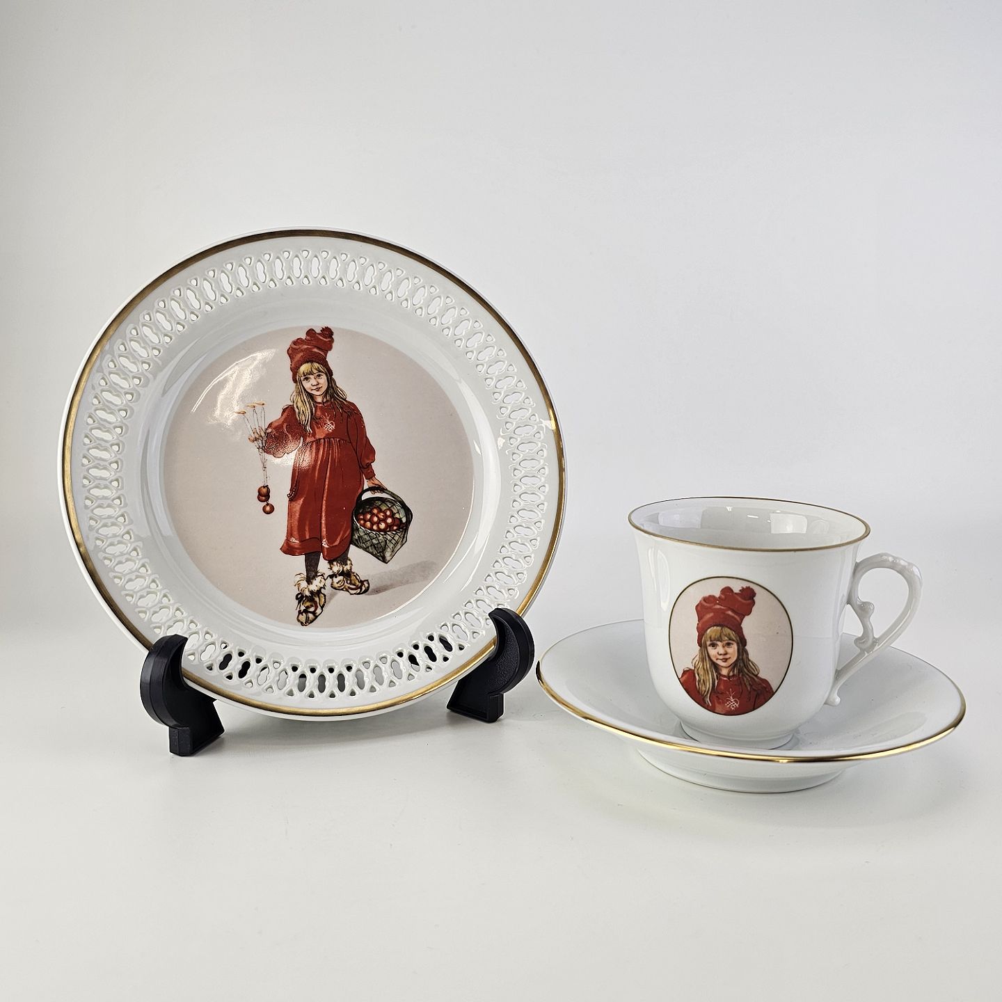 Beskrivelse: Kop med underkop i porcelæn med guldkant og platte i porcelæn med guldkant og udsnit af Carl Larsson malt 1900, fra Carl Larsson kaffestellet.