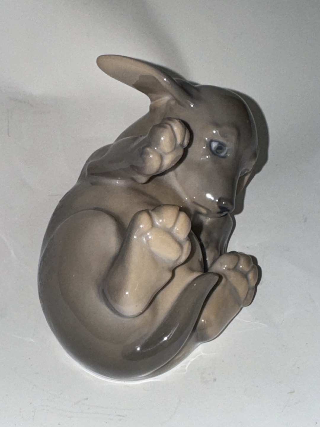 Beskrivelse: CHARMERENDE FIGUR AF LILLE HUND: Royal Copenhagen, Gravhund. Designet af Oluf Mathiesen. Modelnummer 1408, 1. sortering. Fremstår i god stand. Fabriksmærket på bunden. 11 cm lang.