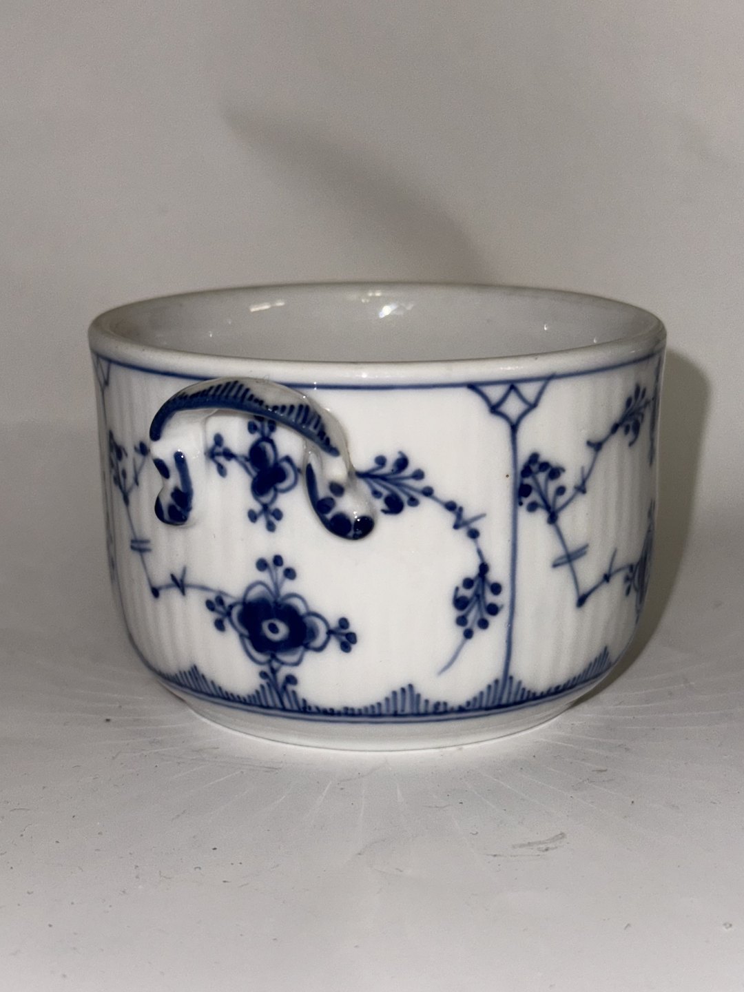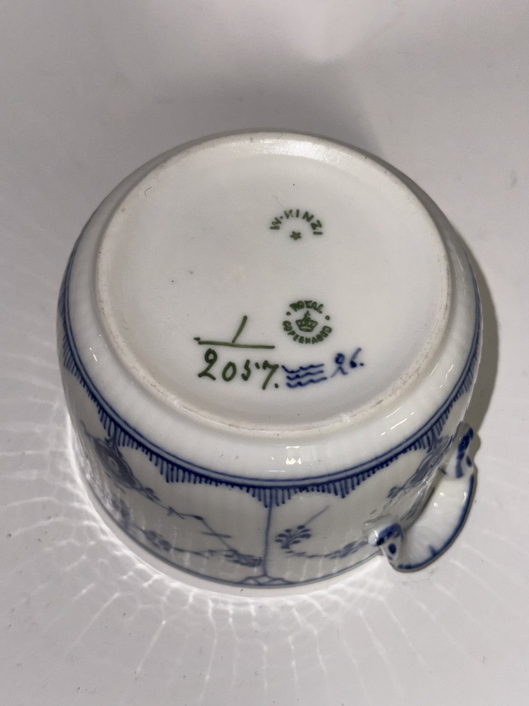 Description: Extremely rare sugar bowl from Royal Copenhagen with blue fluted decoration. Made between 1900-23. In good condition. Factory first quality. Small factory logo/name stamped on the bottom. Model number 1/2057. Dimensions: H. 6.2 cm Ų. 9 cm