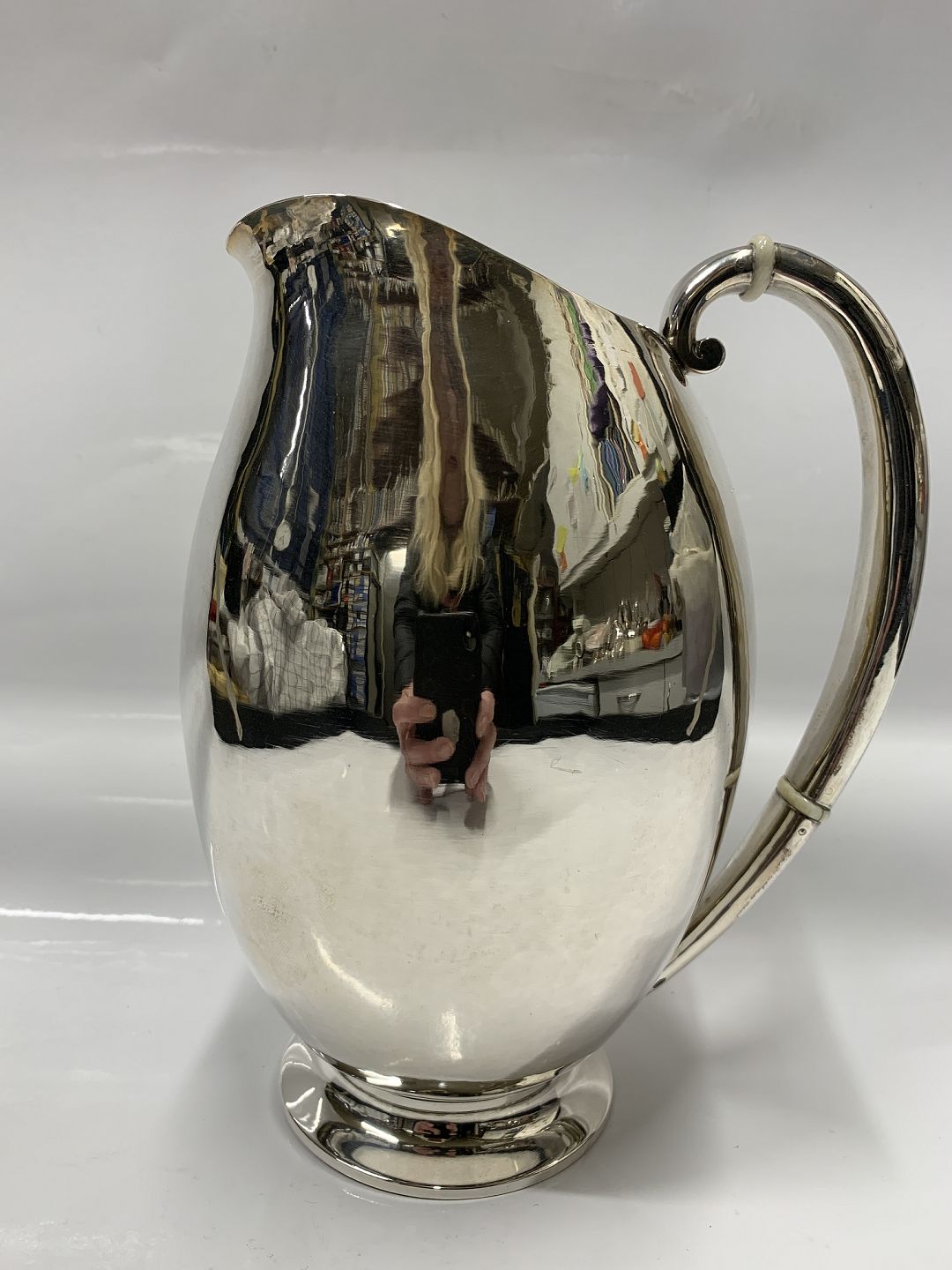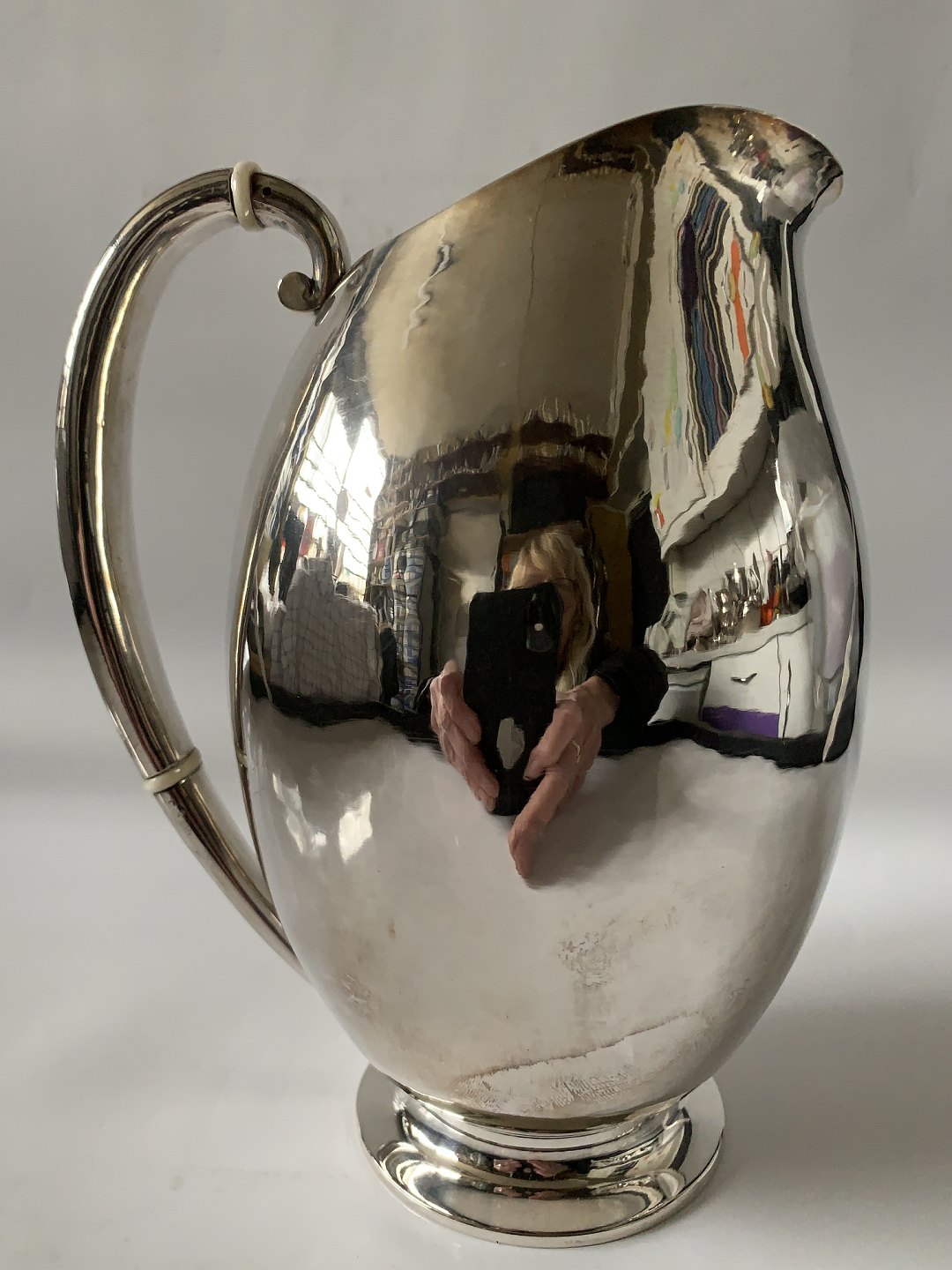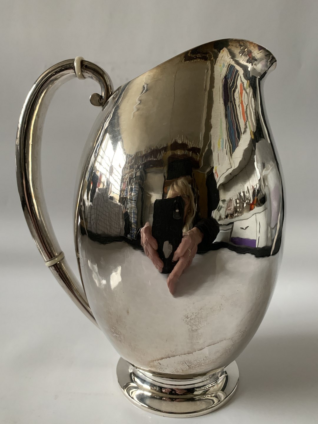 Beskrivelse: Evald Nielsen sølv kande hammerslået .