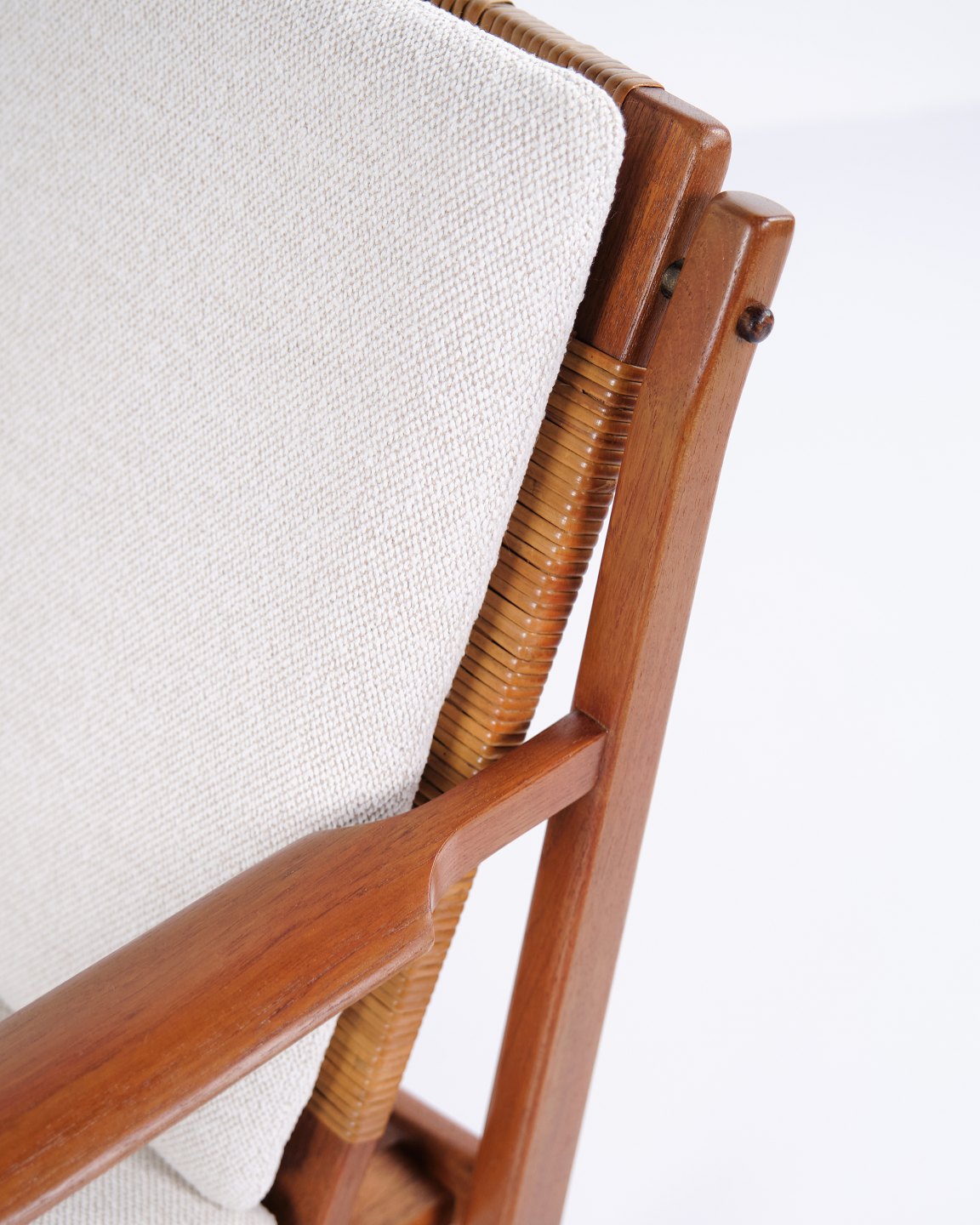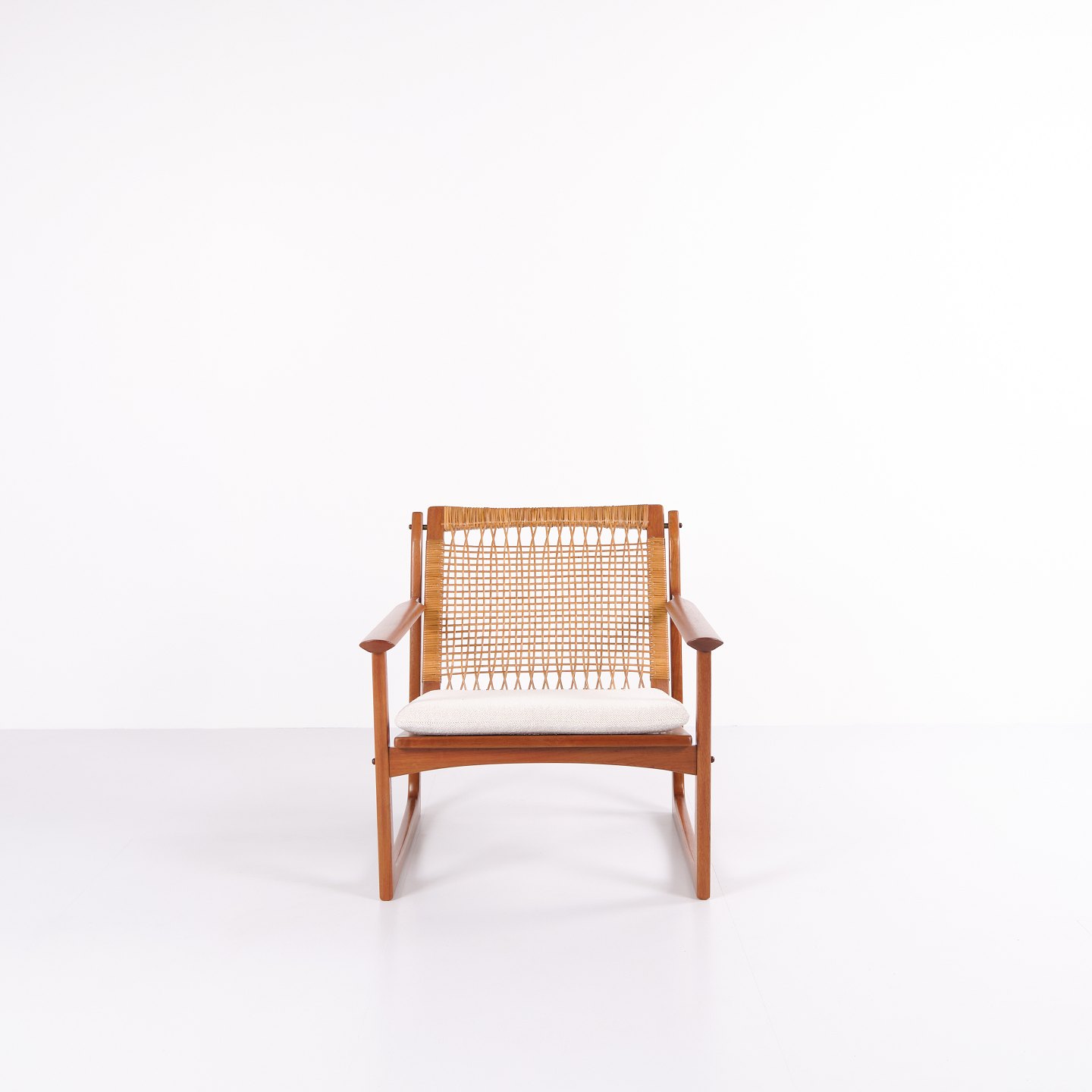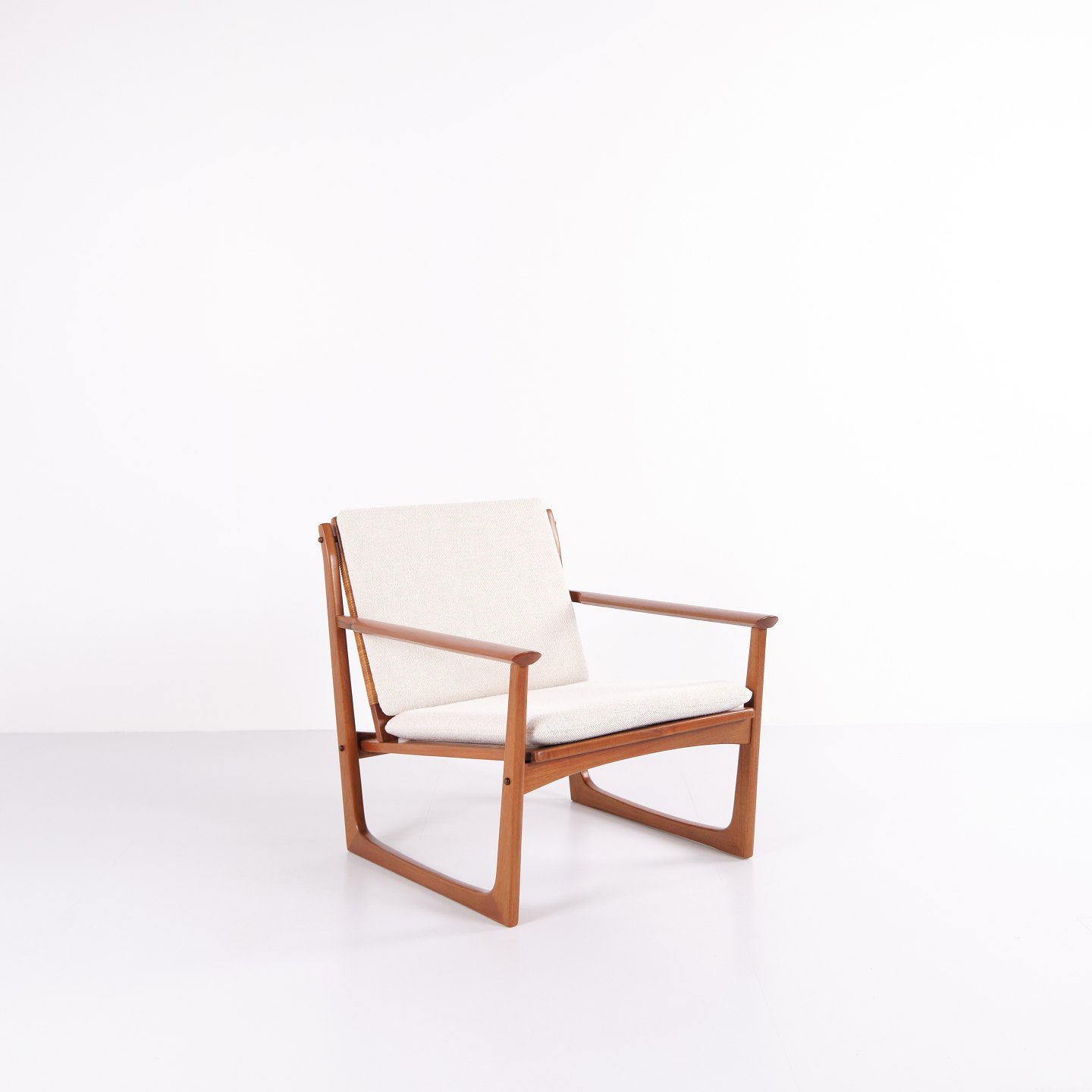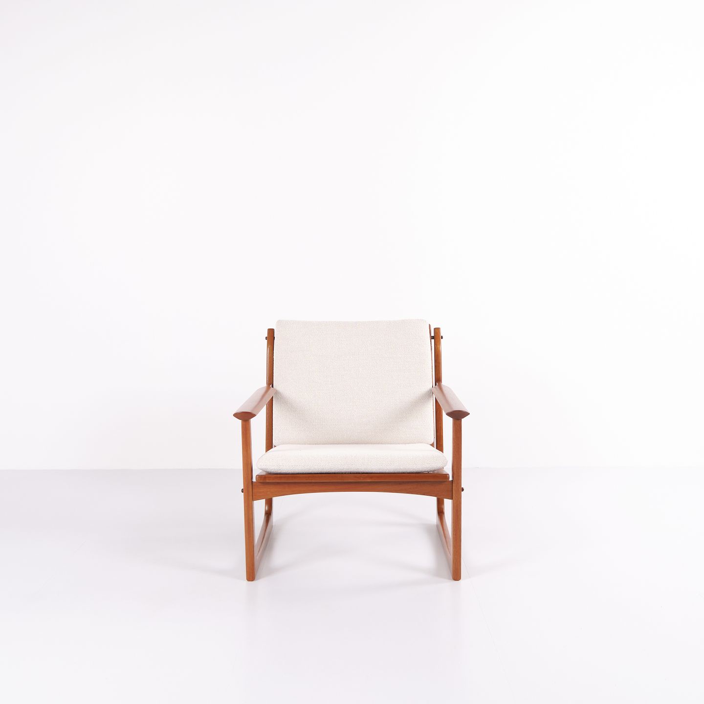 Beskrivelse: Lænestol designet af Hans Olsen og produceret af Selig i 1960’erne. Stolen er udført i massiv teaktræ med smukt formede armlæn og ben, betrukket med lyst stof, der fremhæver det varme træ og det harmoniske formsprog.