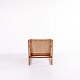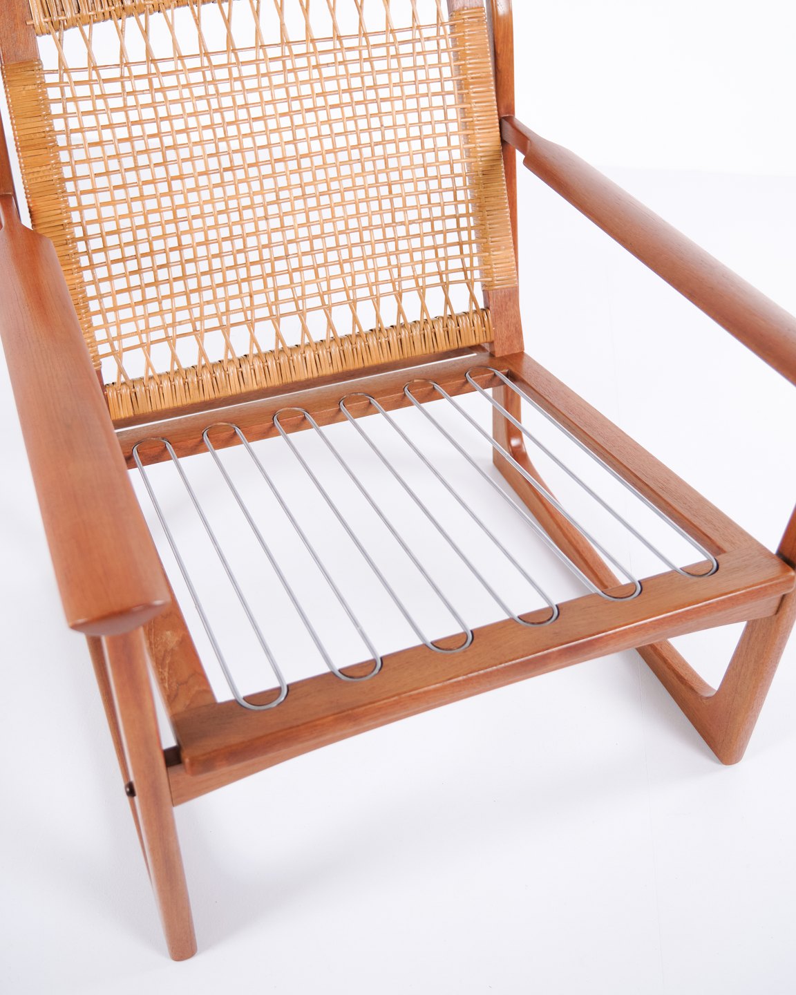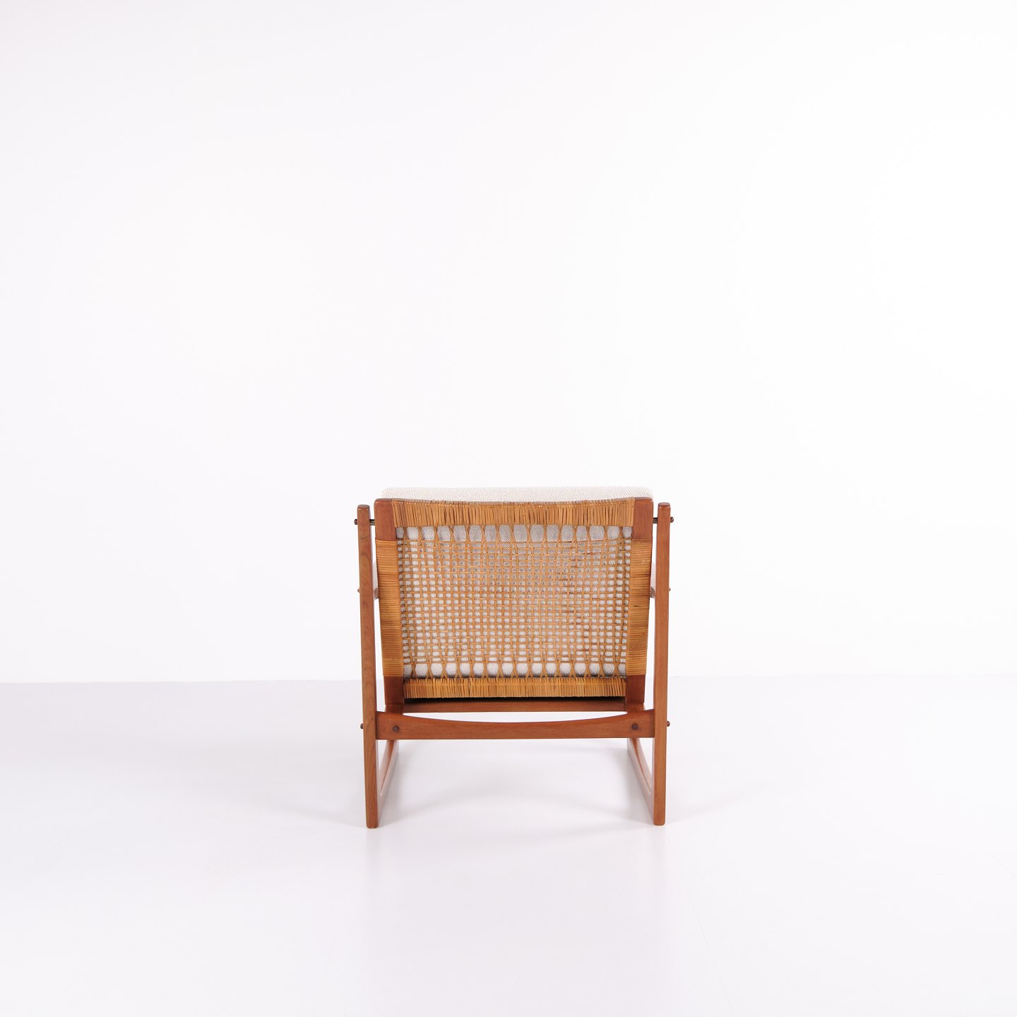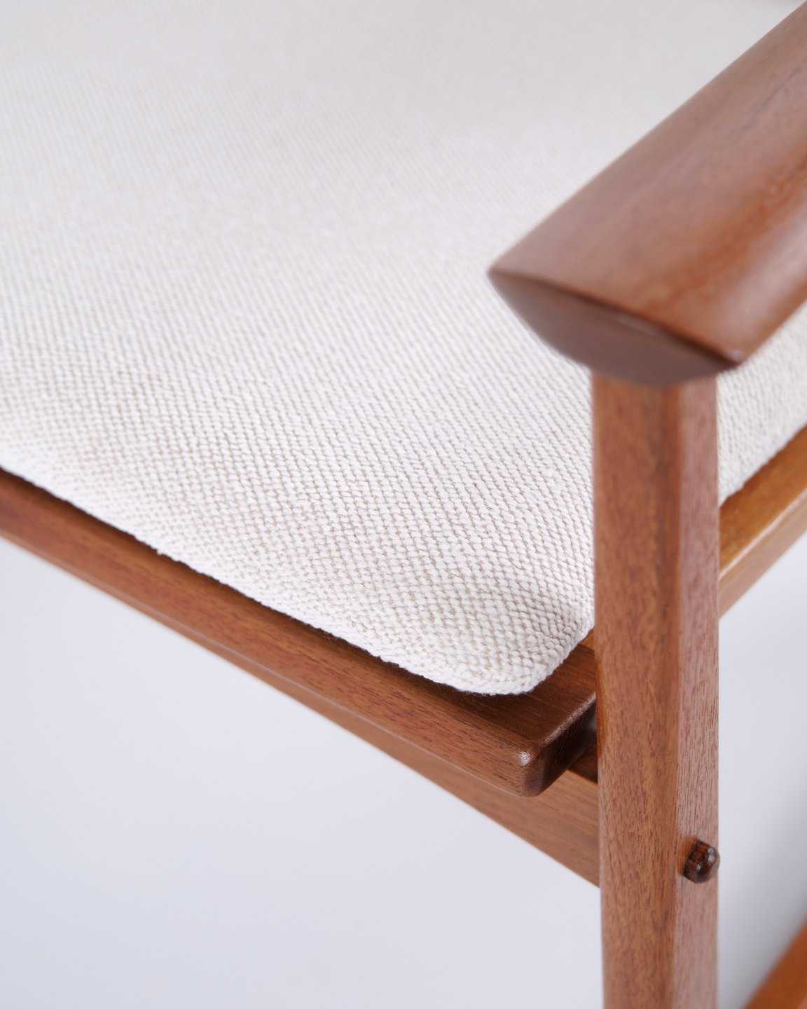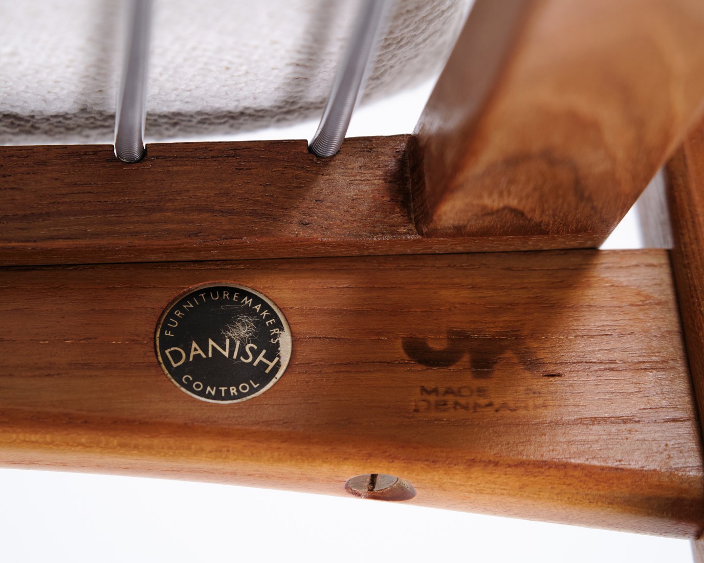 Beskrivelse: Lænestol designet af Hans Olsen og produceret af Selig i 1960’erne. Stolen er udført i massiv teaktræ med smukt formede armlæn og ben, betrukket med lyst stof, der fremhæver det varme træ og det harmoniske formsprog.