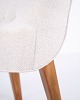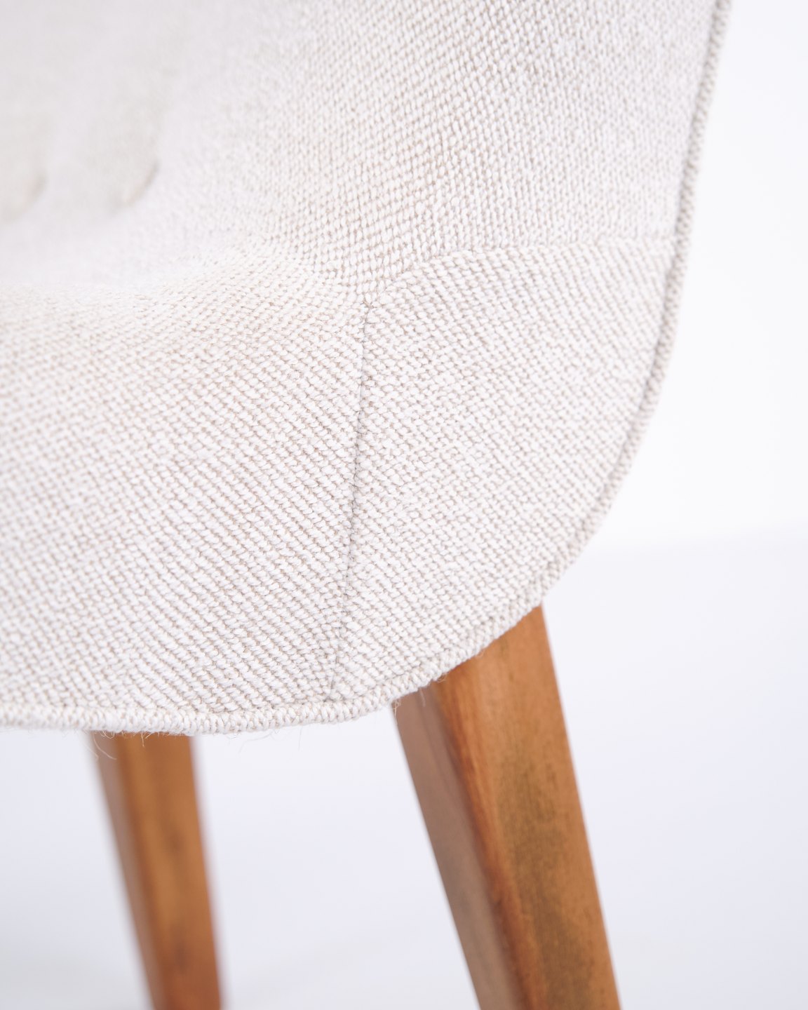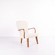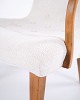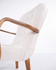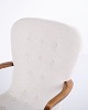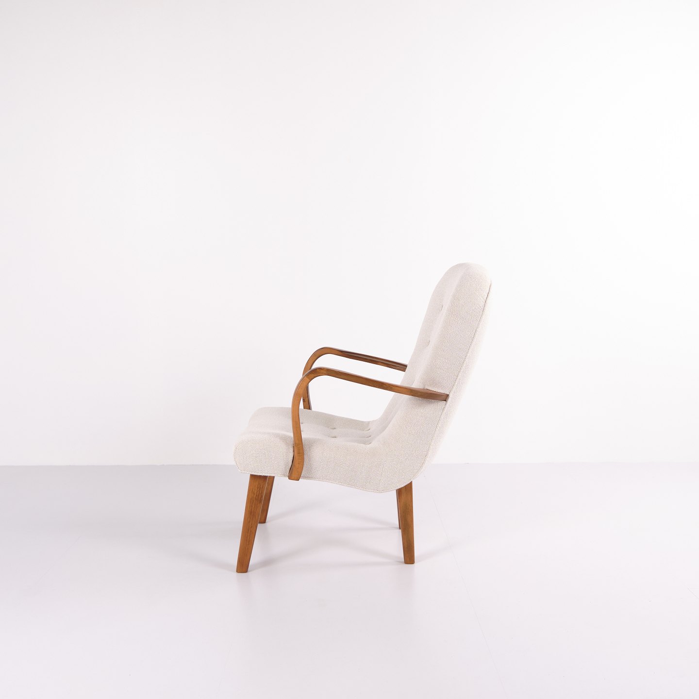 Beskrivelse: Klassisk lænestol fra 1940’erne, betrukket med lyst stof og udført i et tidstypisk, afrundet formsprog. Stolen har en elegant, opret ryg og let buede armlæn. Designet af Alfred Christiansen