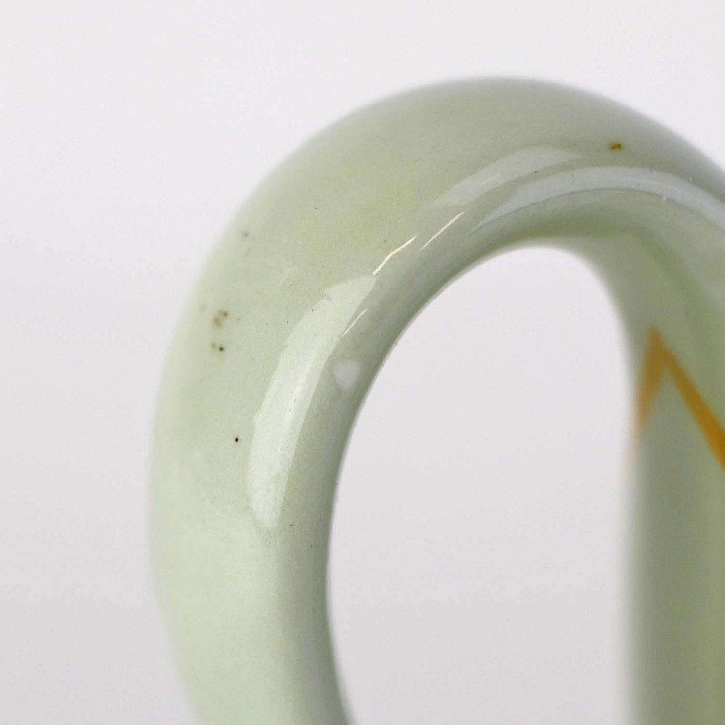 Fremstår med ujævnhed i glasuren på indvendigside og brugsspor ved topkanten og hanken