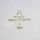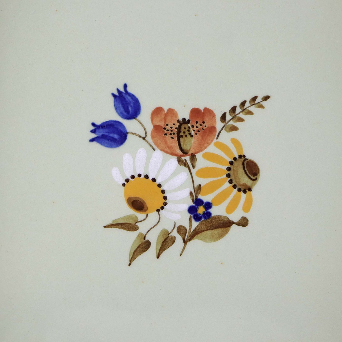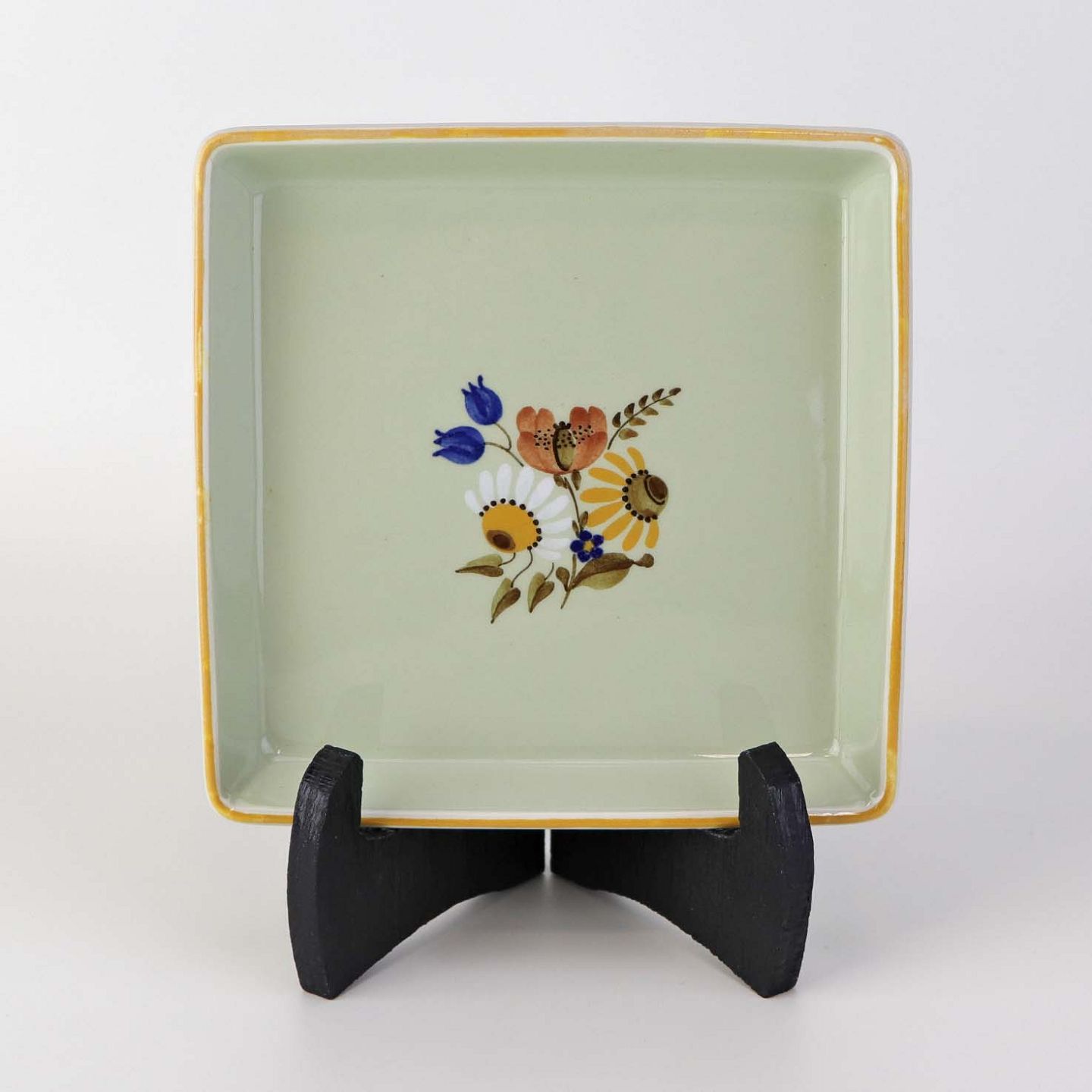 Beskrivelse: Mindre firkantet fad i fajance fra stellet Frederiksberg.