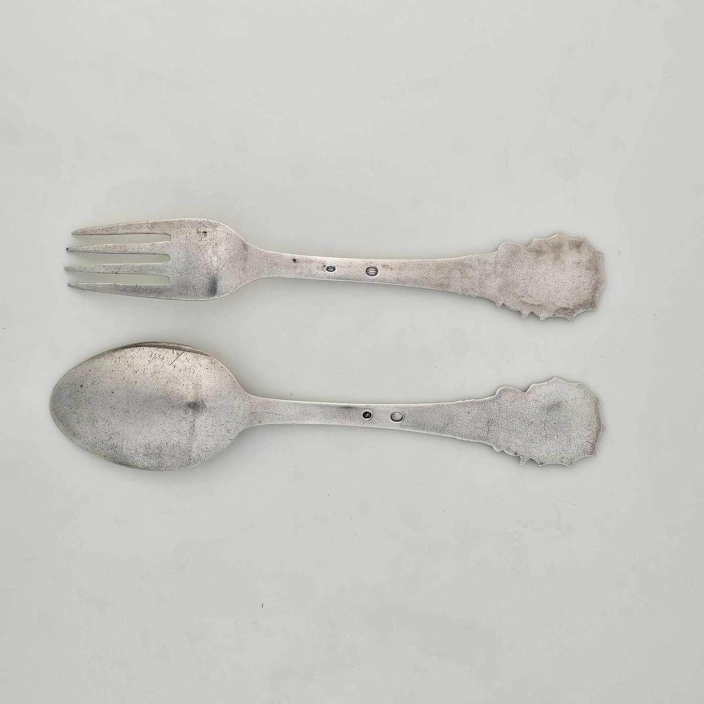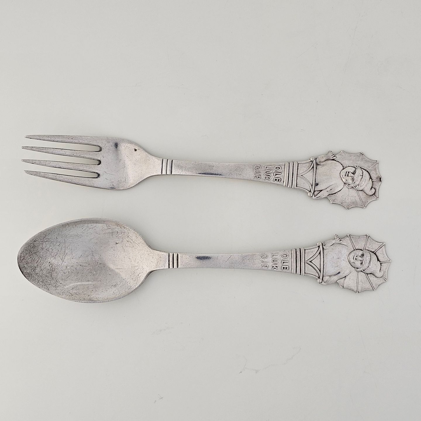 Beskrivelse: Gaffel og ske i tretårnet sølv med motiv af Ole Lukøje
