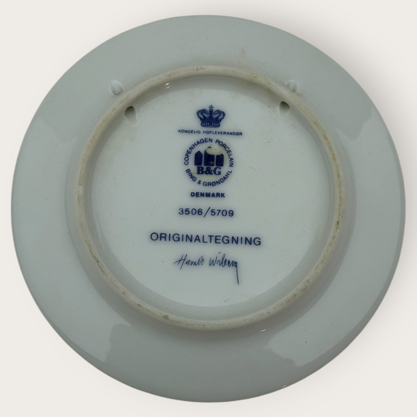 Beskrivelse: Bing & grøndahl, Julestel, Nissen og katten ved døren, Asiet med guldkant #3506 / 5709, 10,5cm i diameter, 2.sortering, Design Harald Wiberg *Pæn stand*