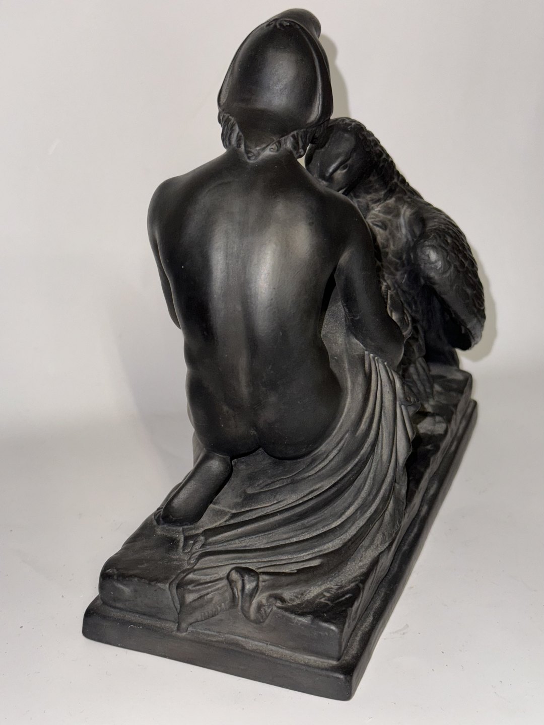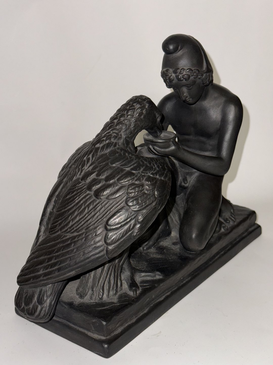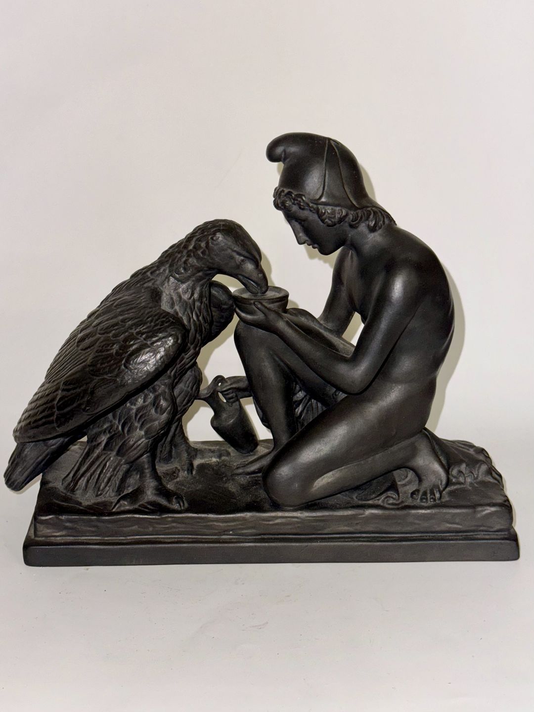 Beskrivelse: Figur i keramik (sort basalt) forestillende Ganymedes med Jupiters ørn af Bertel Thorvaldsen (1770-1844) Formgivet i Rom 1817-18. Denne kopi fra den københavnske lervarefabrik Peter Ipsen, er fremstillet omkring 1900. Ifølge den græske mytologi bortfører Jupiters ørn Ganymedes for at for at gøre ham til gudernes mundskænk (tjener). Fabriksmærket på bunden med P. Ipsen, KJØBENHAVN ENERET samt model nummer 349. Mål: H. 19 cm. Basen måler 9 x 22,5 cm