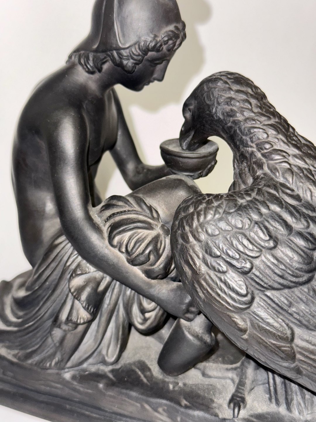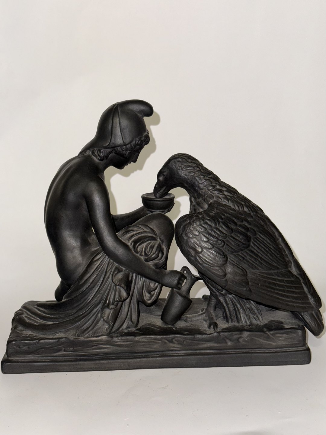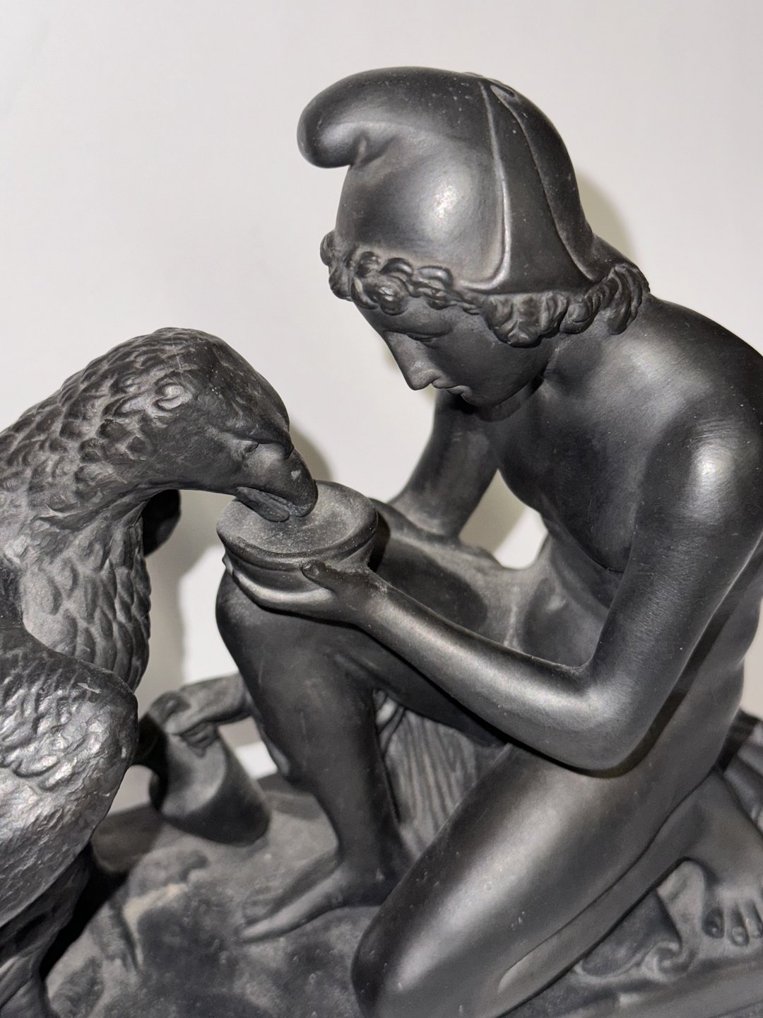 Beskrivelse: Figur i keramik (sort basalt) forestillende Ganymedes med Jupiters ørn af Bertel Thorvaldsen (1770-1844) Formgivet i Rom 1817-18. Denne kopi fra den københavnske lervarefabrik Peter Ipsen, er fremstillet omkring 1900. Ifølge den græske mytologi bortfører Jupiters ørn Ganymedes for at for at gøre ham til gudernes mundskænk (tjener). Fabriksmærket på bunden med P. Ipsen, KJØBENHAVN ENERET samt model nummer 349. Mål: H. 19 cm. Basen måler 9 x 22,5 cm