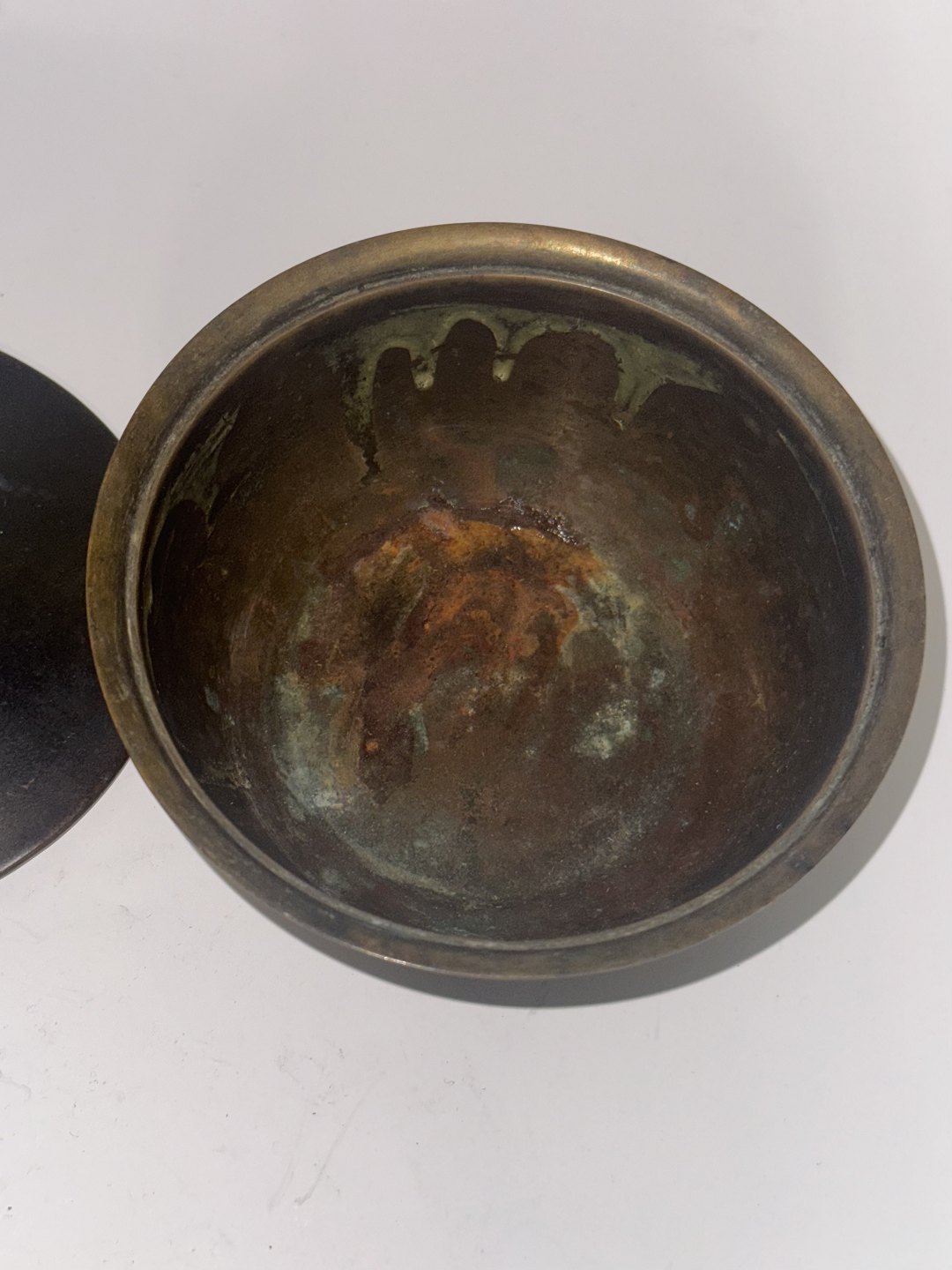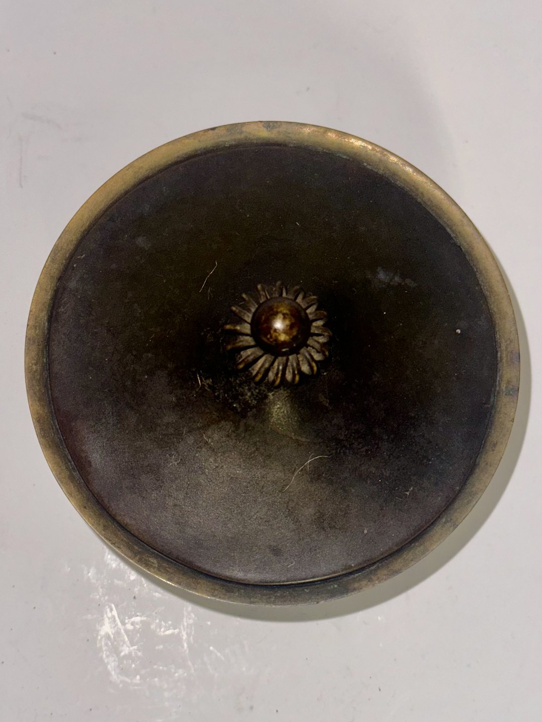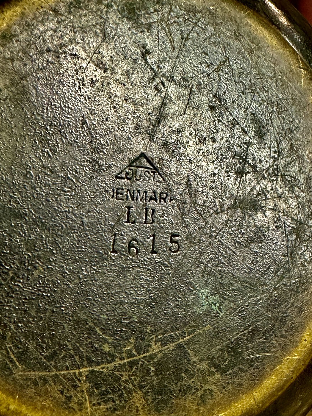 Beskrivelse: Bronzepatineret just Andersen skål. Fremstår i god stand med almindelige brugsspor. Fremstillet omkring 1940. Fabriksmærket på bunden med det velkendte fabrikslogo, modelnummer 1615 samt LB, der står for Let Bronce. H. 7 cm Ø. 11 cm
