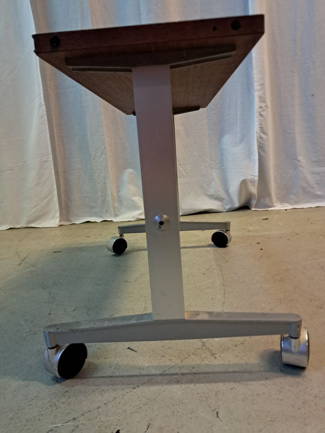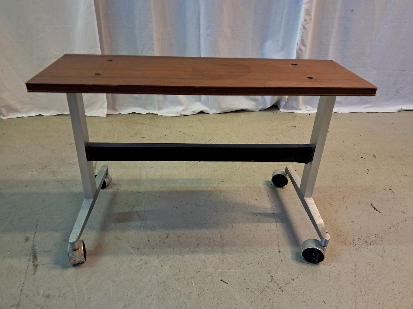 Beskrivelse: Bord i aluminium med fineret plade i teaktræ, fra 1980erne.