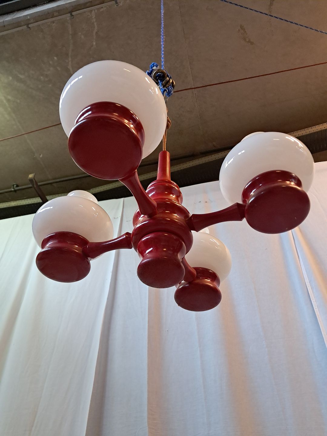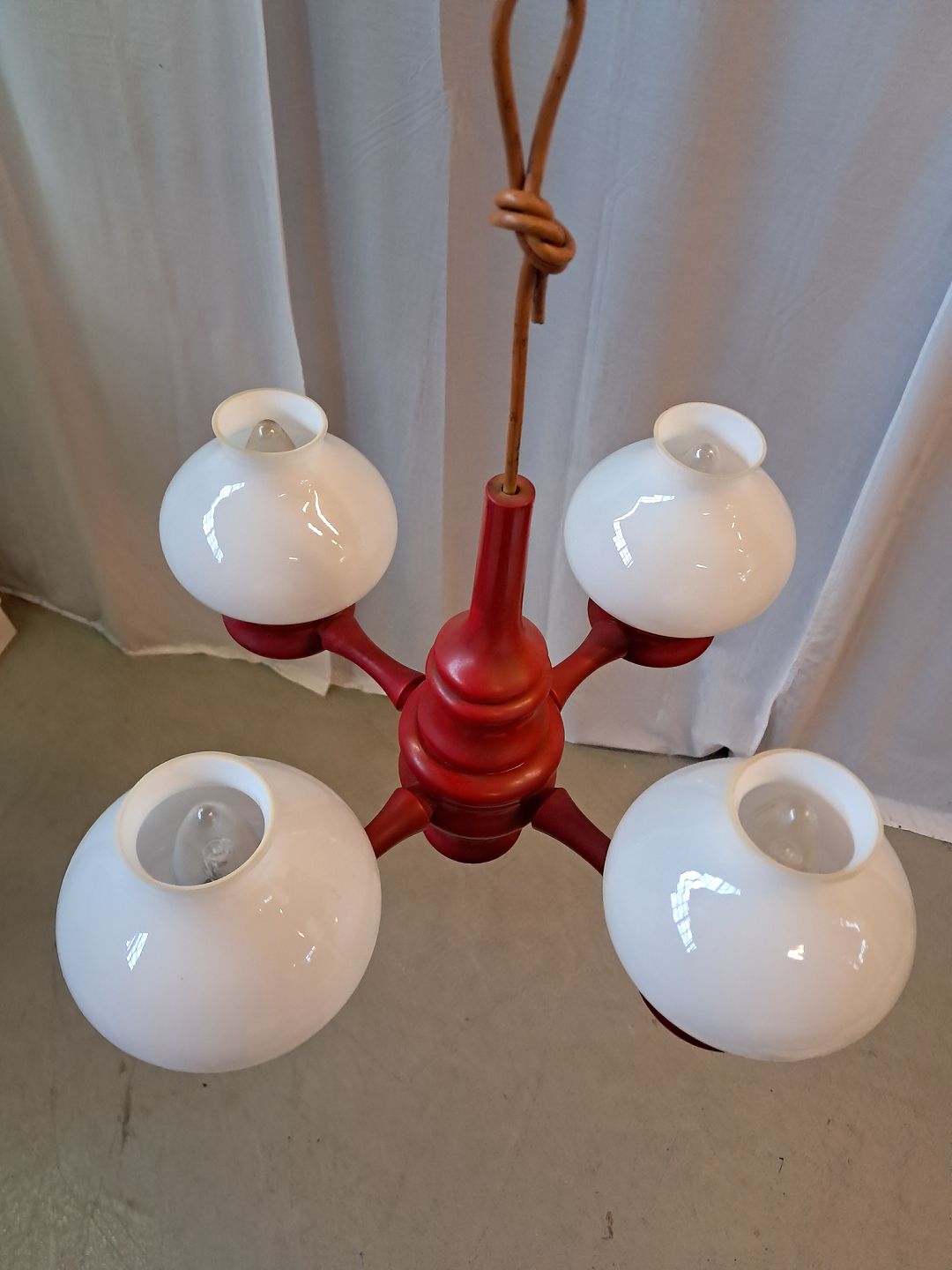 Beskrivelse: Malet loftlampe med 4 glasskærme, fra 1980erne.