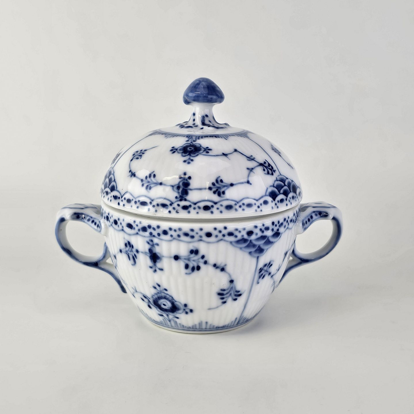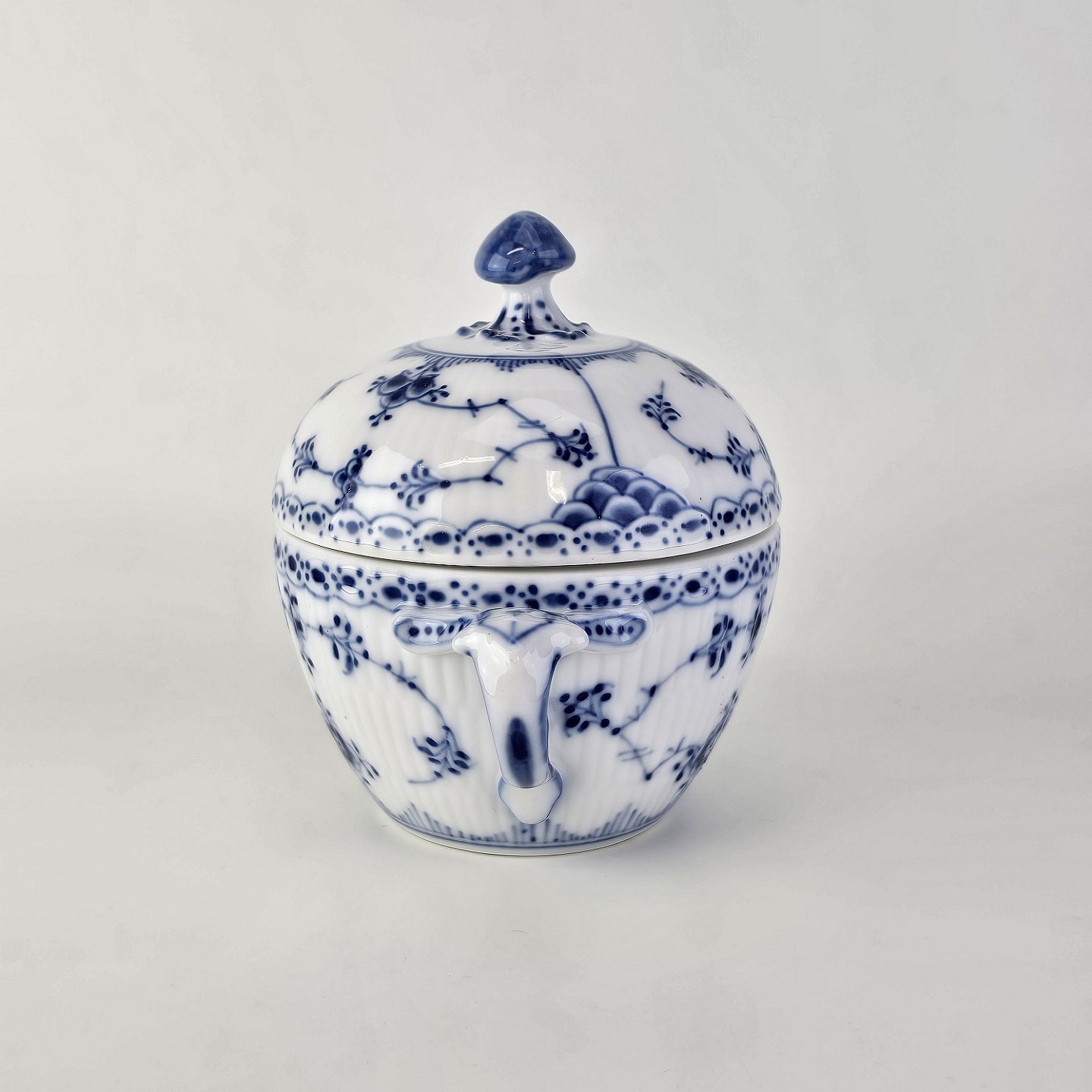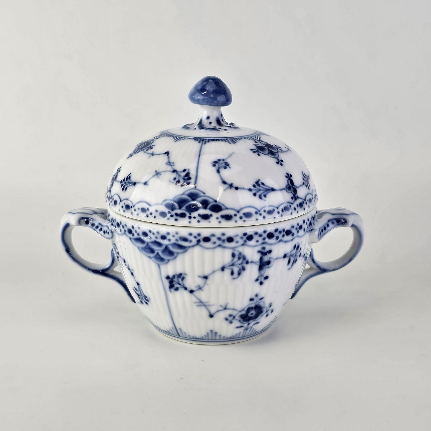 Beskrivelse: Sukkerskål i kongeligt porcelæn fra stellet Musselmalet Halvblonde