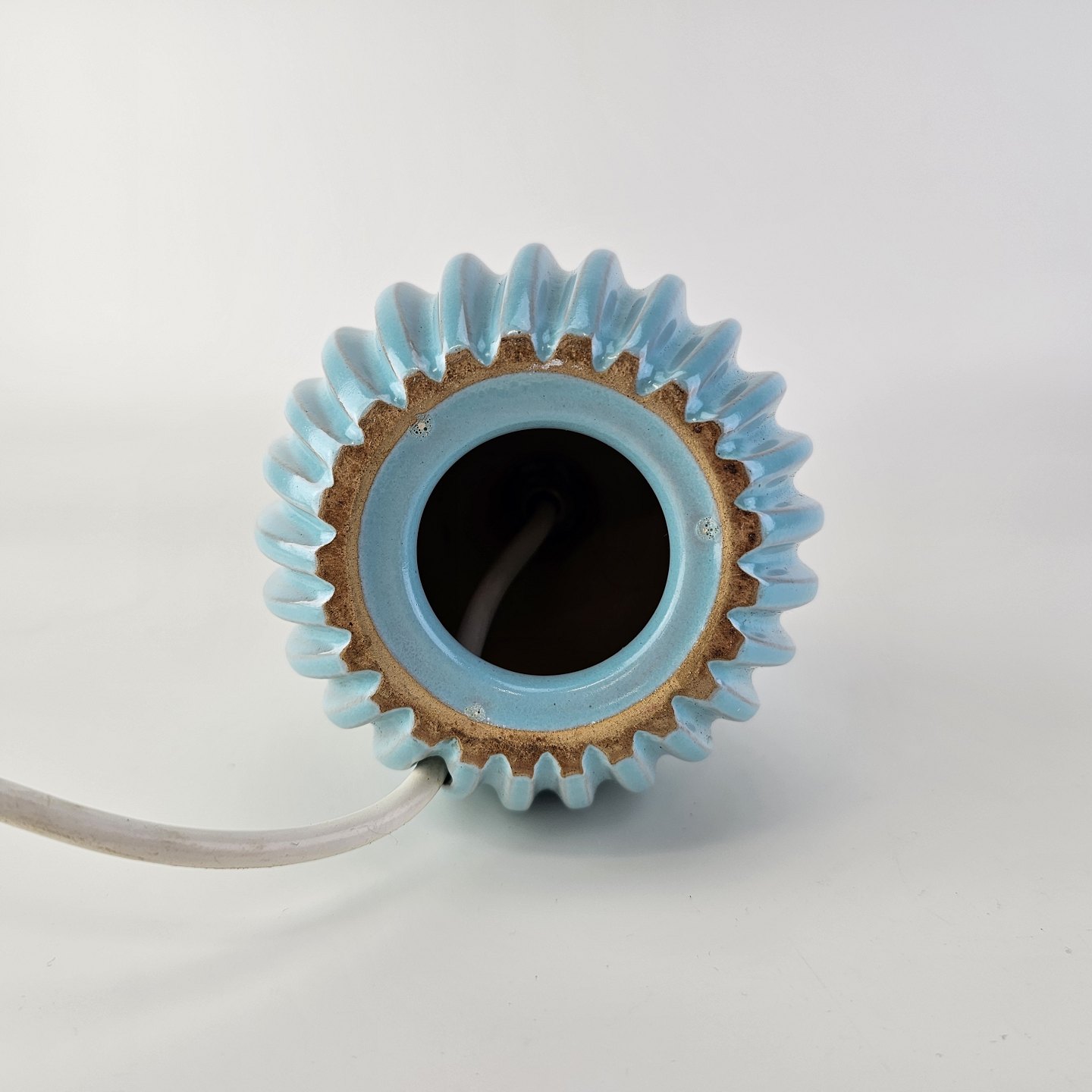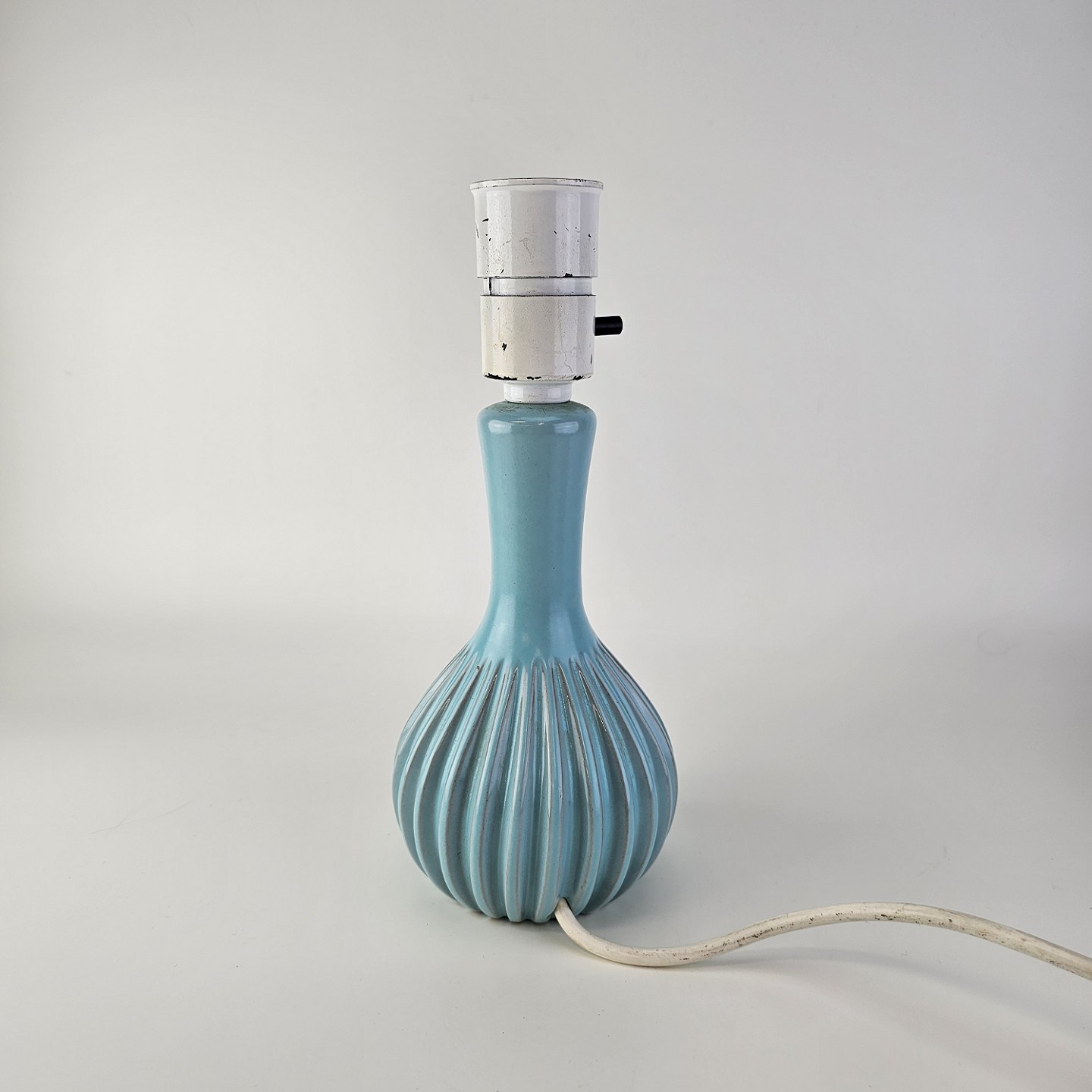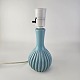 Beskrivelse: Rund bordlampe i rillet grønblå keramik med hvid fatning