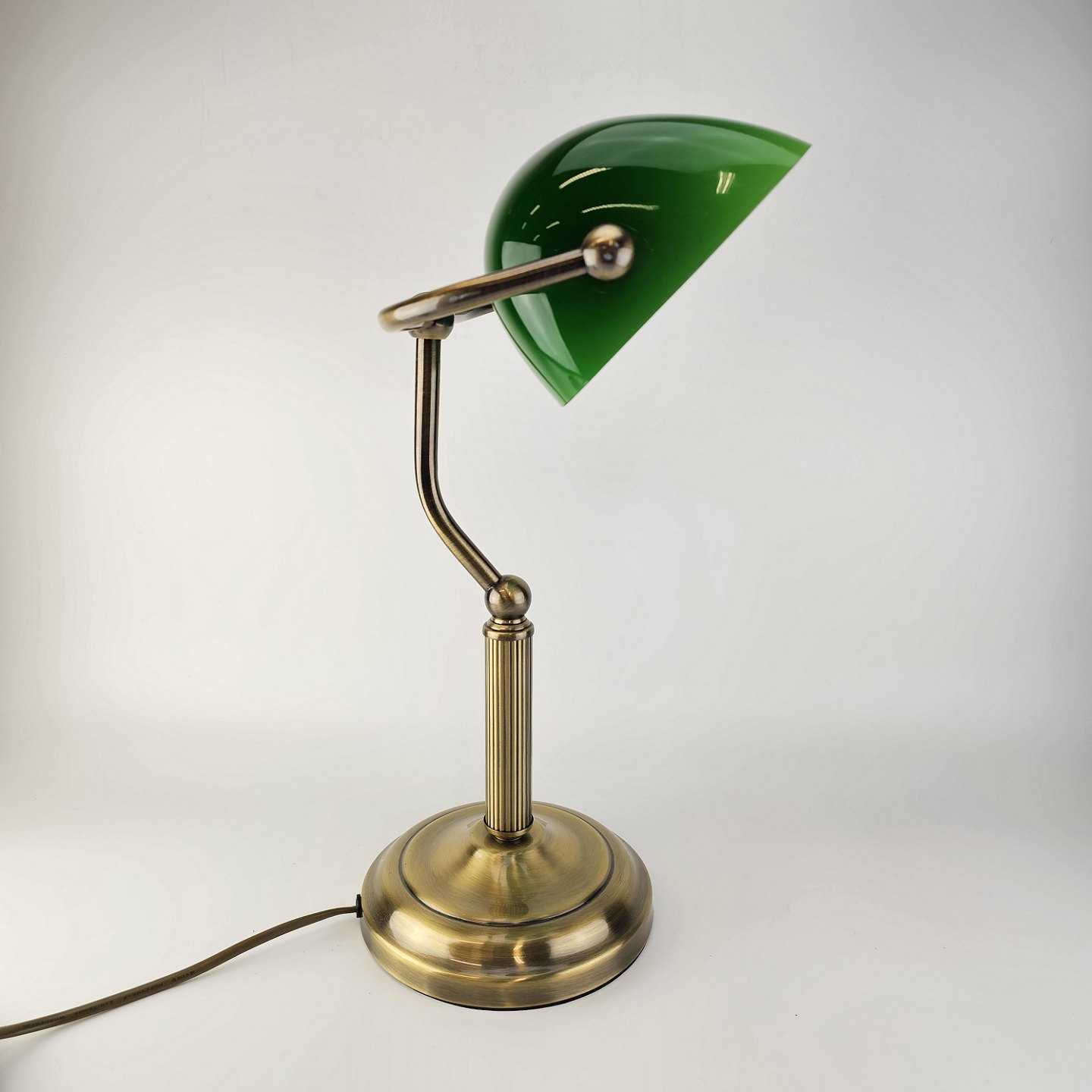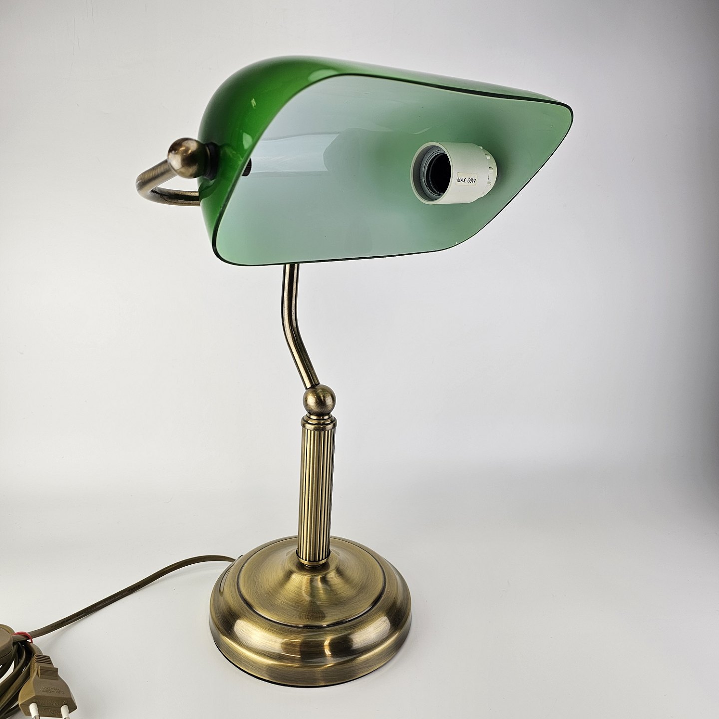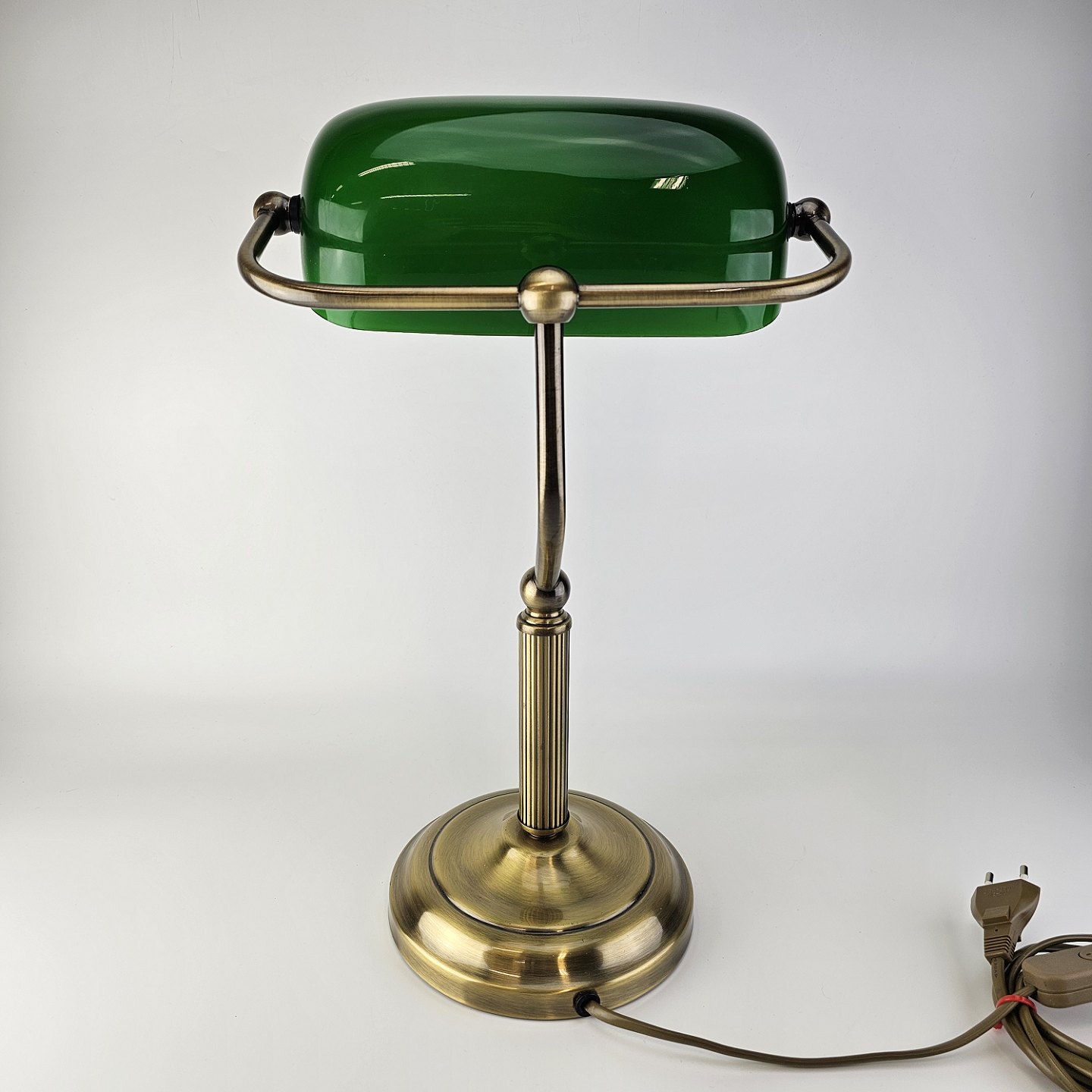 Beskrivelse: Bordlampe med fod i messing og skærm af grønt/hvid glas