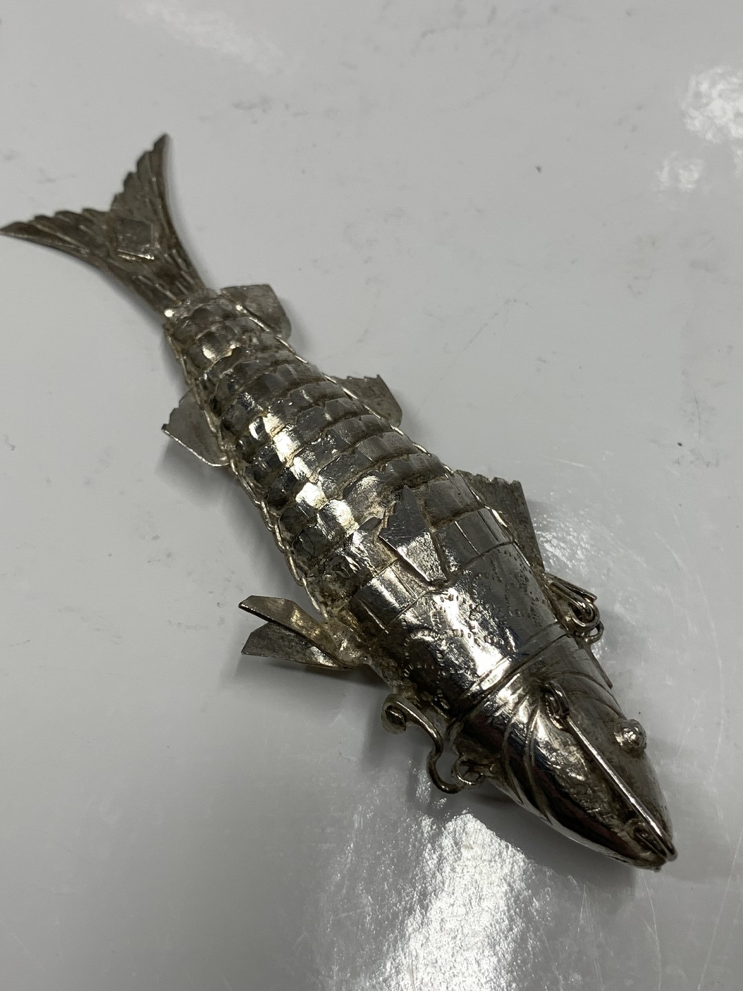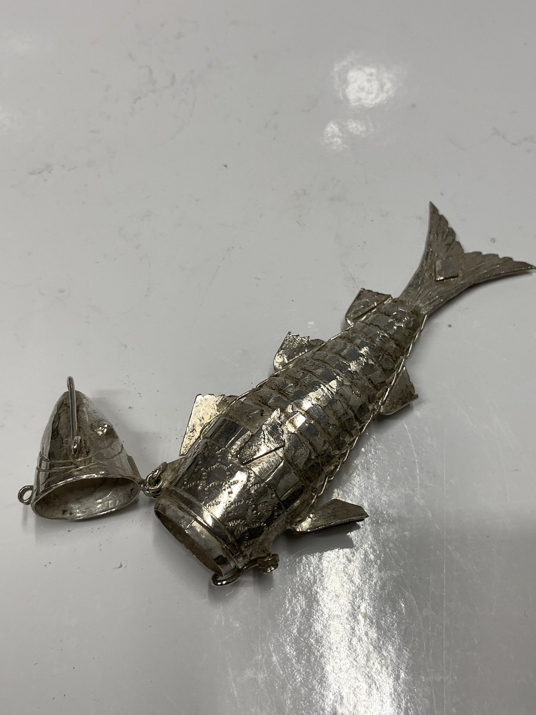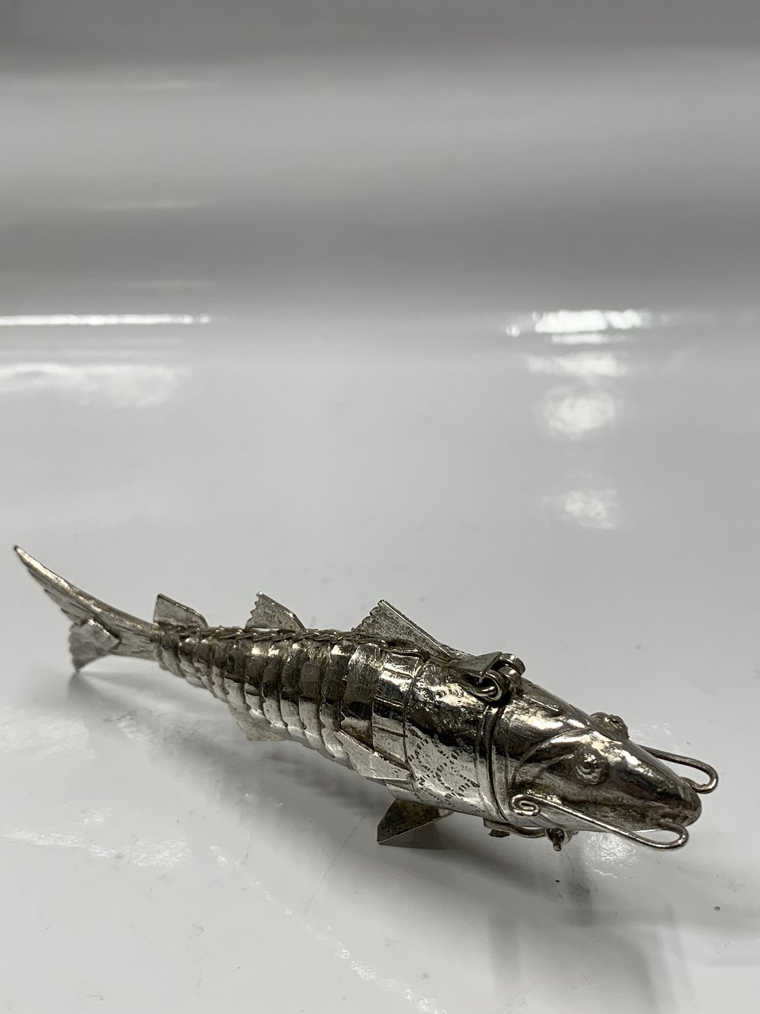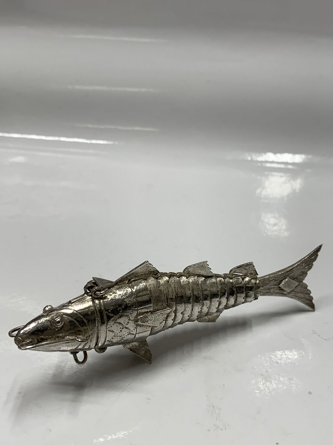 Beskrivelse: Sølv Hovedvandsæg i form af en fisk.
