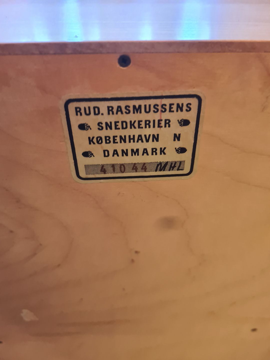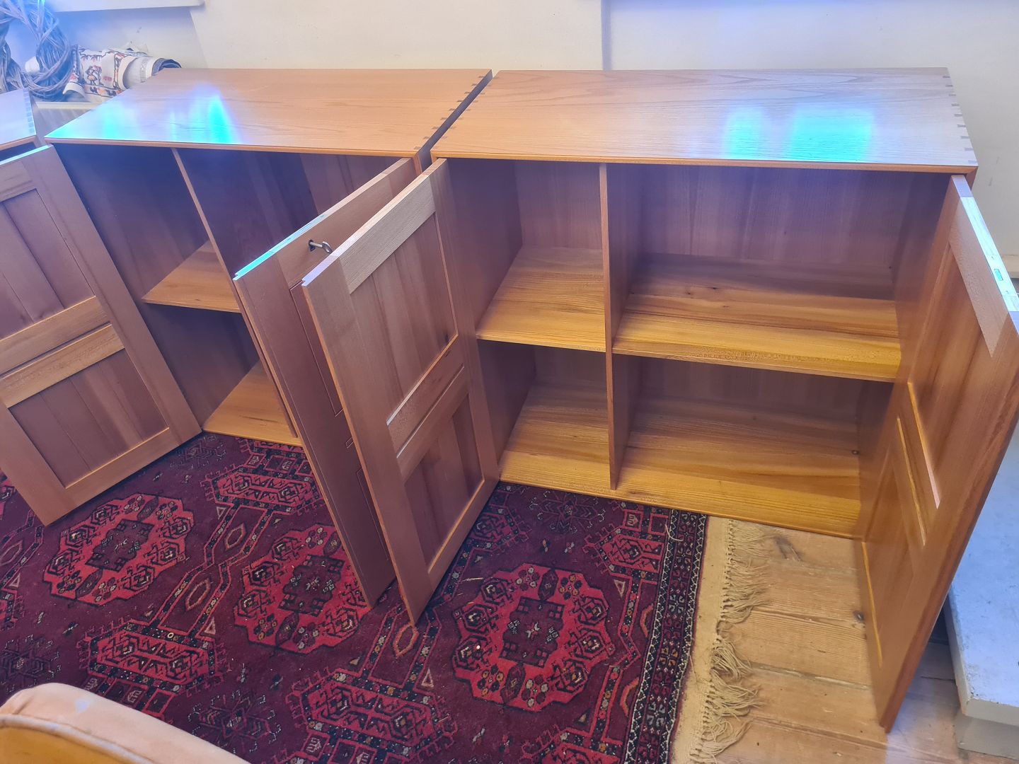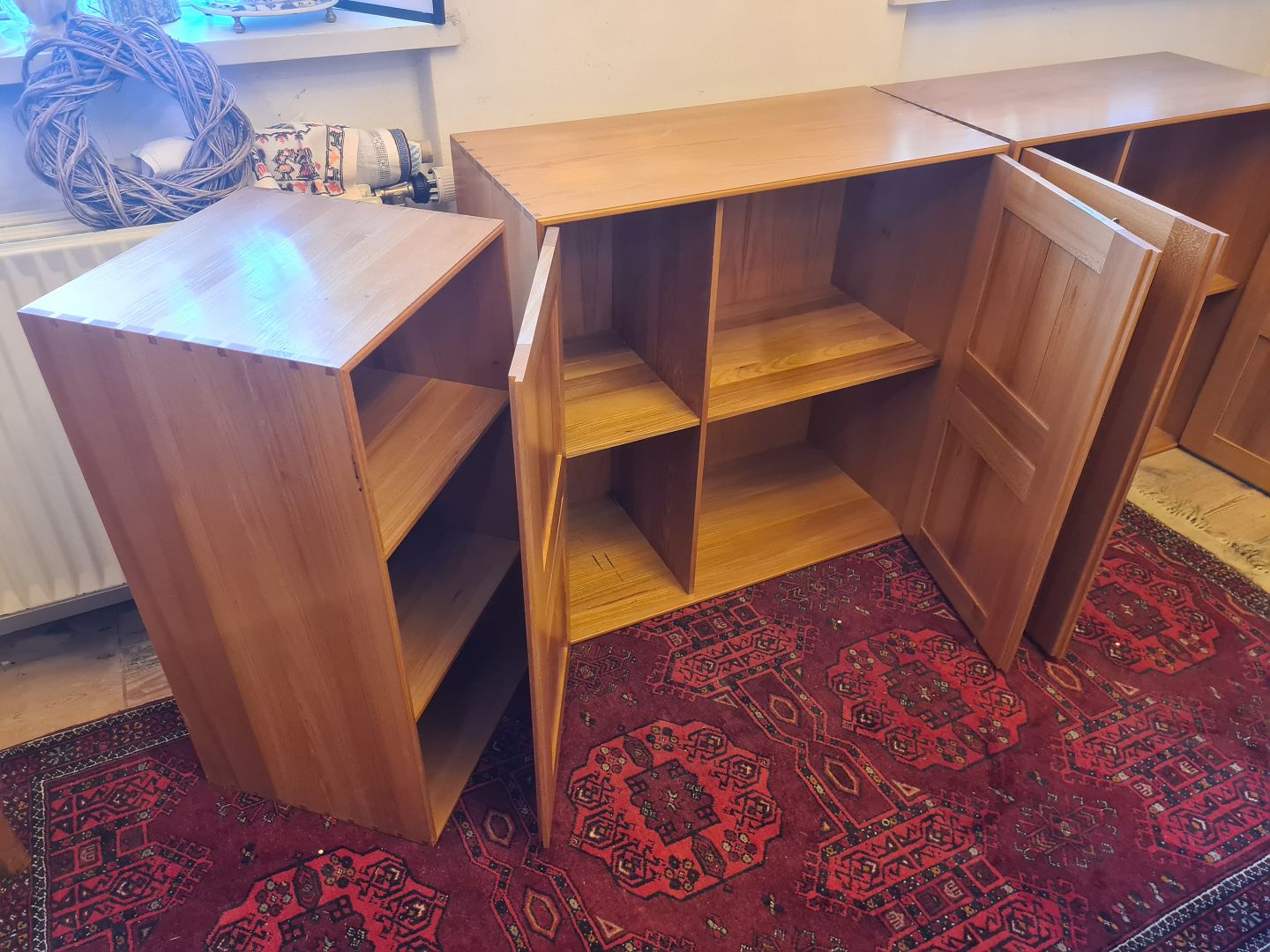 Beskrivelse: Mogens Koch skabe samt en halv reol udført i massiv Elm for Rud. Rasmussen. Fremstillet Ca. 1970’erne.